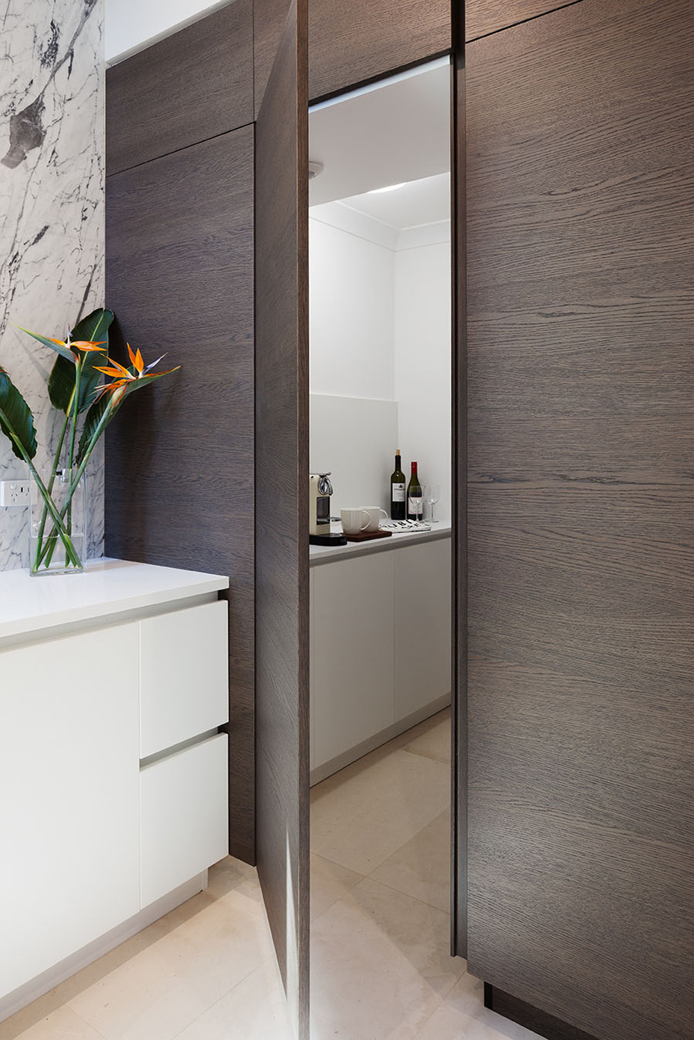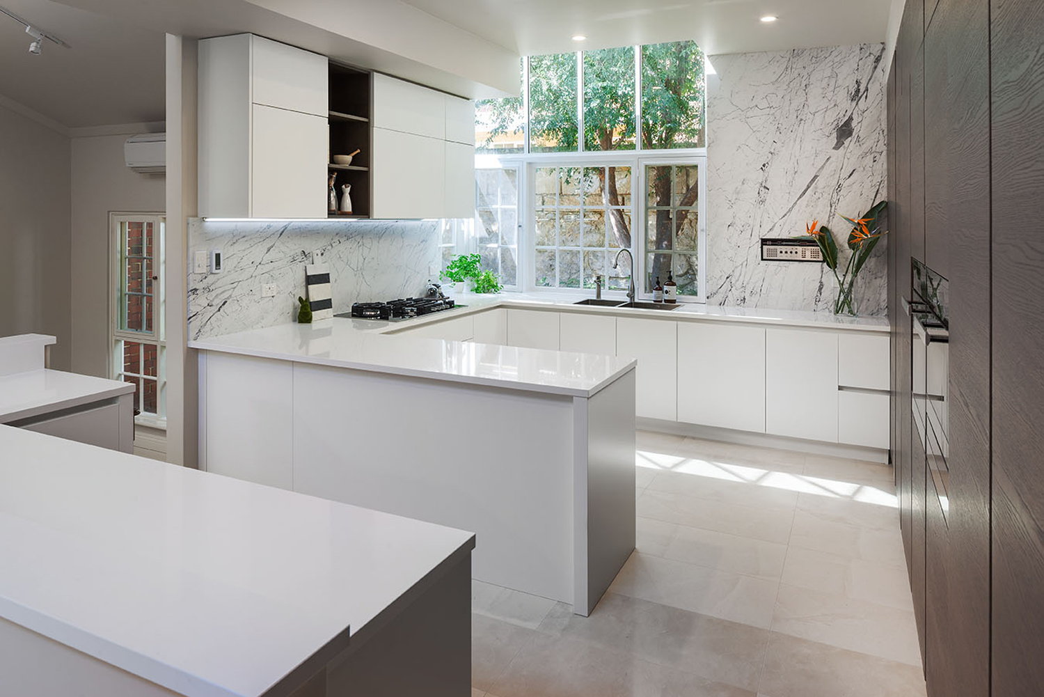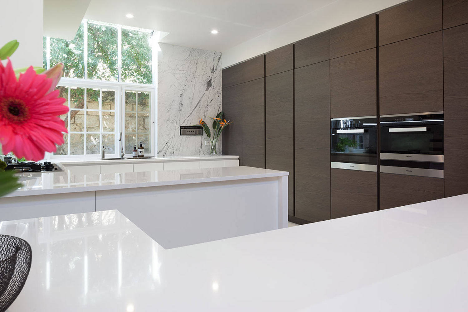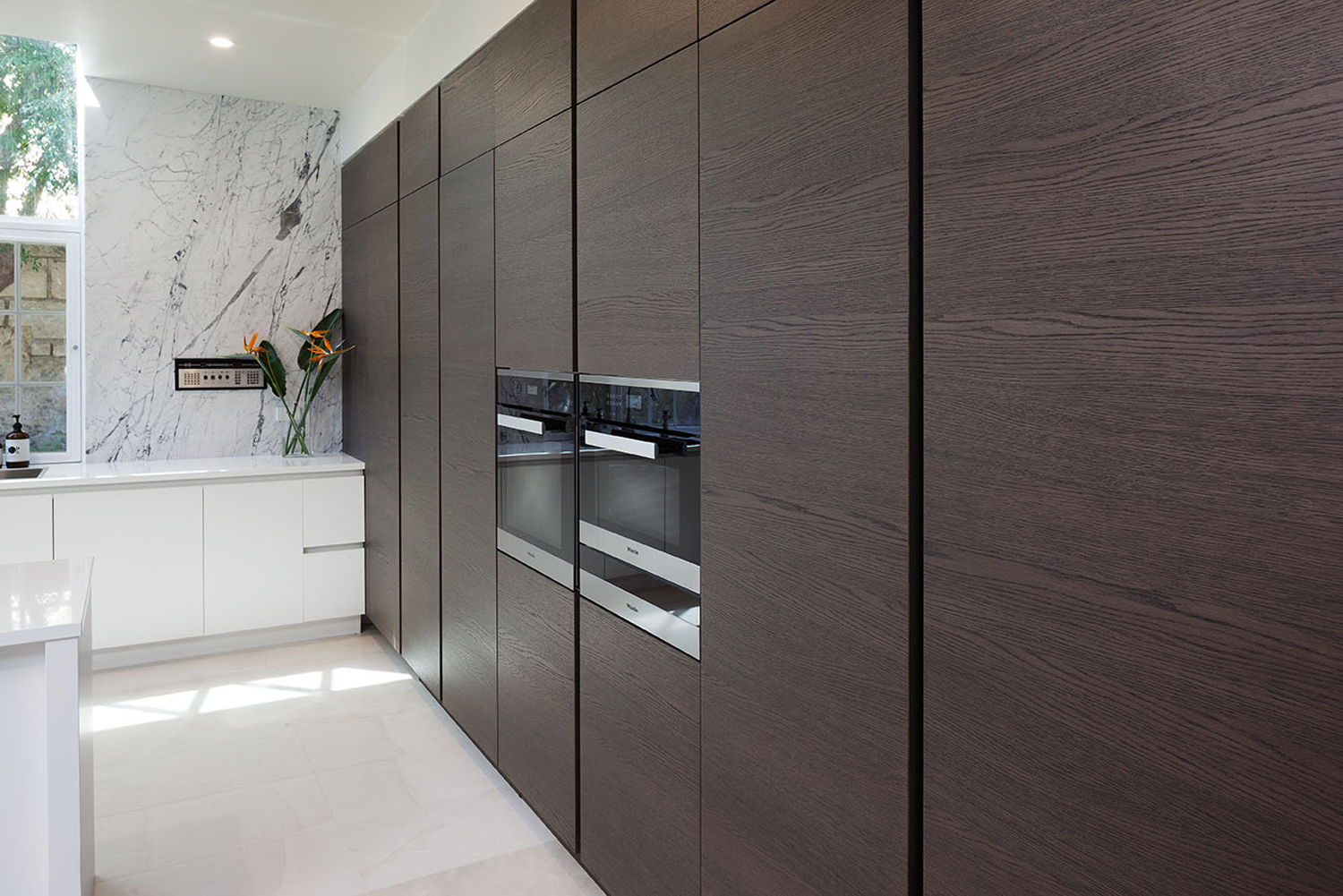 Creating a warm, modern feel is the use of both Berlin Oak and matte white Arrital cabinetry, paired with a dramatic Statuario Venato marble splash back.
