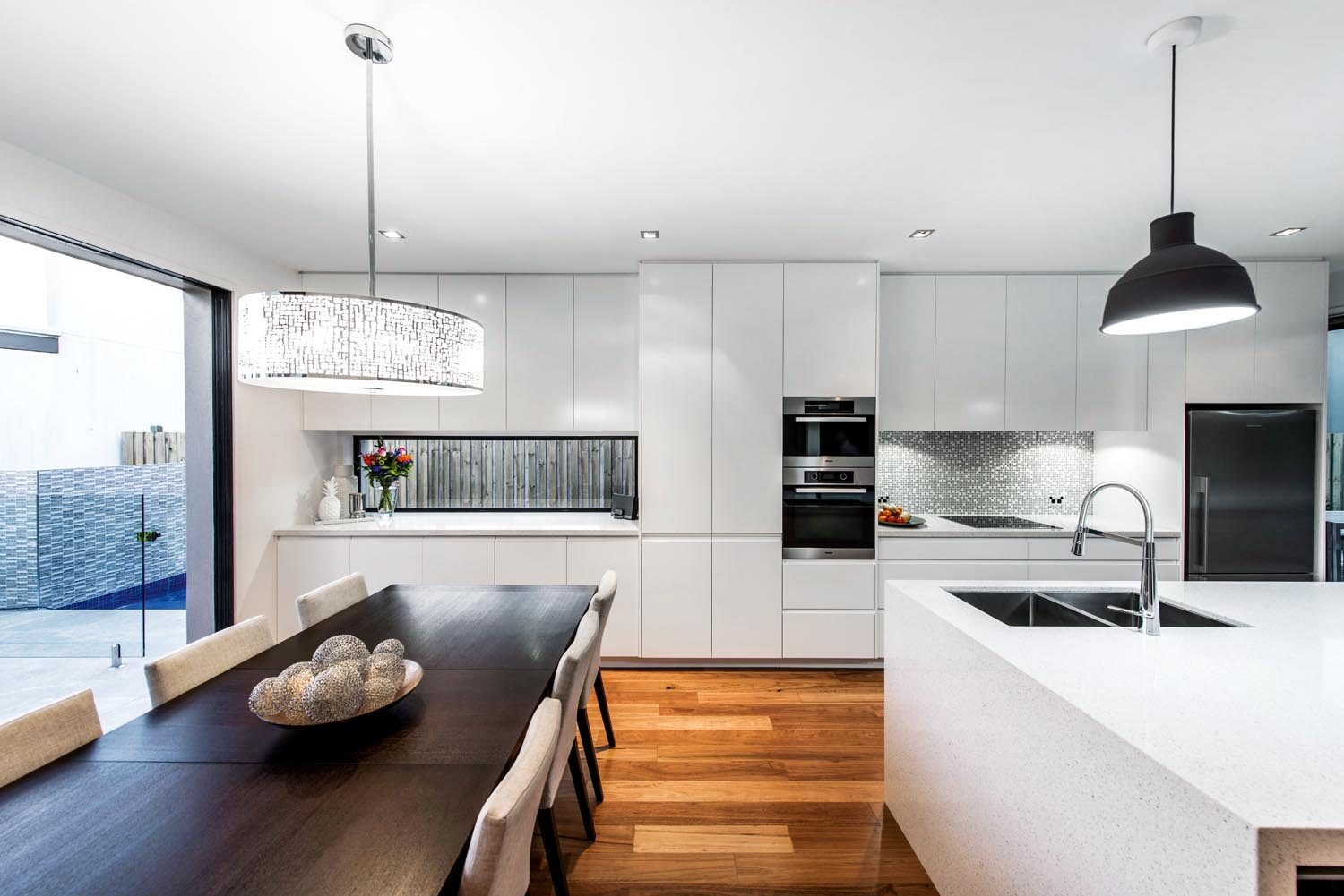 “Removing an entire wall and installing glass bi-fold doors was crucial to transforming a small, dark kitchen into a large, light and bright space that could accommodate a 3m x 1.5m island bench. The bi-folds open up the kitchen to the outdoor entertaining area and swimming pool. Much-needed light was also added with the glass splashback facing the dining table. The look is very modern and minimalist with clean lines, recessed handles, integrated appliances, plenty of hidden storage and a semi-gloss white finish.”