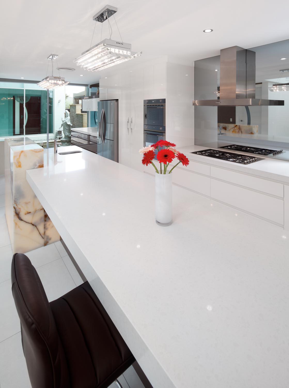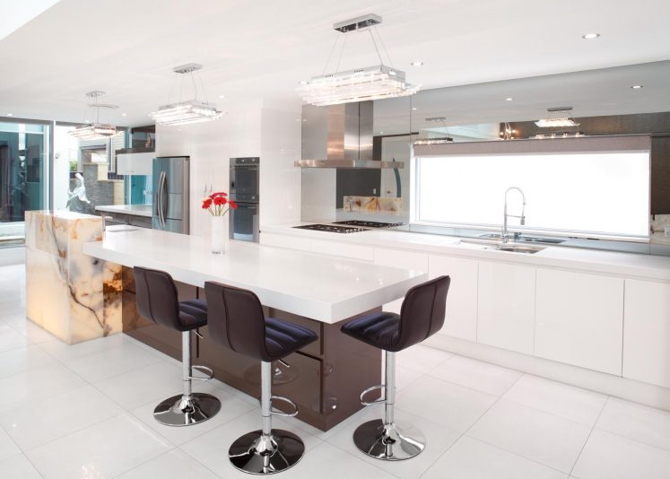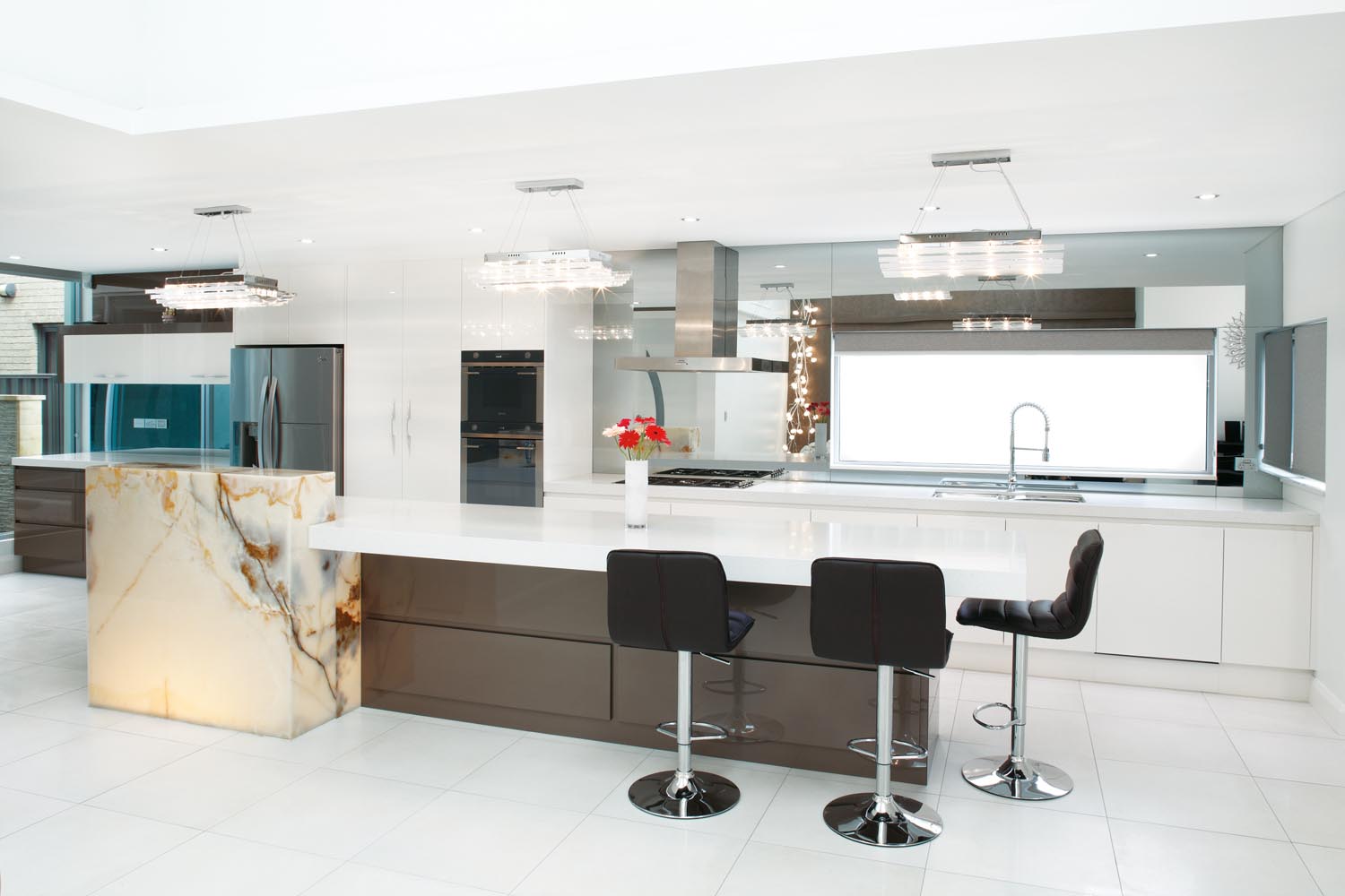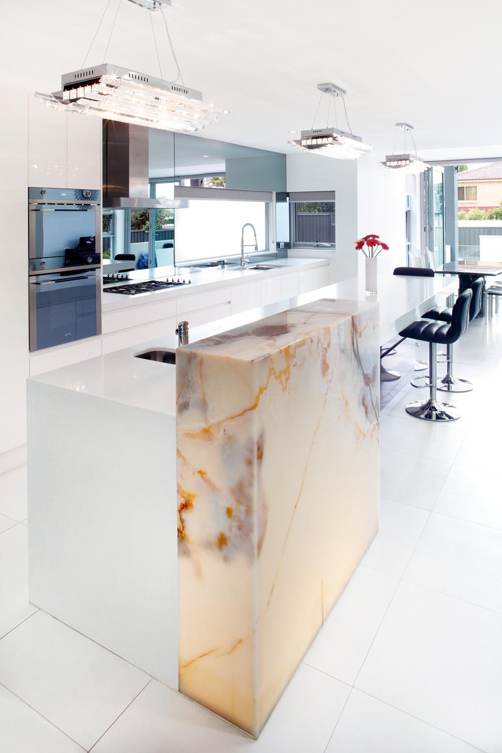 Standout features include the two-tone contrasting polyurethane panels, mirrored splashback and the island’s white onyx feature block, which illuminates at night.”