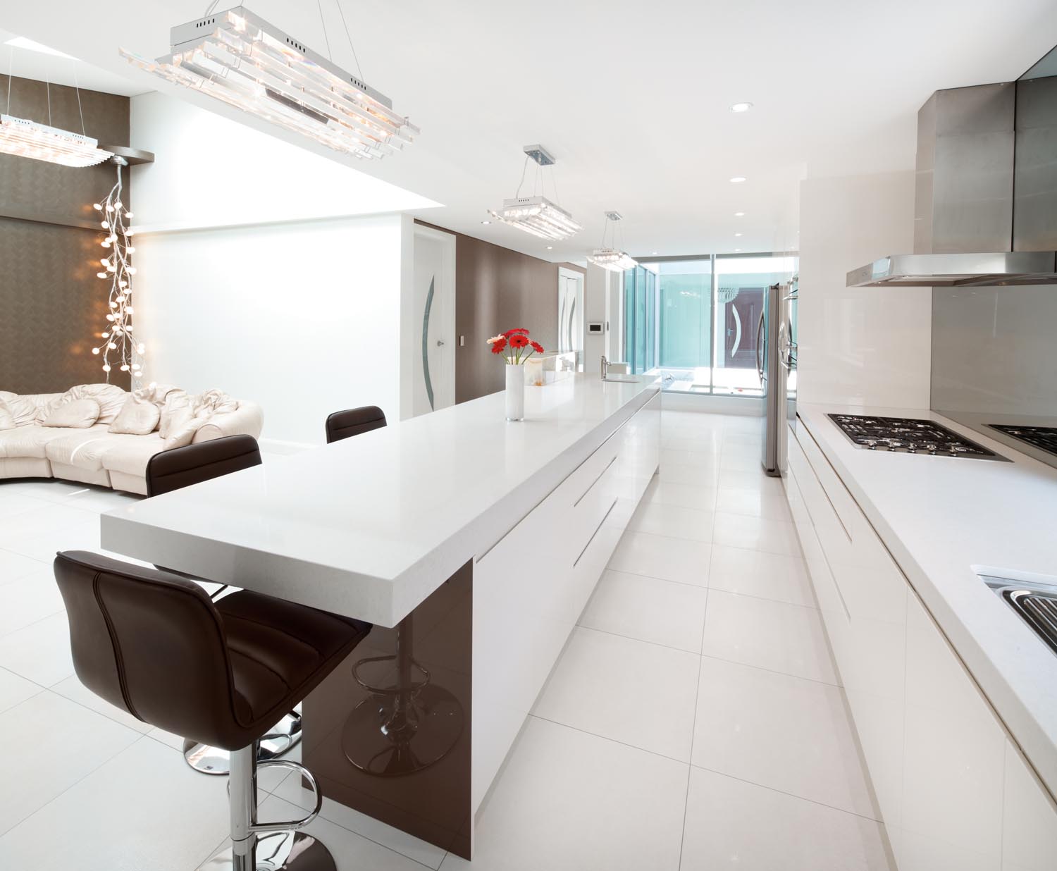 This open-plan kitchen employs clean lines, clutter-free benchtops and handle-less hideaway storage to mirror a magnificent modern design