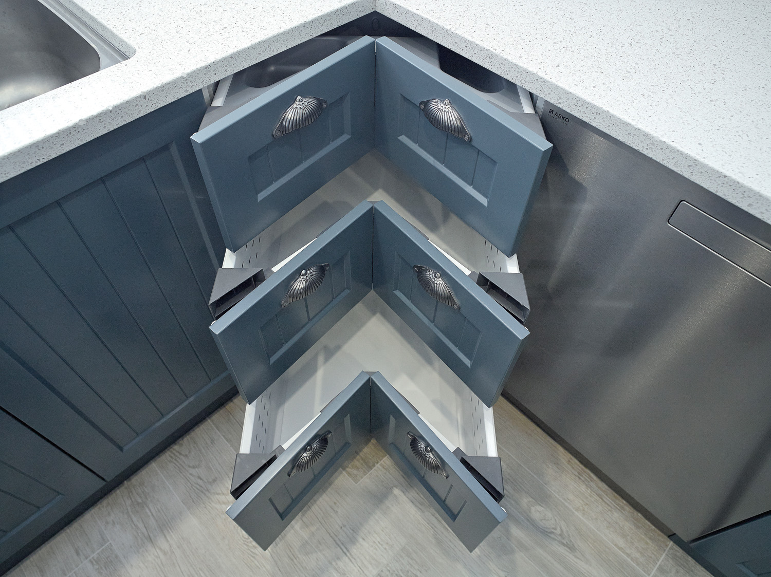 A dedicated coffee-making area was slotted in adjacent to the pantry. The tabletop adds an important social aspect to the kitchen, its curves enhancing the overall flow of the space and adding the final visual treat.”