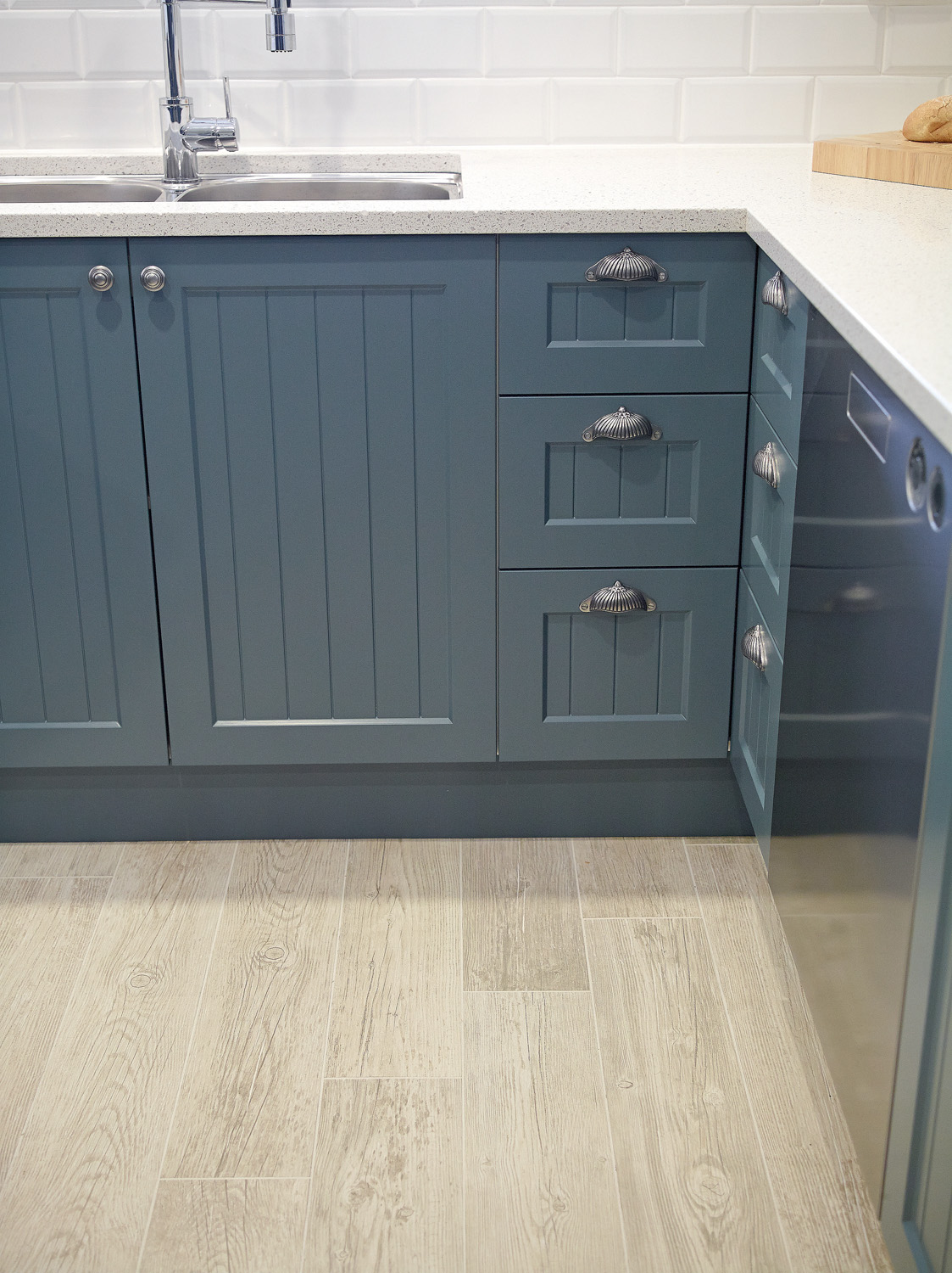 The whitewash timber-look floor tiles lift the room, offering a luminous, tactile realism in harmony with the bevelled subway tiles and Shaker-style cabinetry. LED downlights add to the radiance. Maximum storage was a must-have, so we selected a range of Blum products to utilise every nook and cranny: a corner drawer, Le Mans unit, two-tier pull-out for oils and spices, and pull-out tea towel and dishwasher drawer.