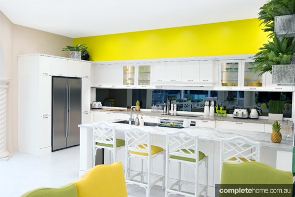 The choice of Shaker doors in White Matt paired with Caesartsone®’s new Clamshell (a beautiful soft fusion of light grey and white) and Laminex® 180º FX Carrera Marble provides a neutral yet sophisticated base which has been brightly accessorised in citrus hues through paints, fabrics and ornaments to achieve the glitzy, coastal look.