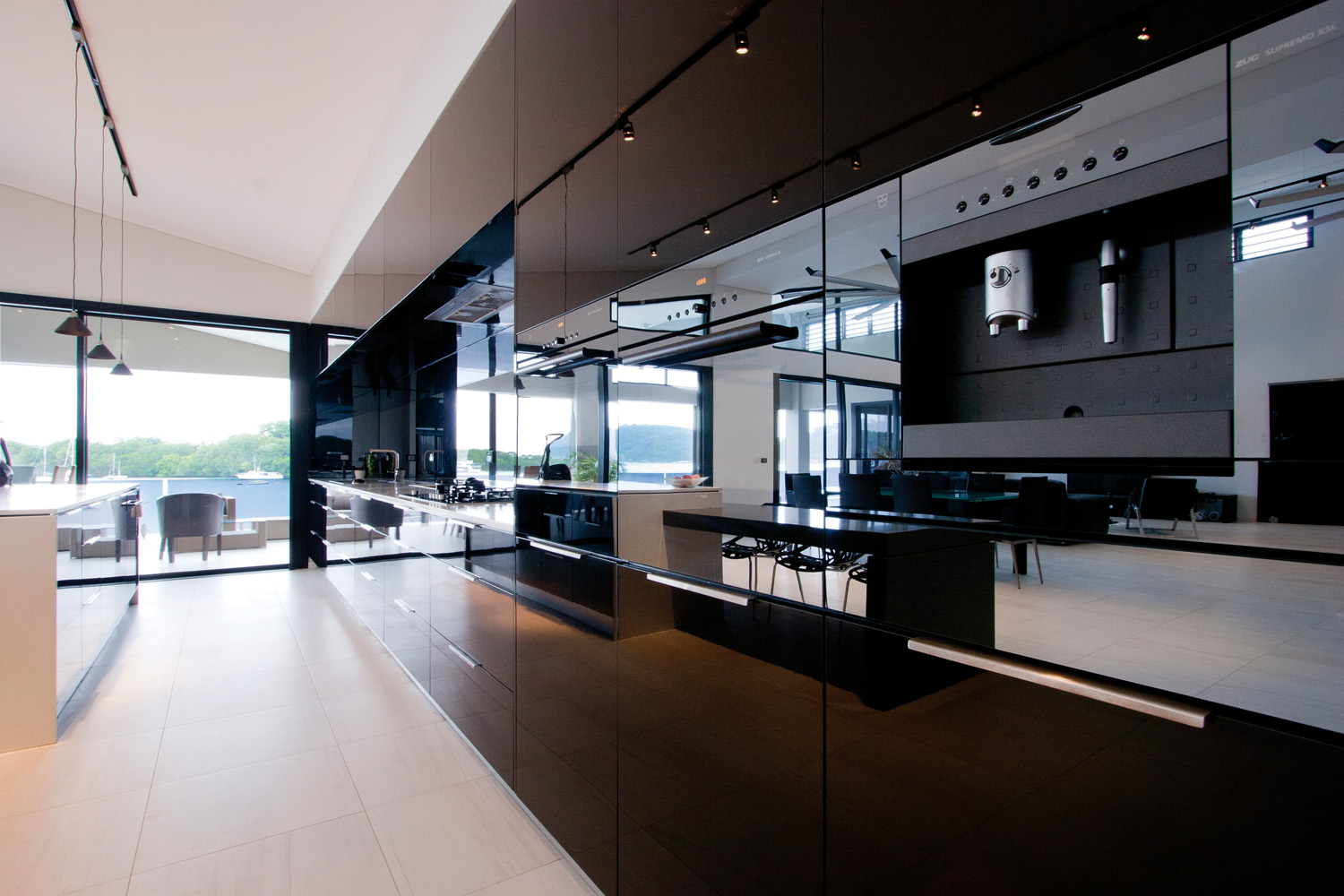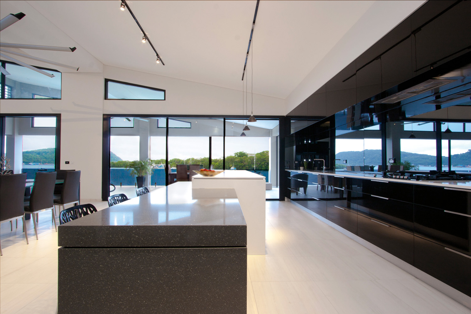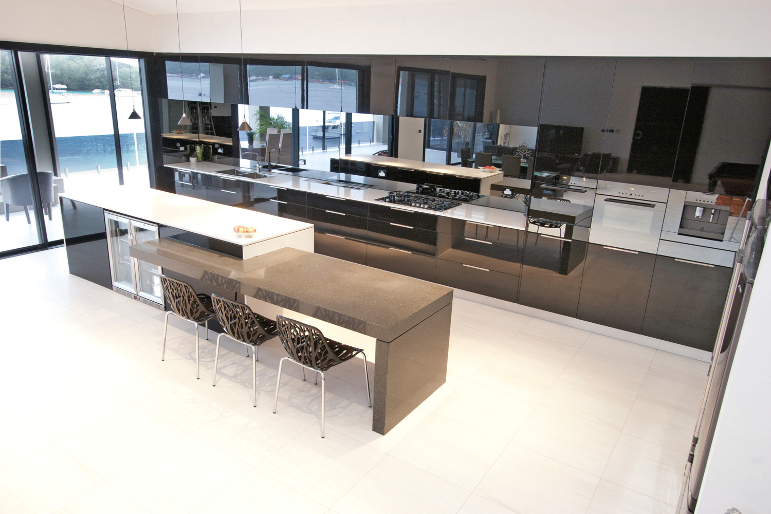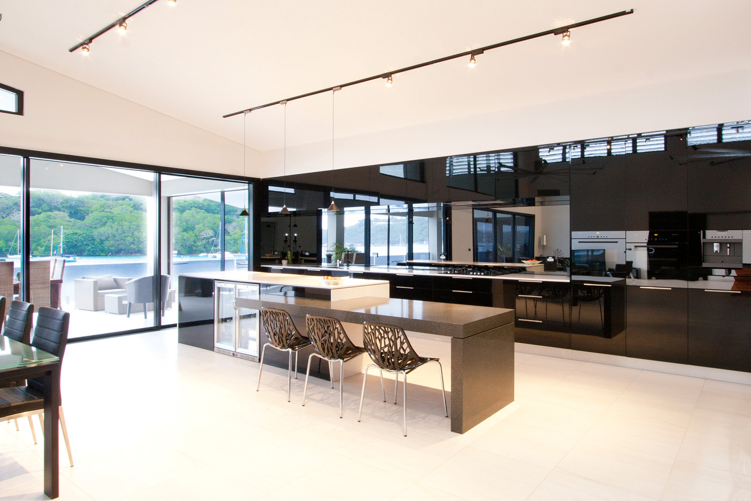 Incorporating minimalist design, luxury and intensity, this black gloss kitchen located in Vanuatu is of exceptional design