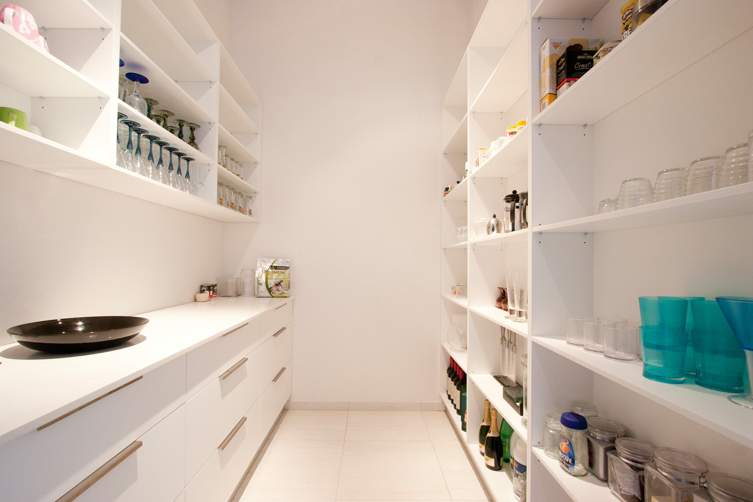 “Luxurious, glossy and minimalist, this kitchen opens on to an immense living and outdoor dining space, complete with a view over Port Villa Harbour. The owners wanted to take advantage of the enormous space and views, but we also needed to work with the high ceilings to ensure we put appliances and cabinets at the perfect height to satisfy both visual and practical design elements. The full wall of designer cabinetry is the showstopper. Stretching to the ceiling, the lustrous black gloss finish adds depth and intensity to the room. Hidden behind a sliding door, a spacious walk-in pantry provides shelves and drawers for storage, while a drop down seating area was custom-built using a hidden steel structure. Every integrated appliance, from the V-Zug oven through to the bar fridges and coffee machine, was chosen for its exceptional quality and design. Fastidious attention to detail like this is the key to creating a truly luxurious space.”