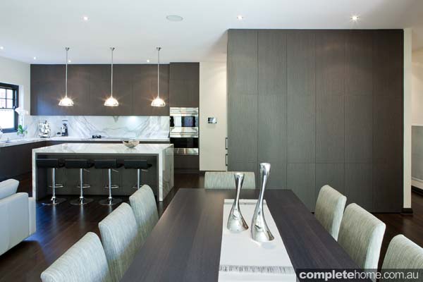“The homeowners entertain often and needed the kitchen to be functional and practical, but also make a statement. They wanted to keep a minimalist look as the kitchen was located in the modern back extension of this period-style home. With two young children, storage was also an important request. One of the kitchen’s main features is the floor-to-ceiling “block” cabinets with push-to-open fittings, internal drawers and two fully integrated Liebherr fridges. The cabinets also act as a wall divider with the powder room on the other side fully concealed from the family dining areas. The Calacatta marble benchtops and splashbacks are another dominant feature. With both the flooring and walls being quite dark, we needed something to “open” the space up. Marble selection was a huge challenge as it took months to source the right slabs that had the length and clean patterns through them to create the matching and butterfly effect on the island bench and splashbacks. The space below the stairs, adjacent to the kitchen, was another challenge — we converted this into a very user-friendly butler’s pantry complete with sink, second microwave and wine fridge. The colour palette and feel of the kitchen work well in this architect-designed space.”