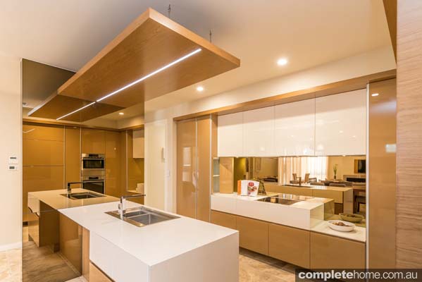 “Initially the kitchen was within an enclosed area; a wall separated it from the hallway and the bedroom, creating a narrow passage from the front door. We replaced this long dividing wall with a mirrored section that provides privacy while completely opening up the space. When it came to colour, the caramel tones blend perfectly with both the timber and the bronzed mirrors, with a light touch provided by the porcelain textured floor tiles. Other key features include sharknose detailing, feature LED lighting, full-height stainless steel handles, and the creative use of multiple levels for cabinetry, which includes a set-down grocery area adjacent to the corner pantry. The design of the kitchen allows for multiple access zones from the entertaining space and provides artistic focal points from every perspective. It’s a kitchen that exceeded the clients’ imagination, but not their investment. In 2014 the kitchen design was awarded KBDi Large Kitchen Design of the Year (SA), attributed to Angela Gianakis, who was also highly commended 2014 KBDi National Kitchen Designer of the Year.”