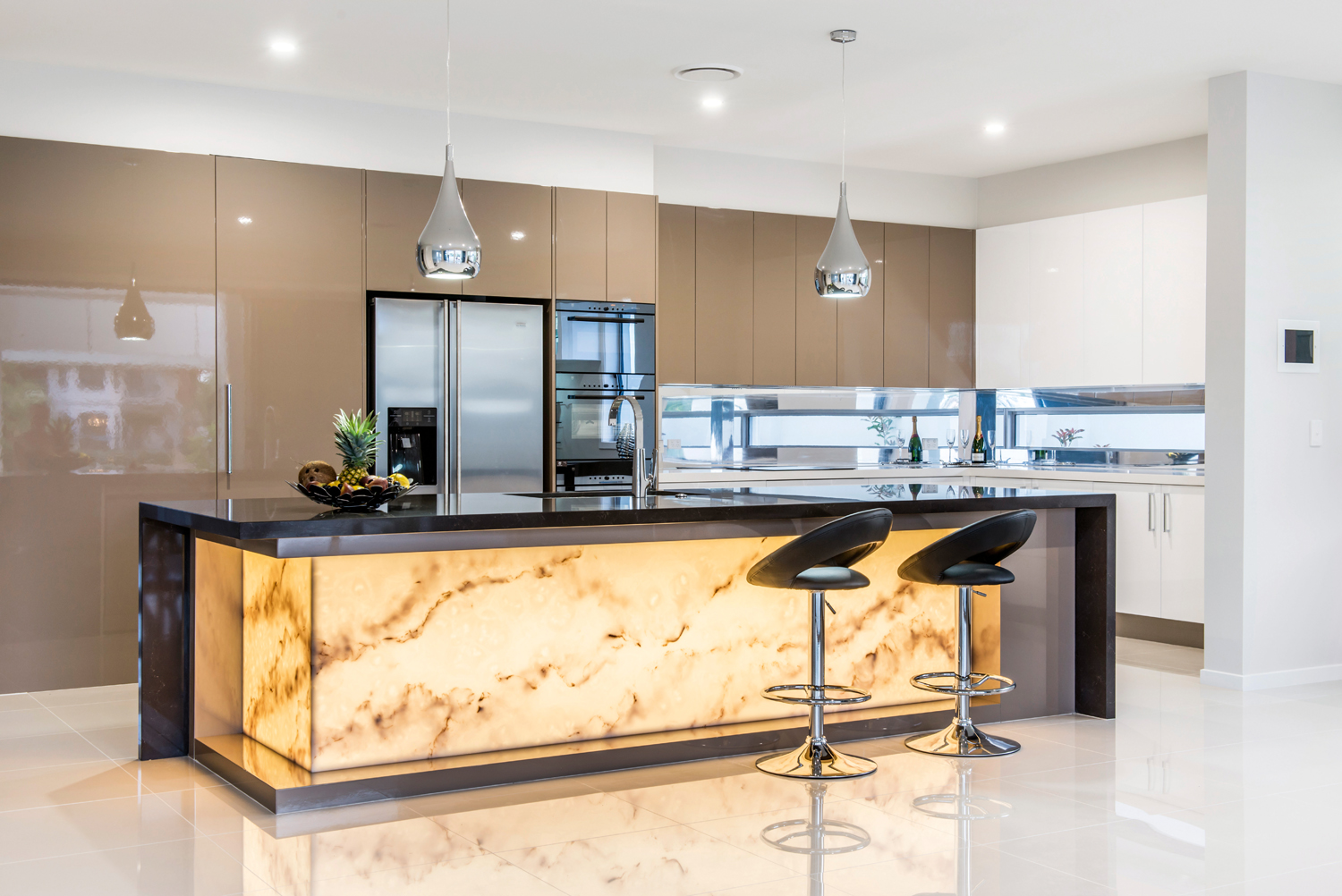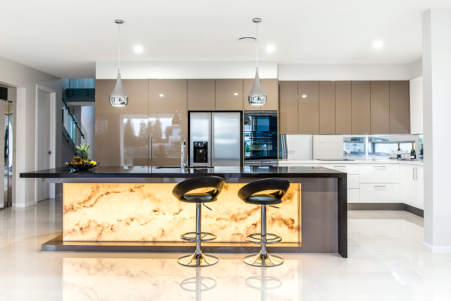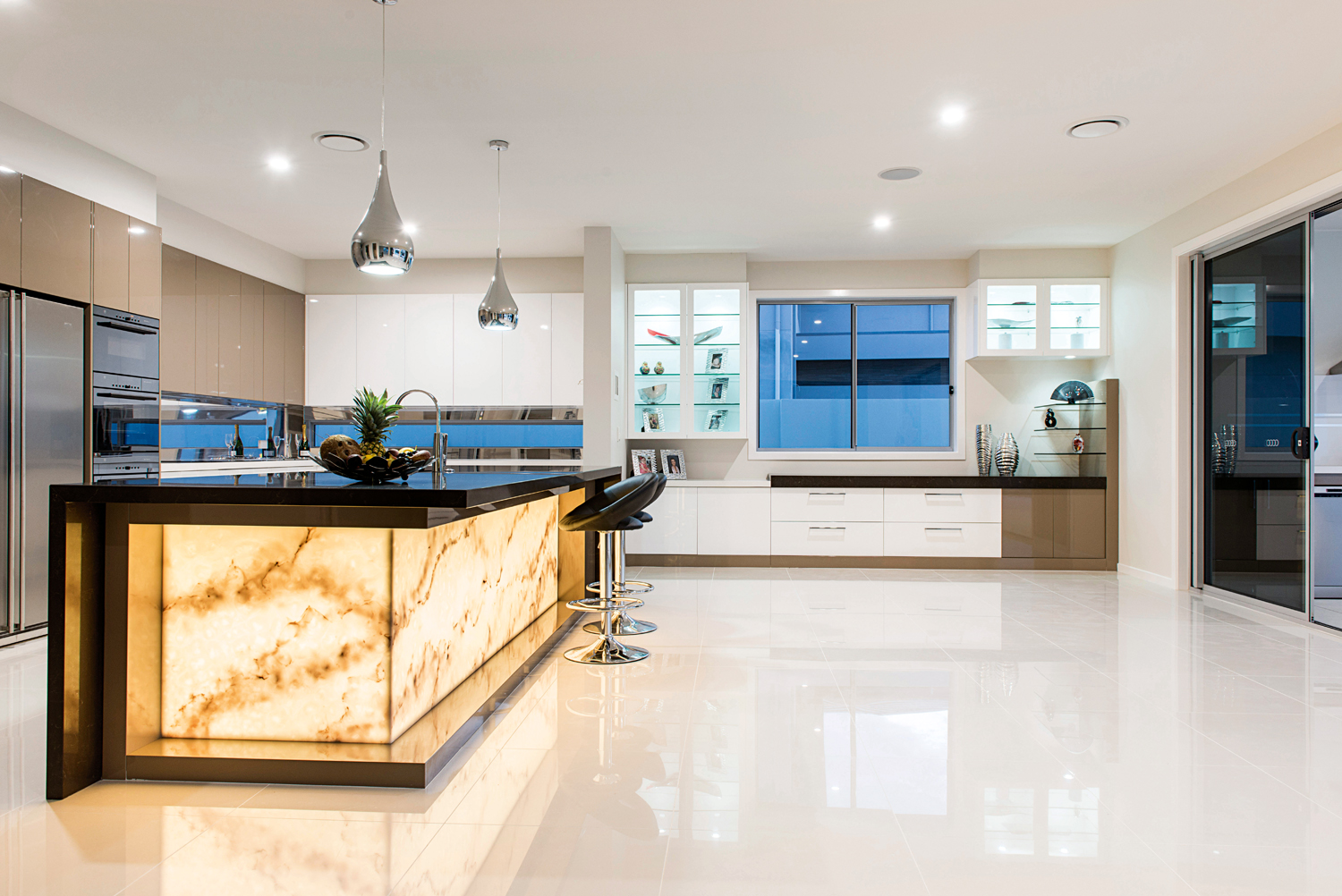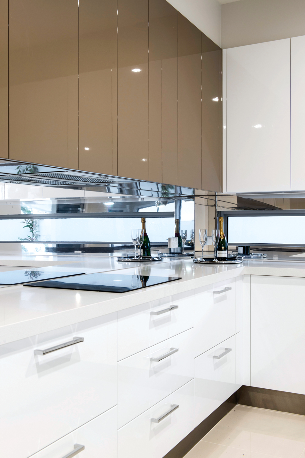 “The brief from the owners asked for an inviting, modern kitchen with an amazing island bench, which we have definitely achieved. The kitchen uses a mix of colours and hues, including whites, browns and light oranges, to create a warm, neutral palette.
