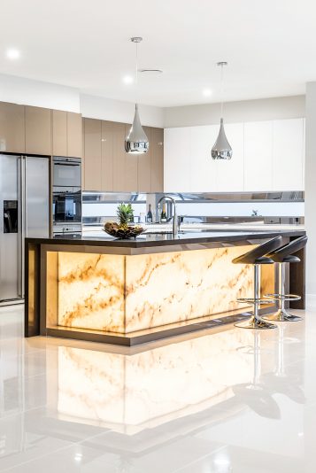 The backlit marble of the bench packs a punch and is a dramatic, interesting design element. The kitchen also features a walk-in pantry that is concealed through custom joinery, creating a sleek and clean design. Designed for high functionality and practical use, extensive cabinetry and soft-close drawers and doors provide plenty of storage and longevity.