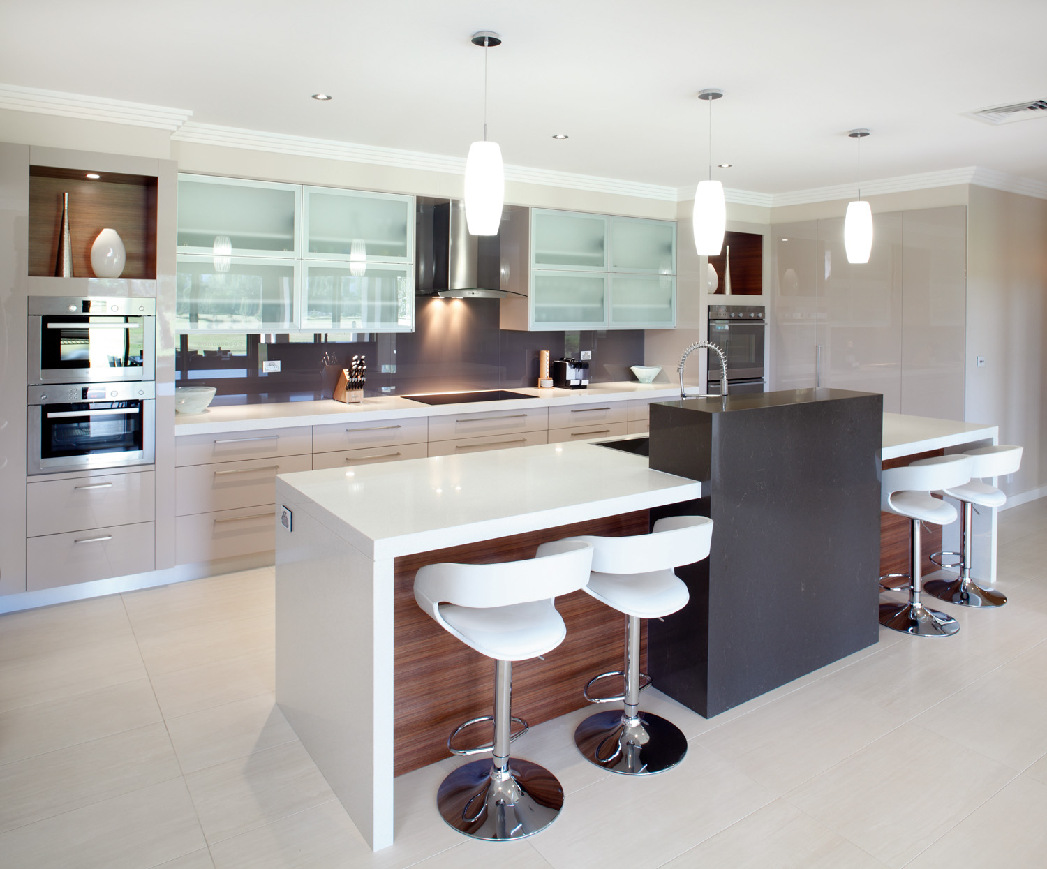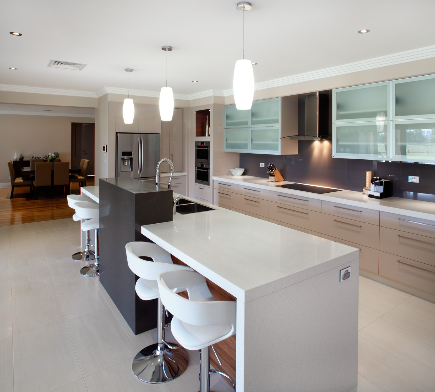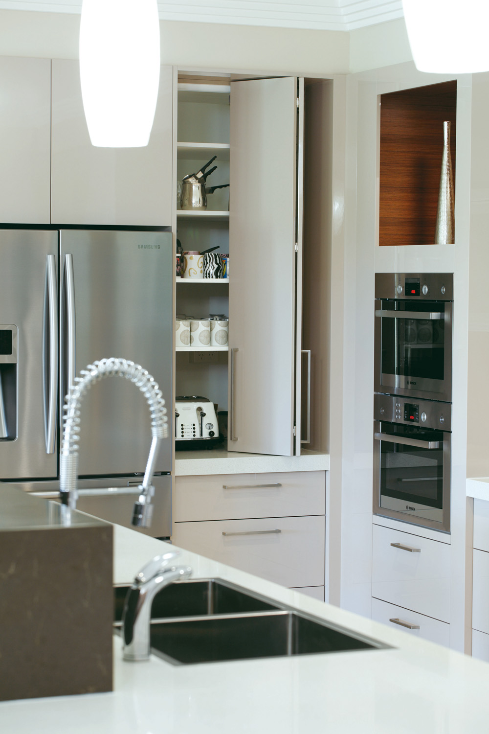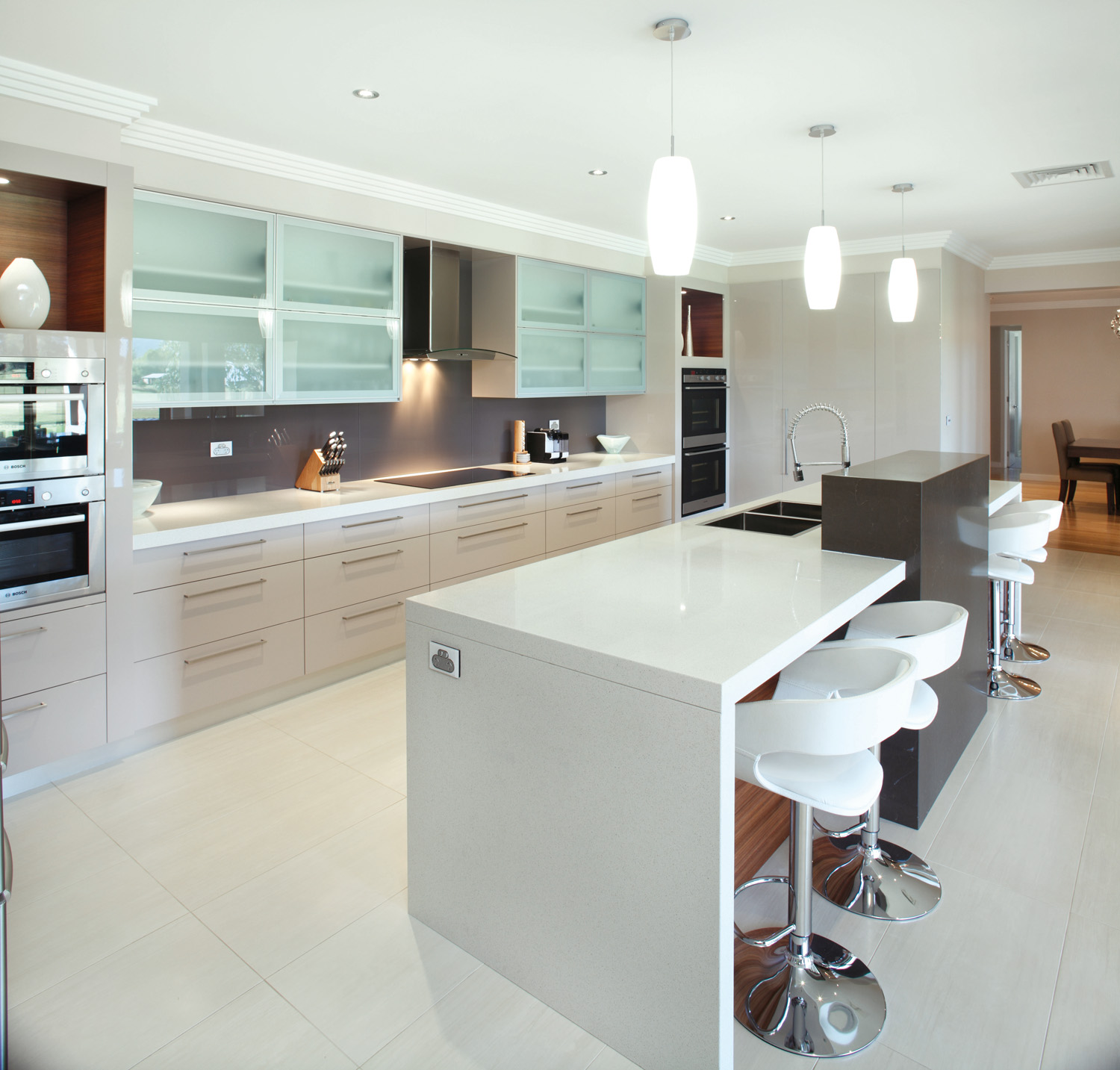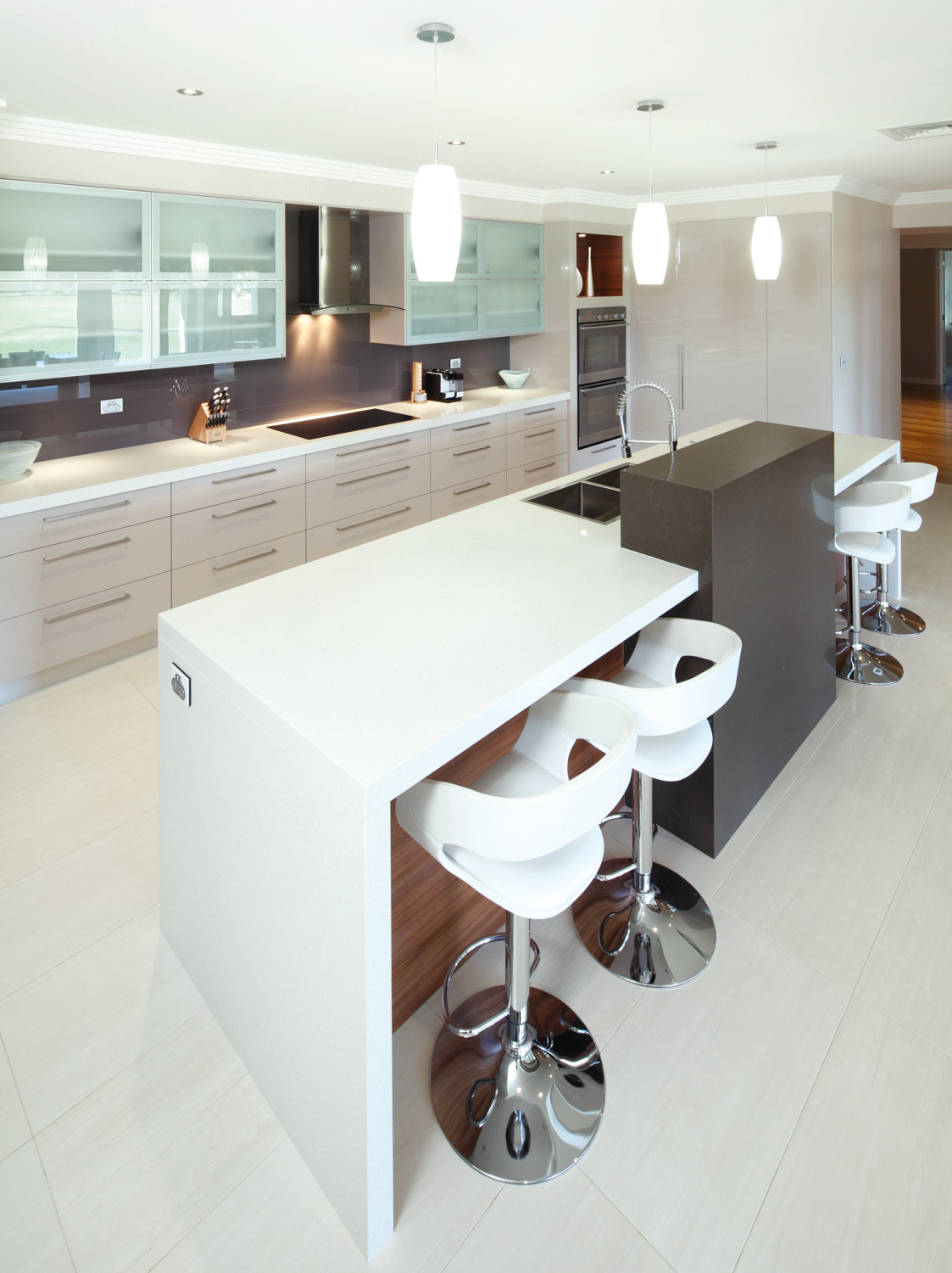 “Assorted surfaces and earthy tones create an inviting, contemporary kitchen area which works in both function and form. The desire for lustrous finishes has been indulged with reflective polyurethane surfaces and Quantum Quartz benchtops.