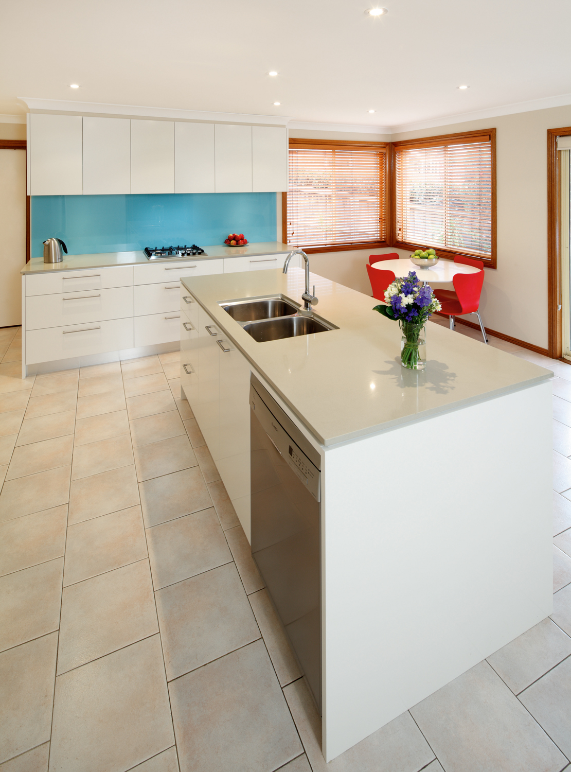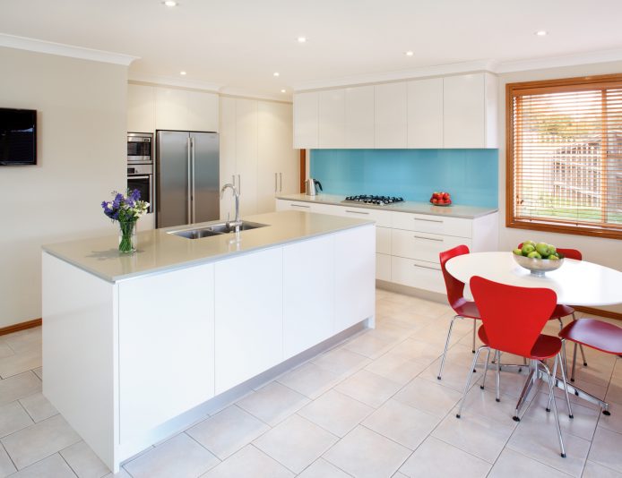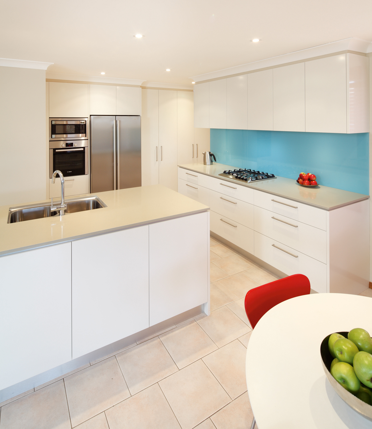 The owner had lived in this home since it was built 18 years ago and wanted a contemporary design to replace the dated timber kitchen. So we decided to open up the space and introduce an island bench. However the greatest challenge was to work within the existing structure — the house was built on a concrete slab, which meant that the plumbing and electrical conduits to the island bench had to be chased into the floor. The kitchen is now a large and functional area with an abundance of storage. We employed a clean-lined aesthetic and bright finishes to blend with the existing features of the house, as well as adding a burst of colour to the glass splashbackand new stainless-steel appliances and fittings.”