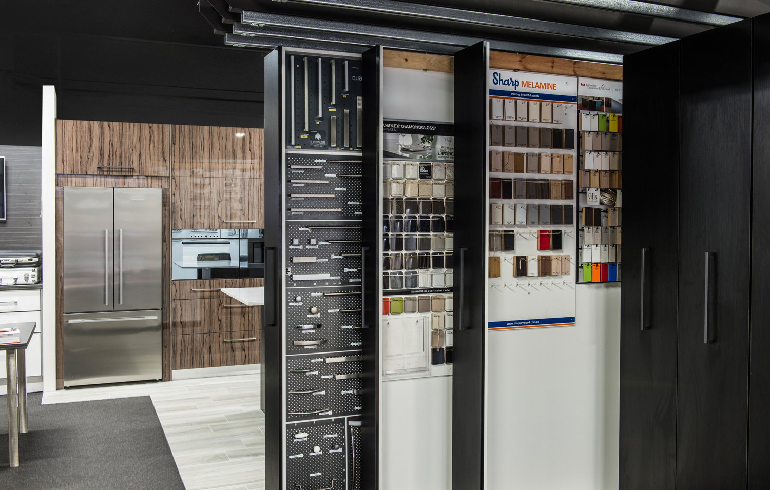 The showroom visualizer consists of eight large pull out doors that showcase different finishes and samples from a range of different suppliers, allowing visitors to meet their needs, experiment with different styles and visualize the final product.