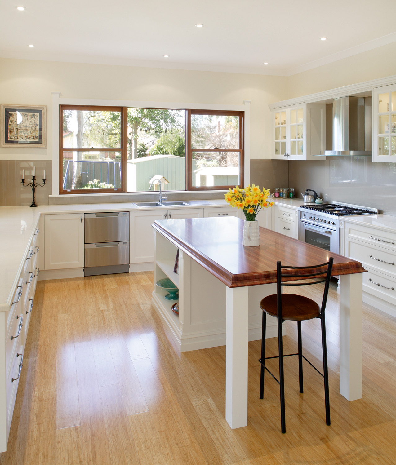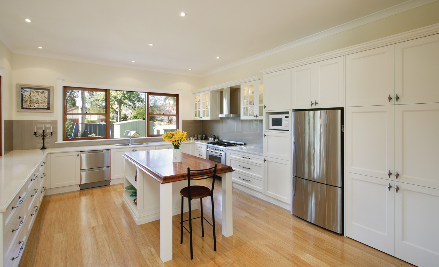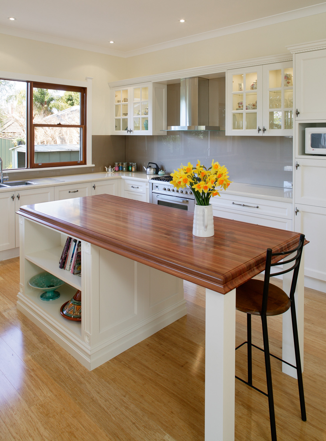 When renovating their kitchen, owners devised a brief for a Federation/modern-style kitchen to blend into the rest of their house. It had to be an entertainer-style kitchen, feature plenty of storage and be a place to have kids around doing homework while preparing meals. The result is a light-filled French provincial-style kitchen with a selection of modern elements.