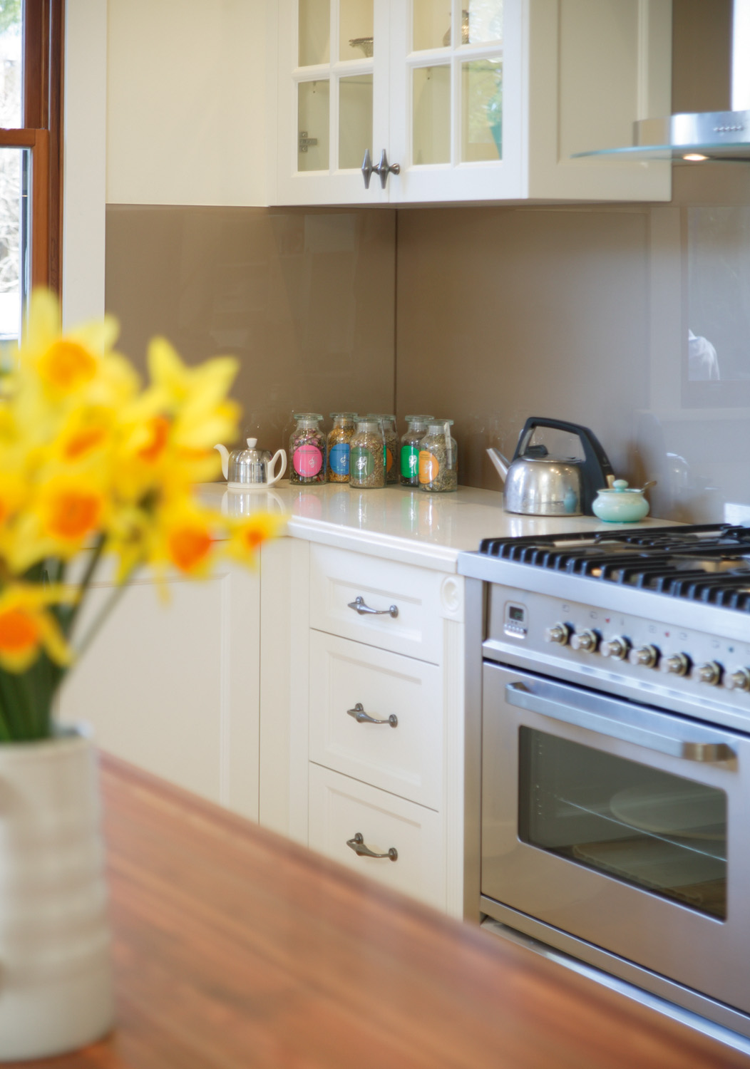 Designer Andrew Dee from Wonderful Kitchens designed the kitchen benchtop to run under the bi-fold window and it protrudes into the outside entertaining area, creating a servery/counter bench, which is essential when visitors drop by.
