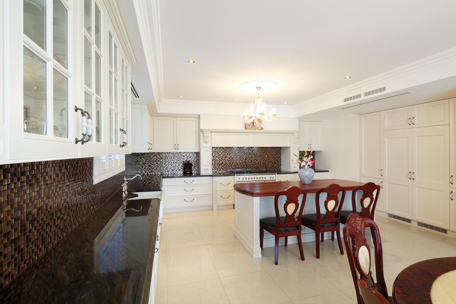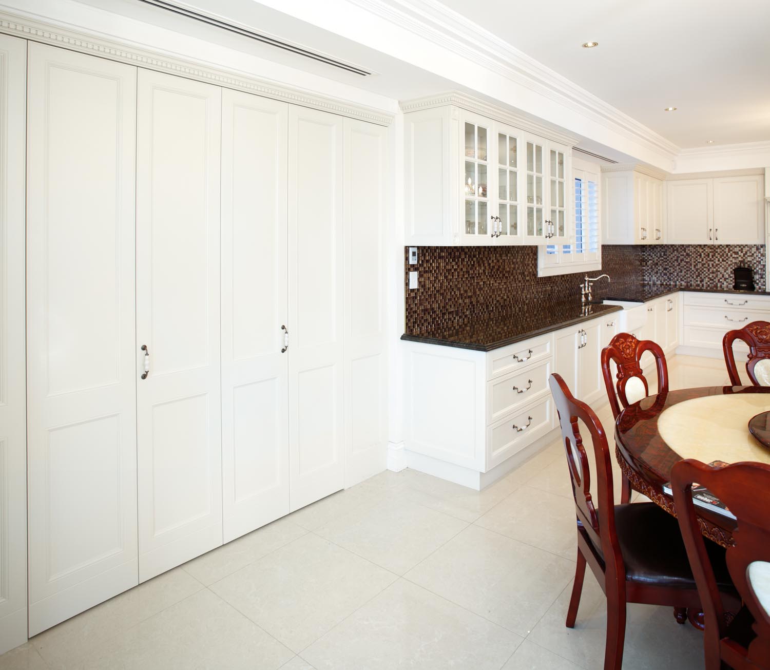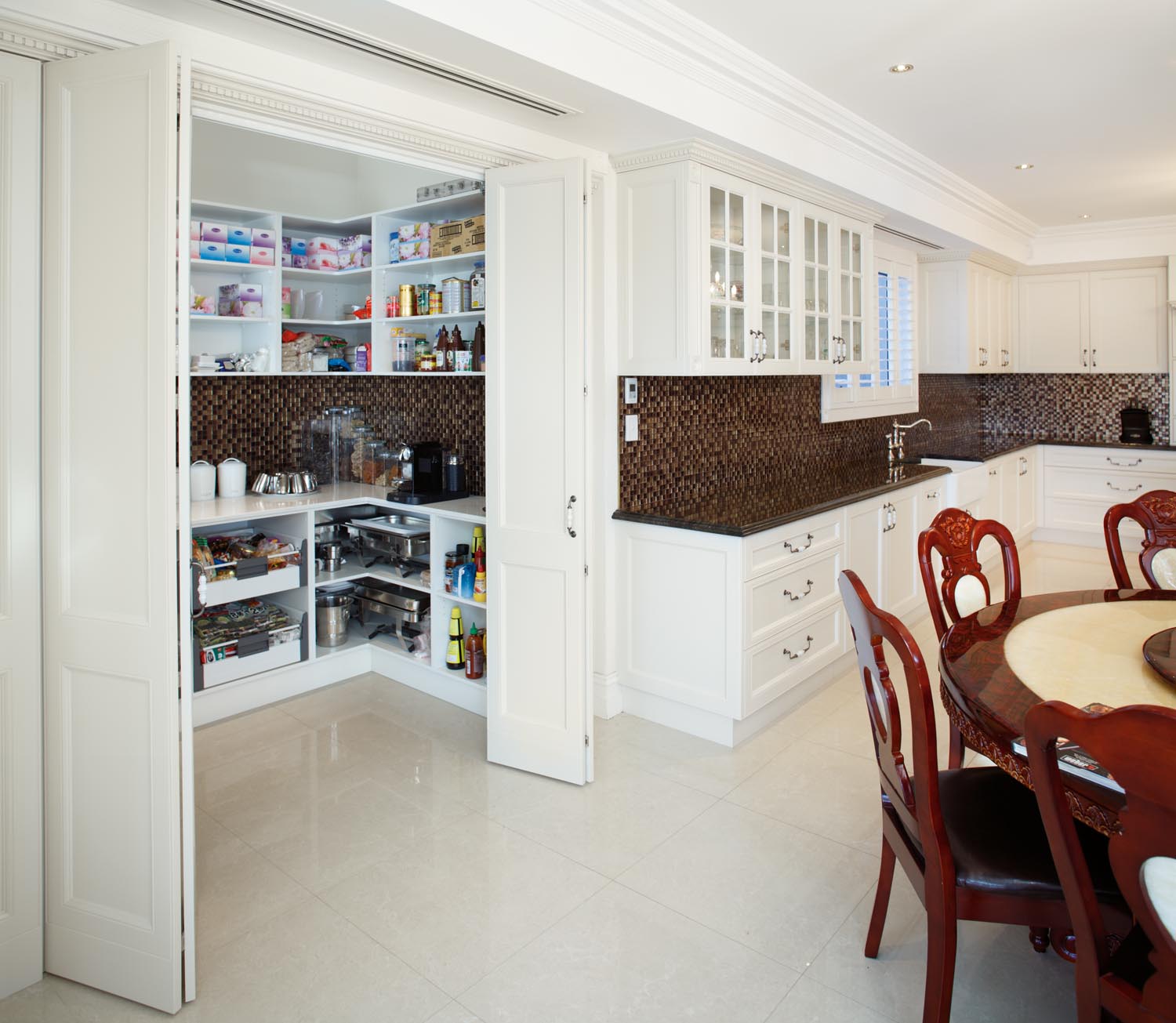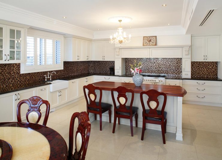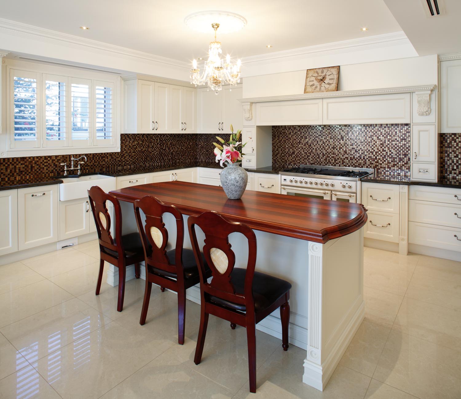 “Functionality and personal touches reign supreme in this Bankstown, Sydney, kitchen. The owners requested a provincial style balanced with modern functional elements and plenty of storage. The classic white cabinetry and tiled floor form a