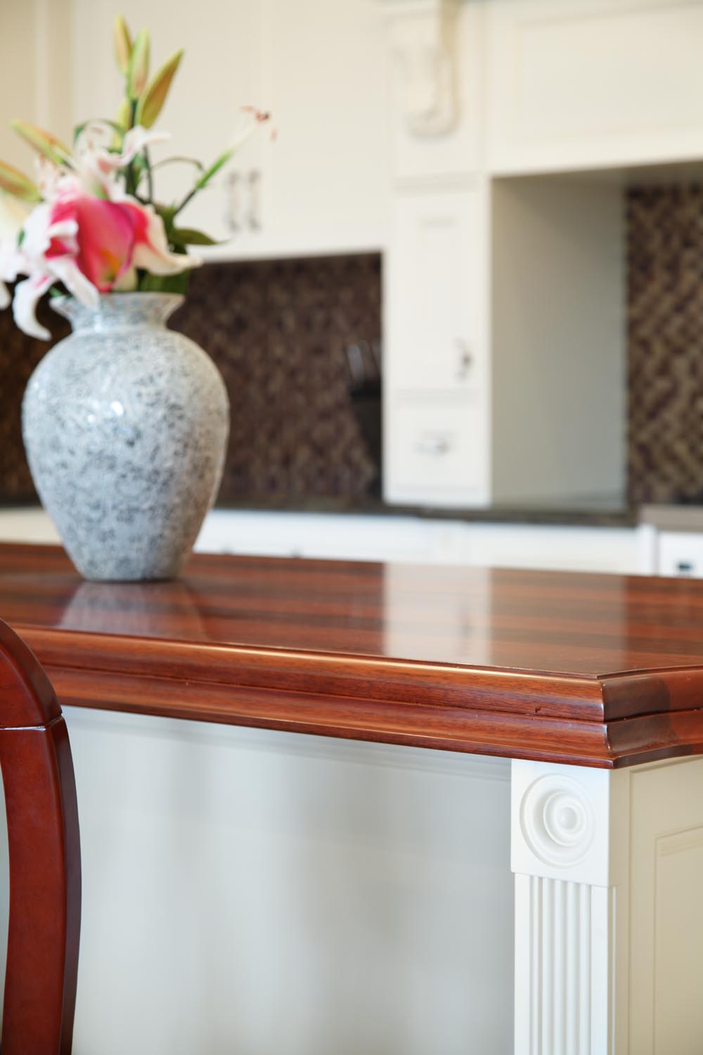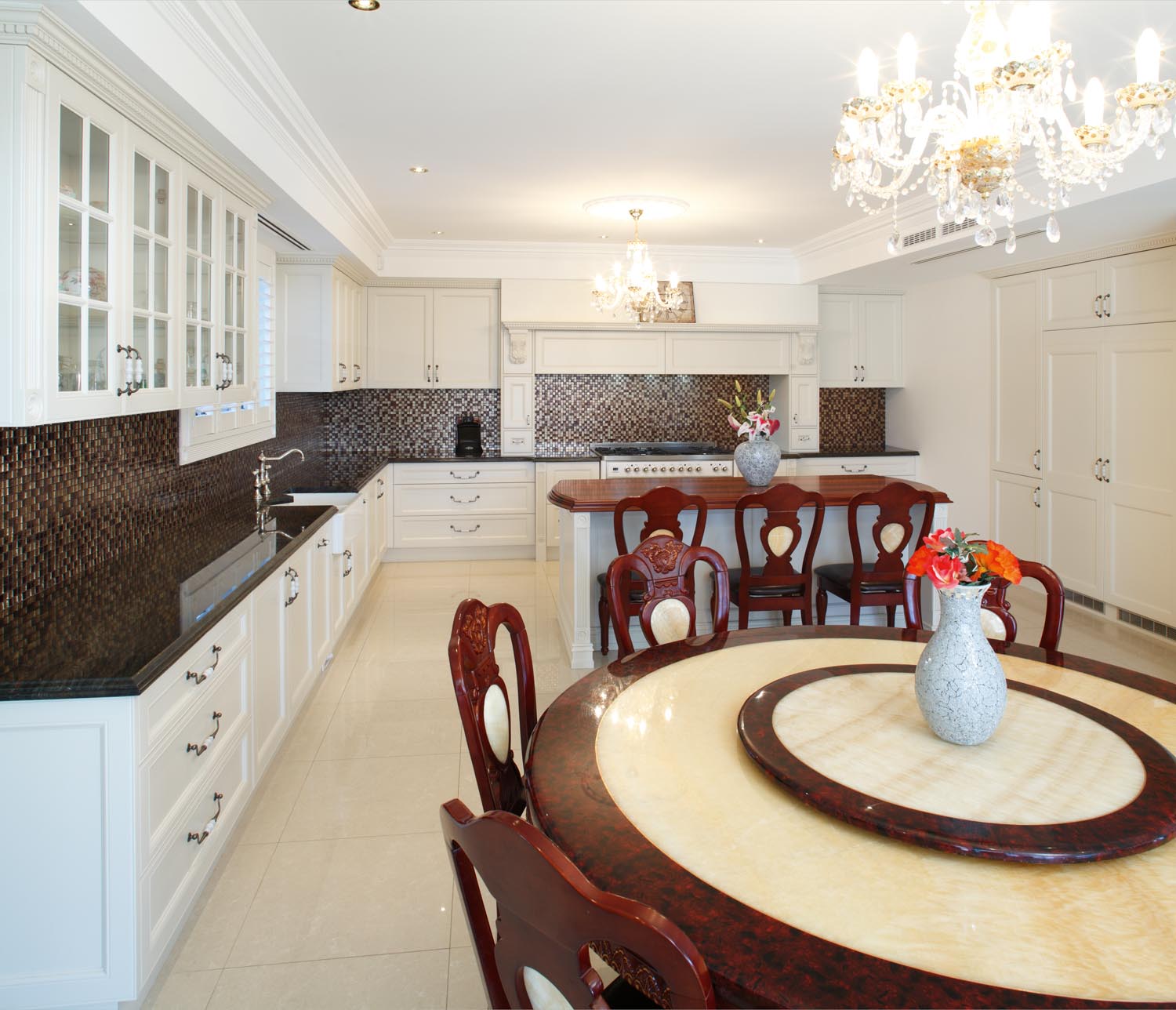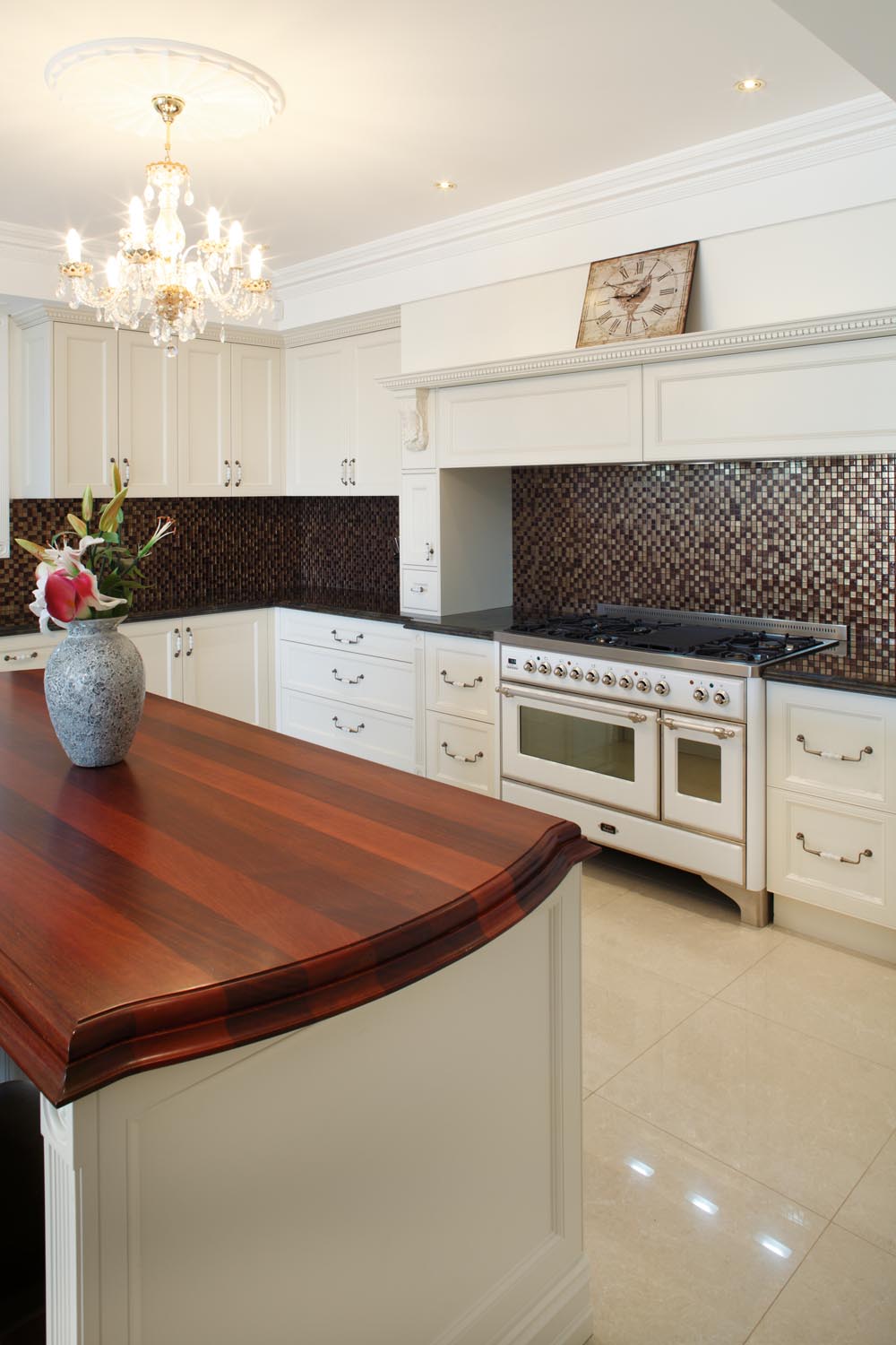 neutral backdrop for the design, allowing the two-tone mosaic splashback to draw your eye to a space that would otherwise be flat and dull. At the heart of it all is the elegant island bench, which anchors the utility of the kitchen with its dual purpose of food preparation and casual seating. Finished with a solid timber top, the island oozes provincial charm and contrasts perfectly with its surroundings. Storage plays a major role in this kitchen with a spacious walk-in pantry and a variety of clever solutions from Blum, such as spice holders, plate holders and cutlery inserts. A wall of cabinets provides the perfect hiding place for a number of high-end appliances, including two refrigerators and a dishwasher. The effect is a seamless look and superior functionality.”