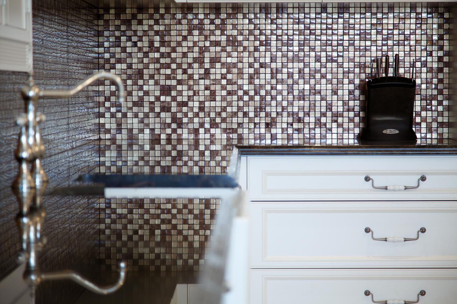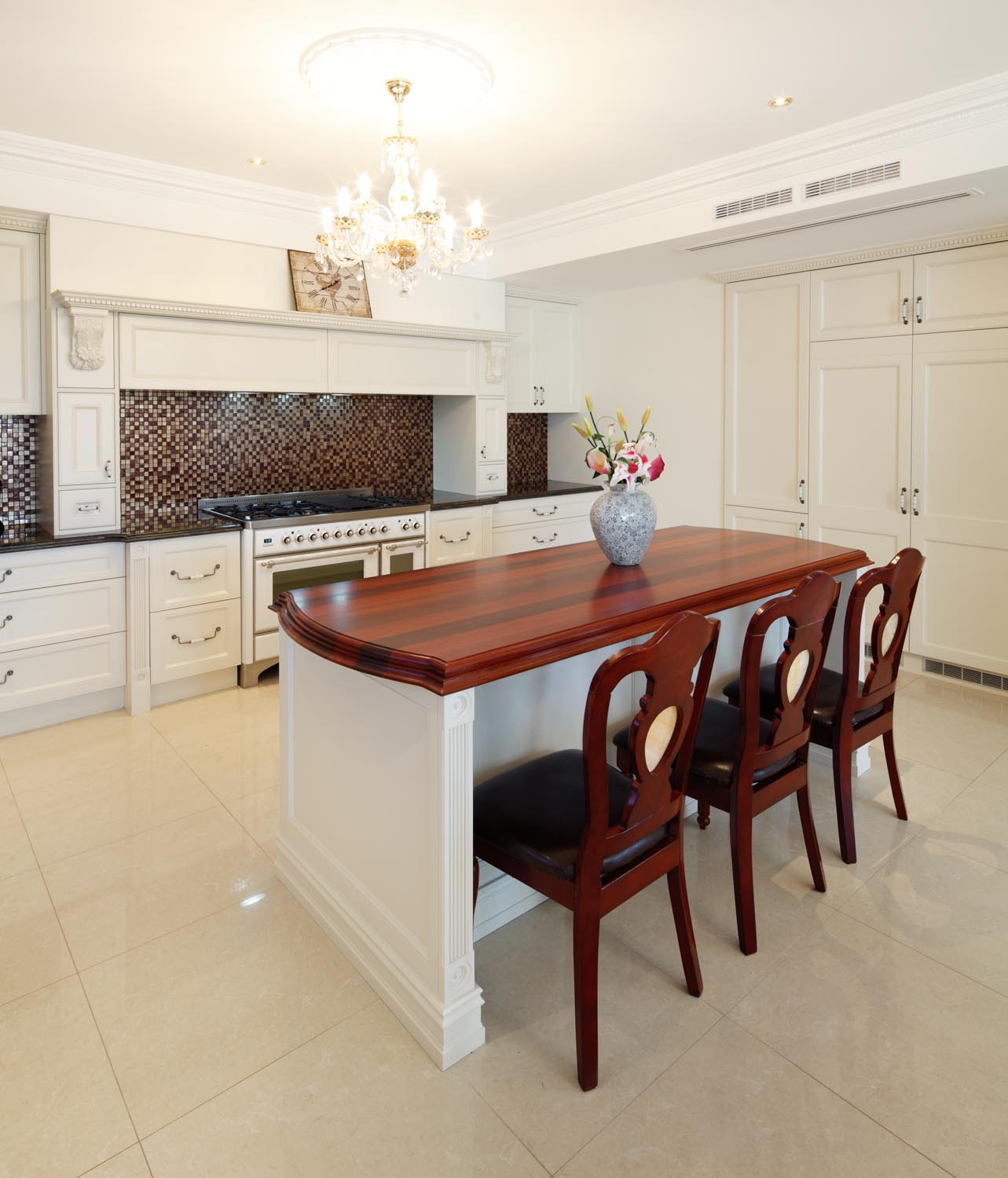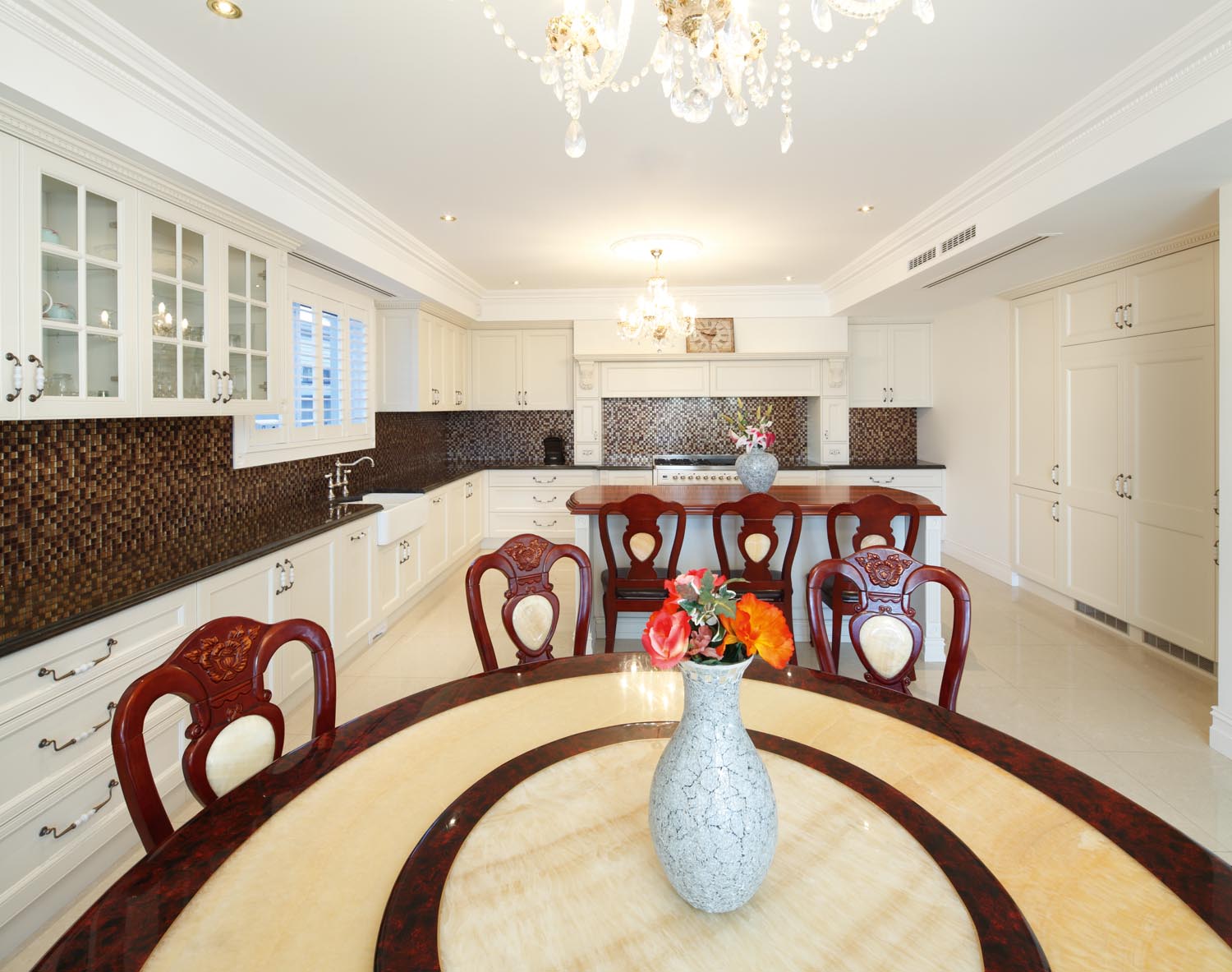 neutral backdrop for the design, allowing the two-tone mosaic splashback to draw your eye to a space that would otherwise be flat and dull. At the heart of it all is the elegant island bench, which anchors the utility of the kitchen with its dual purpose of food preparation and casual seating. Finished with a solid timber top, the island oozes provincial charm and contrasts perfectly with its surroundings. Storage plays a major role in this kitchen with a spacious walk-in pantry and a variety of clever solutions from Blum, such as spice holders, plate holders and cutlery inserts. A wall of cabinets provides the perfect hiding place for a number of high-end appliances, including two refrigerators and a dishwasher. The effect is a seamless look and superior functionality.”