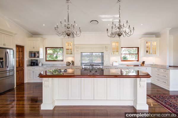 “The owners of this heritage-style Queenslander approached us to design their new kitchen after they saw one of our projects in Kitchens & Bathrooms Quarterly. Their brief was to create a practical, family-friendly space that was elegant and stylish but not too ornate. It also had to have a cosy feel but be suitable for entertaining. This kitchen is special because it blends seamlessly with the rest of the home and the elegant furniture surrounding it. Standout features include our signature Dana-style mantel, the butler’s sink, door-style end panels, and the unique furniture-style design of the jarrah timber double-layer benchtop, which adds to the kitchen’s classic look. As the benchtop is long and wide and features a high-gloss finish, it feels like an elegant dining table rather than an island bench. A Carrara marble benchtop with lambs-tongue edge detail wraps around the kitchen and provides plenty of workspace, while ample storage is found in furniture ply cabinetry and drawers that line the space.”
