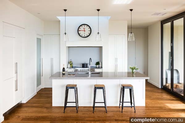 “The home’s exquisite, uninterrupted view of the beautiful Yarra Valley inspired this kitchen design. The owners wanted minimalist elements, open and uncluttered areas. It could even be called clandestine as many wonderful internal features are discreetly concealed within a simple exterior. The main kitchen walls and skilfully crafted cabinetry have been painted to blend seamlessly with the rest of the home. However, as focal points and distinct functional zones, the chimney piece and island bench were to exhibit uniqueness. Pantry-sized cabinets accommodate storage features and internal lighting. The butler’s pantry presented a minor challenge. The modest space had to feel comfortably proportioned without sacrificing valuable bench or storage areas and incorporates wrap-around shelving, a general-use fridge, microwave, scullery and waste disposal. The kitchen’s aspect appreciates an exquisite view. Its hue and crisp simplicity give the allure of an elegant beachside resort, yet also the classical minimalism of an inner-city townhouse.”