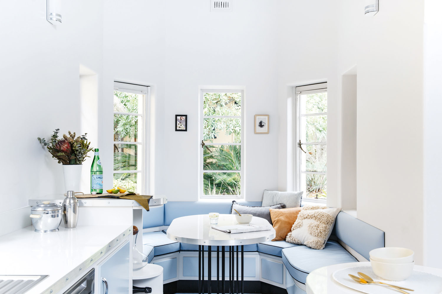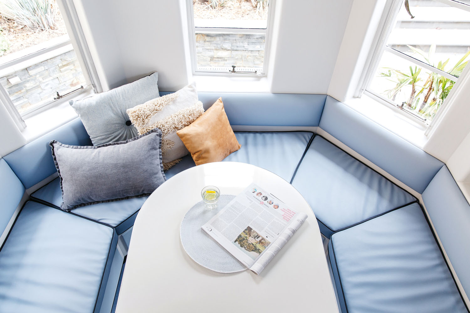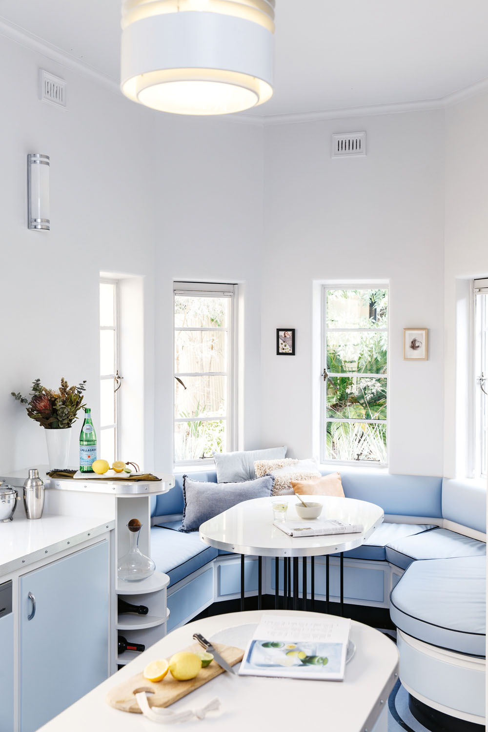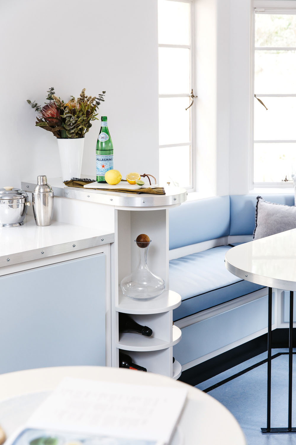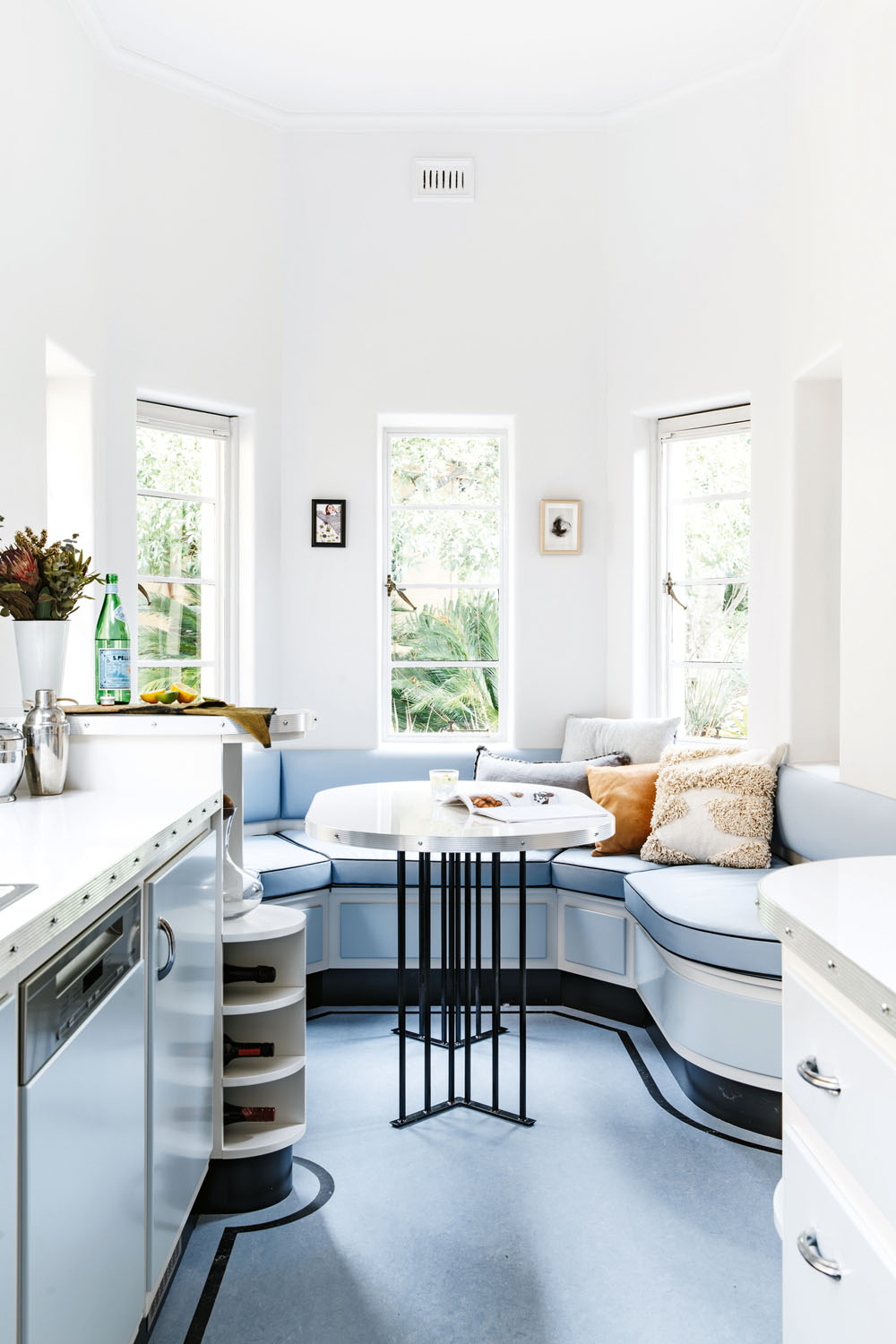 The cabinetry keeps the retro look, with a fully integrated dishwasher and the bar fridge hidden behind those pale blue doors. The corner dining nook is perfectly in theme: the perfect mix of relaxed dining and a diner booth seat. And it’s just the spot for a cheeseburger and fries.