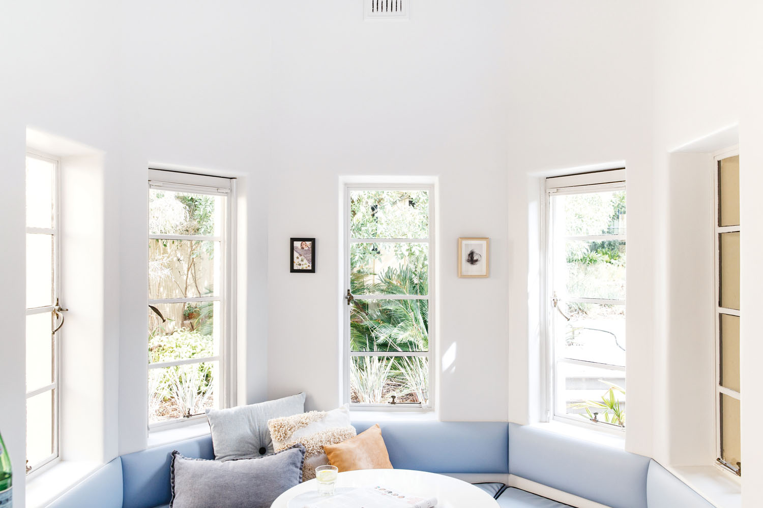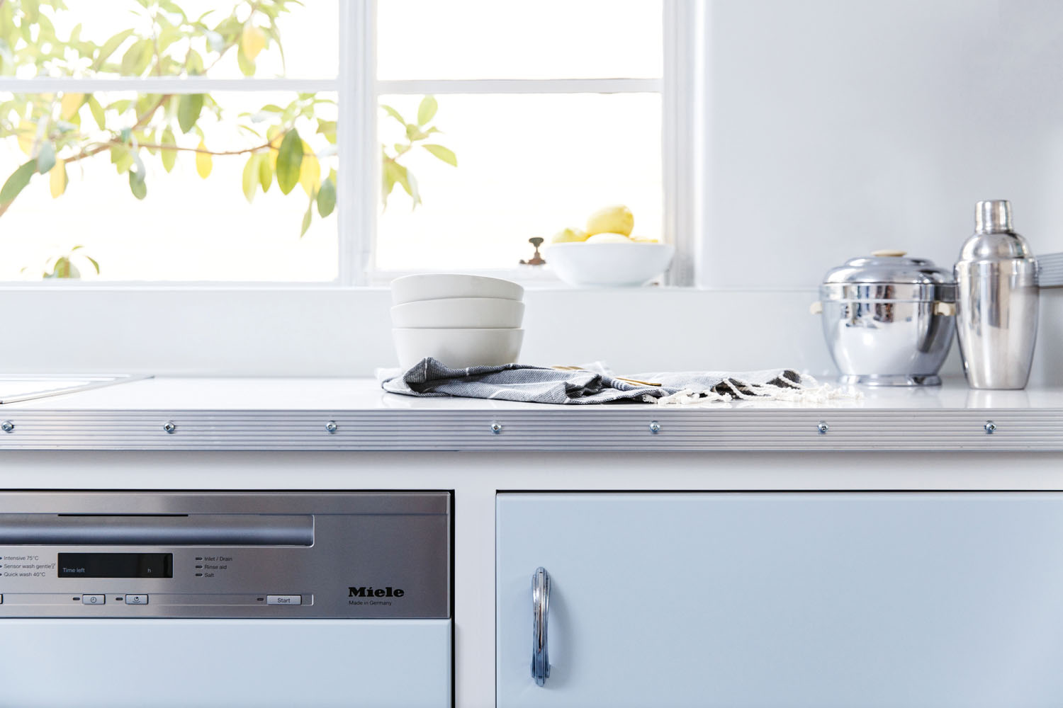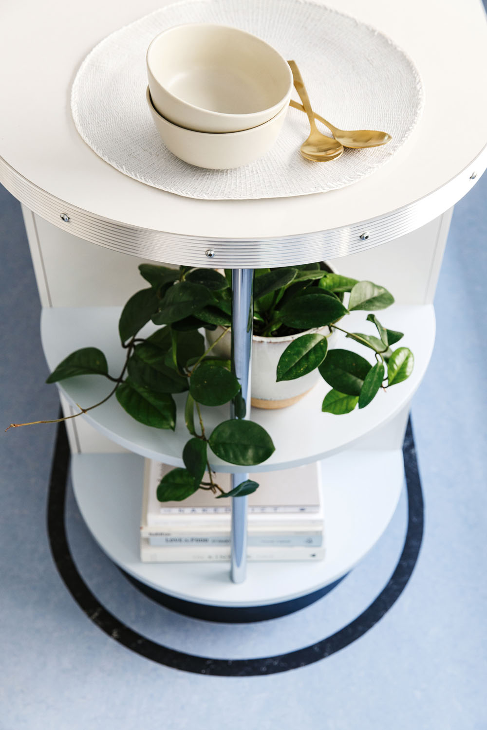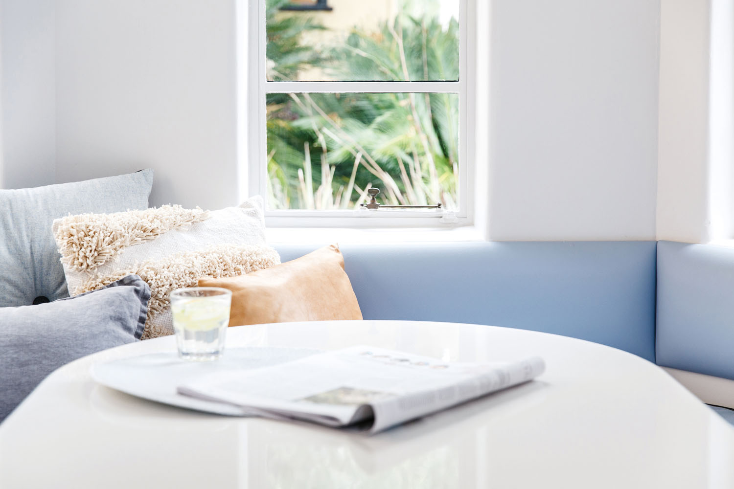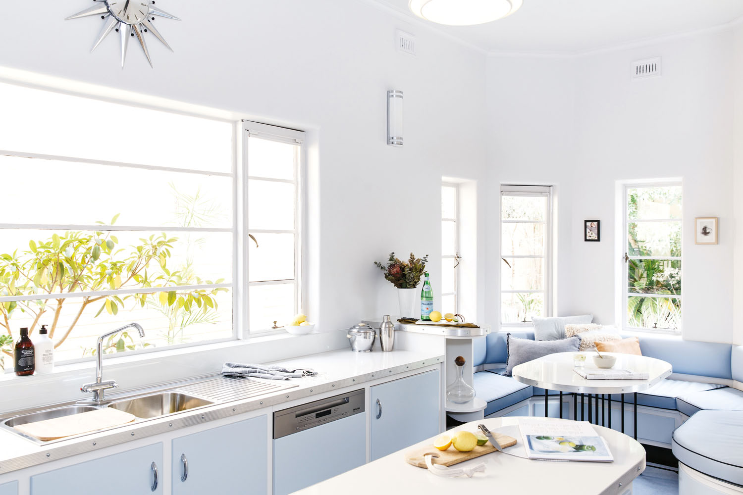 The cabinetry keeps the retro look, with a fully integrated dishwasher and the bar fridge hidden behind those pale blue doors. The corner dining nook is perfectly in theme: the perfect mix of relaxed dining and a diner booth seat. And it’s just the spot for a cheeseburger and fries.