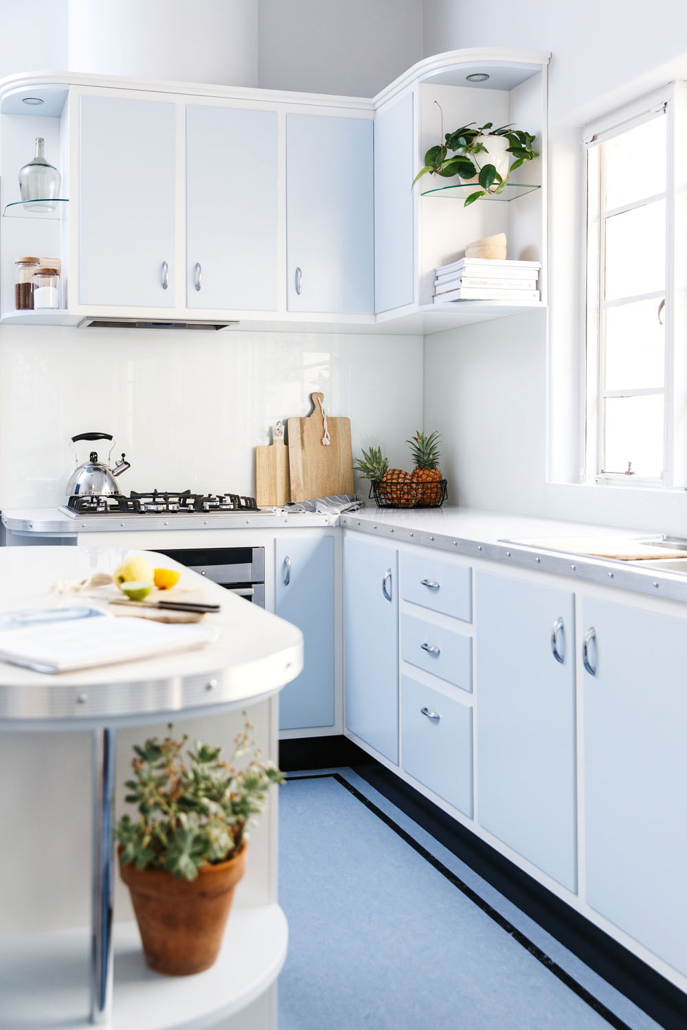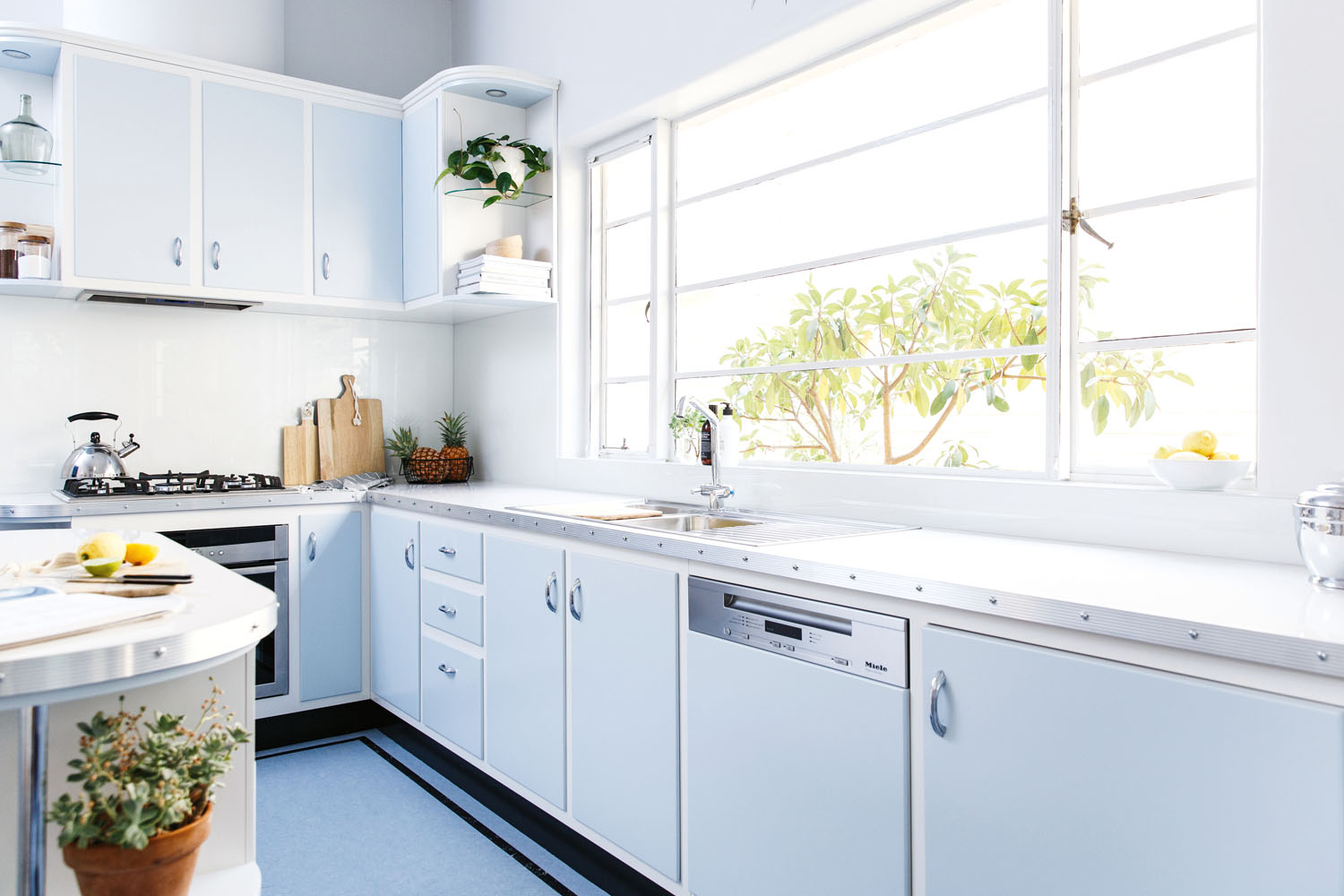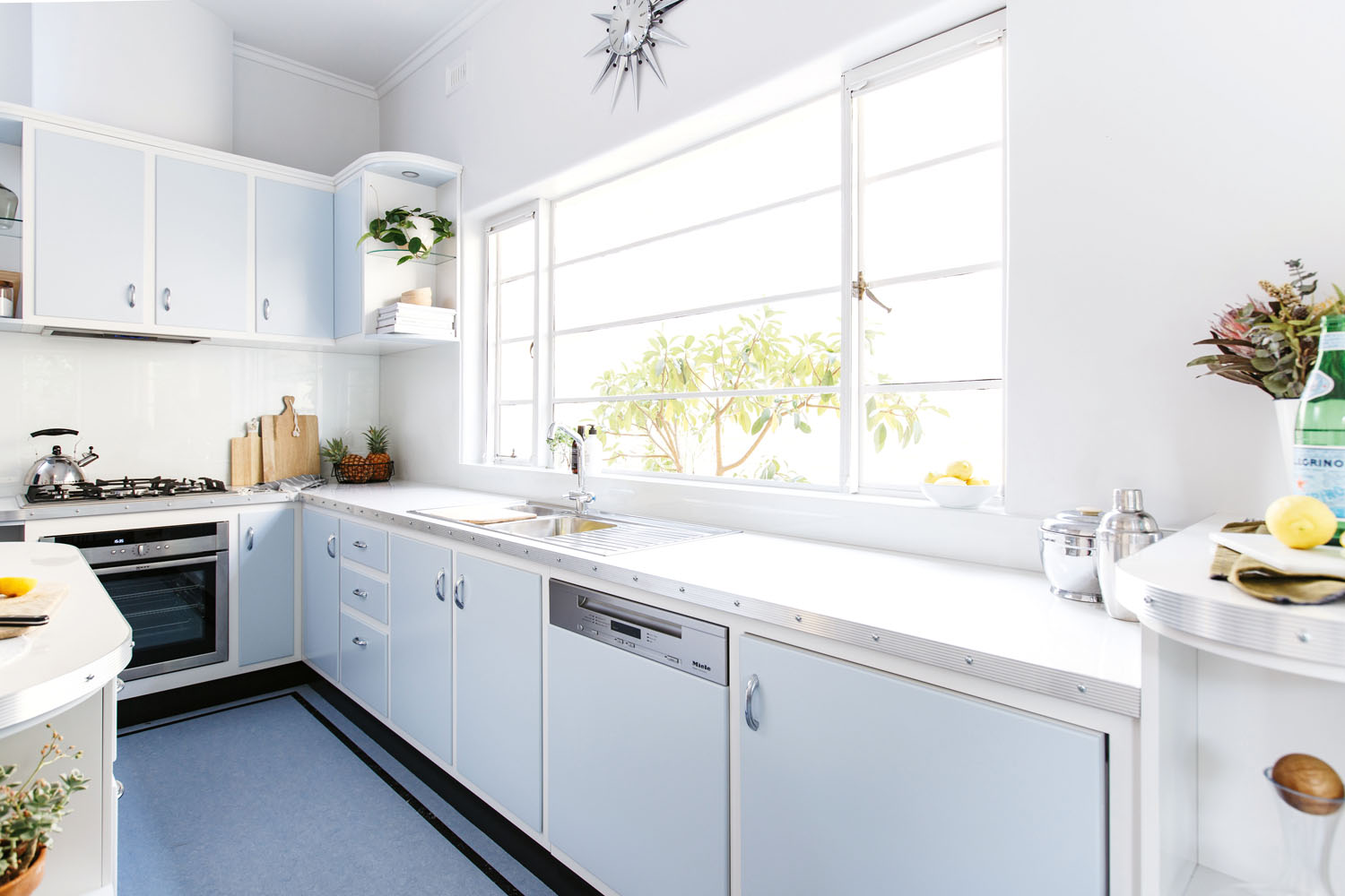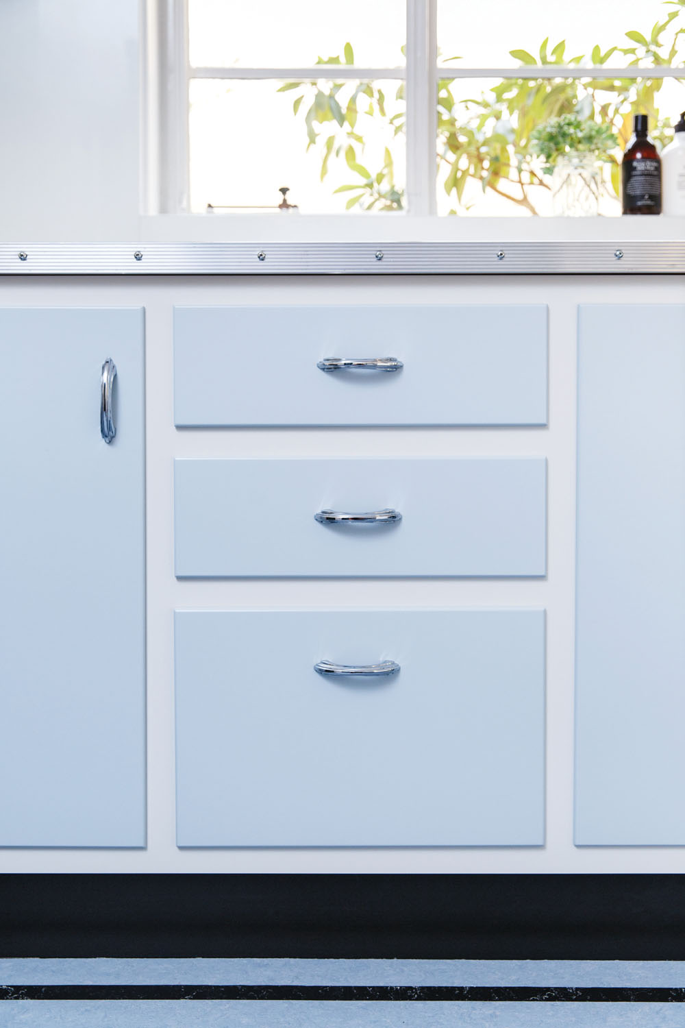 Meanwhile, Deborah and Bob delved into the world of 50s-style décor and architecture. This research was the foundation in creating a space that embraced cute retro qualities while still seeming fresh and new. The finished kitchen is effortless in its look and feel. Featuring light pastel colours, the design has used chrome to accentuate the length of the room. The windows have been used effectively to open up the space with light and air.