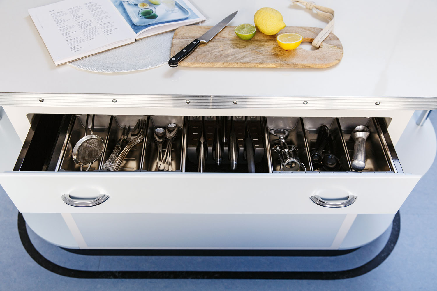 The kitchen space itself was a challenge: long and narrow, with little wall space. Creating the impression of space, while maintaining the appealing retro look, was of upmost importance. Space Craft Joinery allowed for
