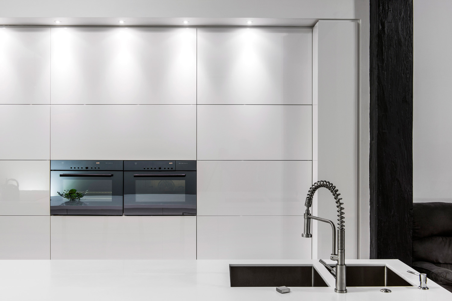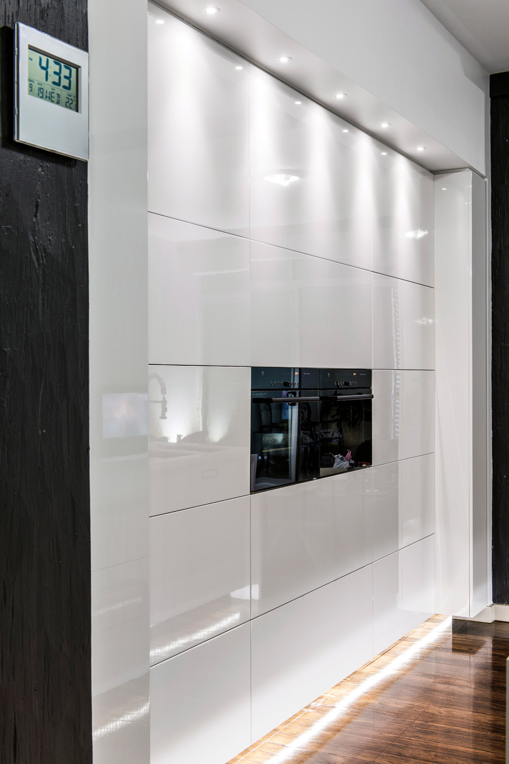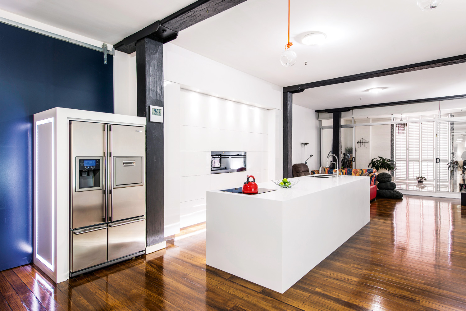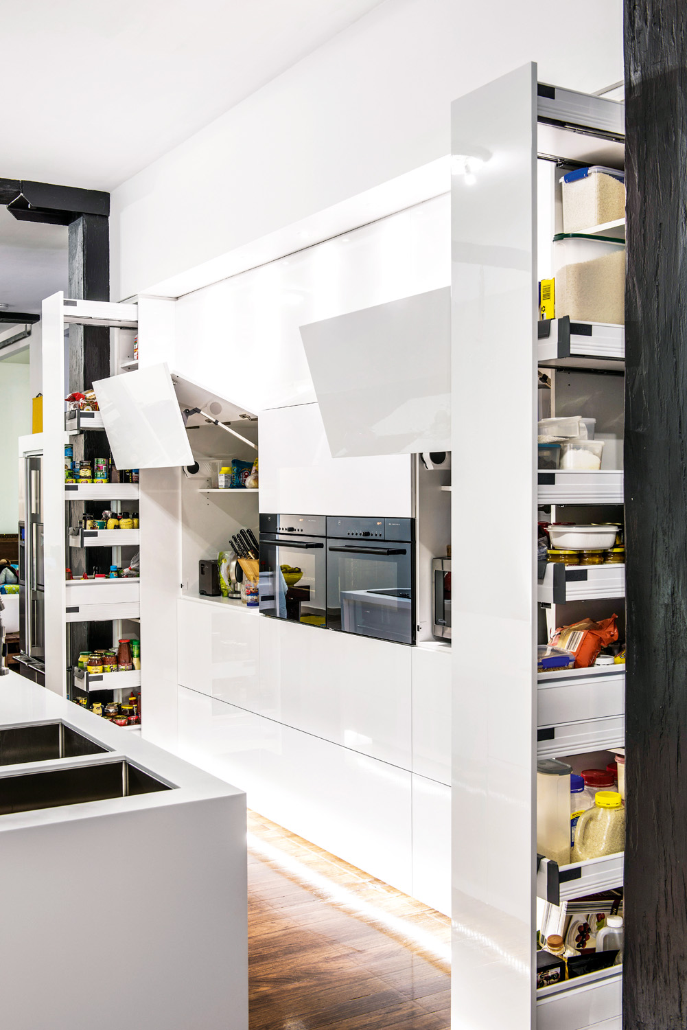 “Taking inspiration from the latest international design fairs, this kitchen trends towards a minimalist look where the kitchen invisibly blends into the background. It’s a design that’s particularly relevant to inner-city apartments, where there isn’t a dedicated space for a kitchen and it needs to work in with the living area without taking over. Loads of compact storage is concealed behind floor-to-ceiling wall panels, which open automatically with a light touch on the handle-less front and which are powered by the Servo-Drive electrical drive system. Either side of the oven, bi-fold doors lift up, as opposed to traditional left- or right-opening cupboards, providing easy access to day-to-day essentials like the microwave and kettle. The pantry is housed in full-height pull-out cabinets, leaving the island bench as the statement piece in the room and the dedicated cooking, preparation, dishwashing and bin area. What the owners love most is that it’s such a practical space when in use and so easily packed up when the cooking is done.”