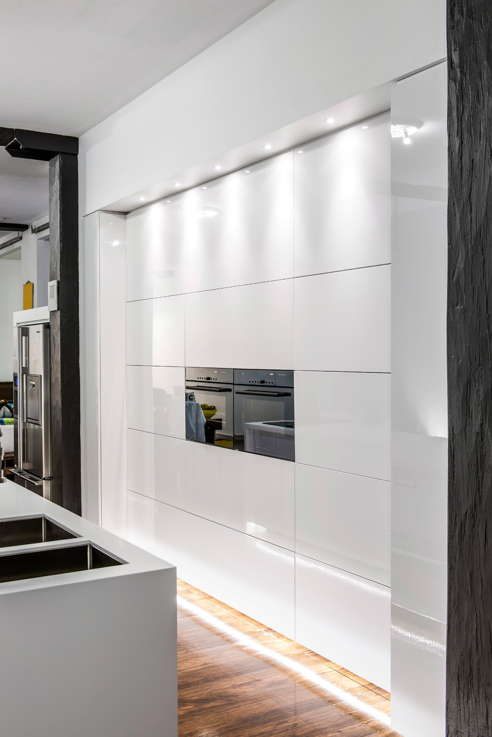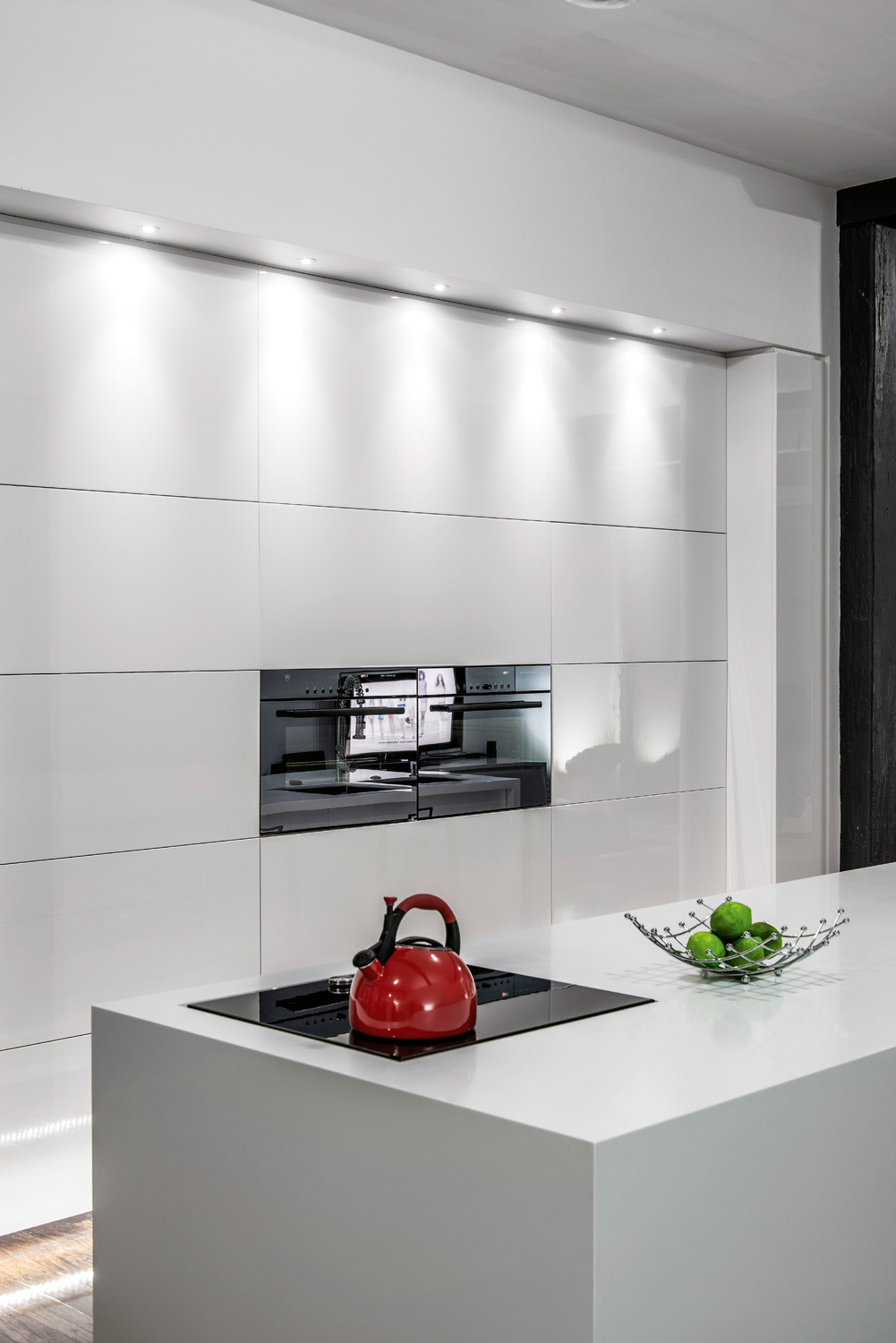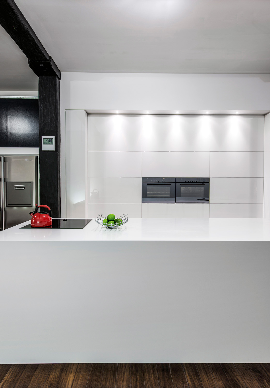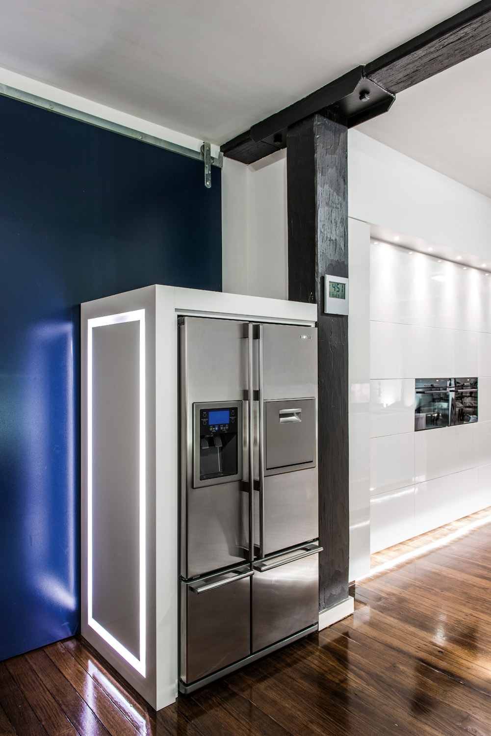 “Taking inspiration from the latest international design fairs, this kitchen trends towards a minimalist look where the kitchen invisibly blends into the background. It’s a design that’s particularly relevant to inner-city apartments, where there isn’t a dedicated space for a kitchen and it needs to work in with the living area without taking over. Loads of compact storage is concealed behind floor-to-ceiling wall panels, which open automatically with a light touch on the handle-less front and which are powered by the Servo-Drive electrical drive system. Either side of the oven, bi-fold doors lift up, as opposed to traditional left- or right-opening cupboards, providing easy access to day-to-day essentials like the microwave and kettle. The pantry is housed in full-height pull-out cabinets, leaving the island bench as the statement piece in the room and the dedicated cooking, preparation, dishwashing and bin area. What the owners love most is that it’s such a practical space when in use and so easily packed up when the cooking is done.”