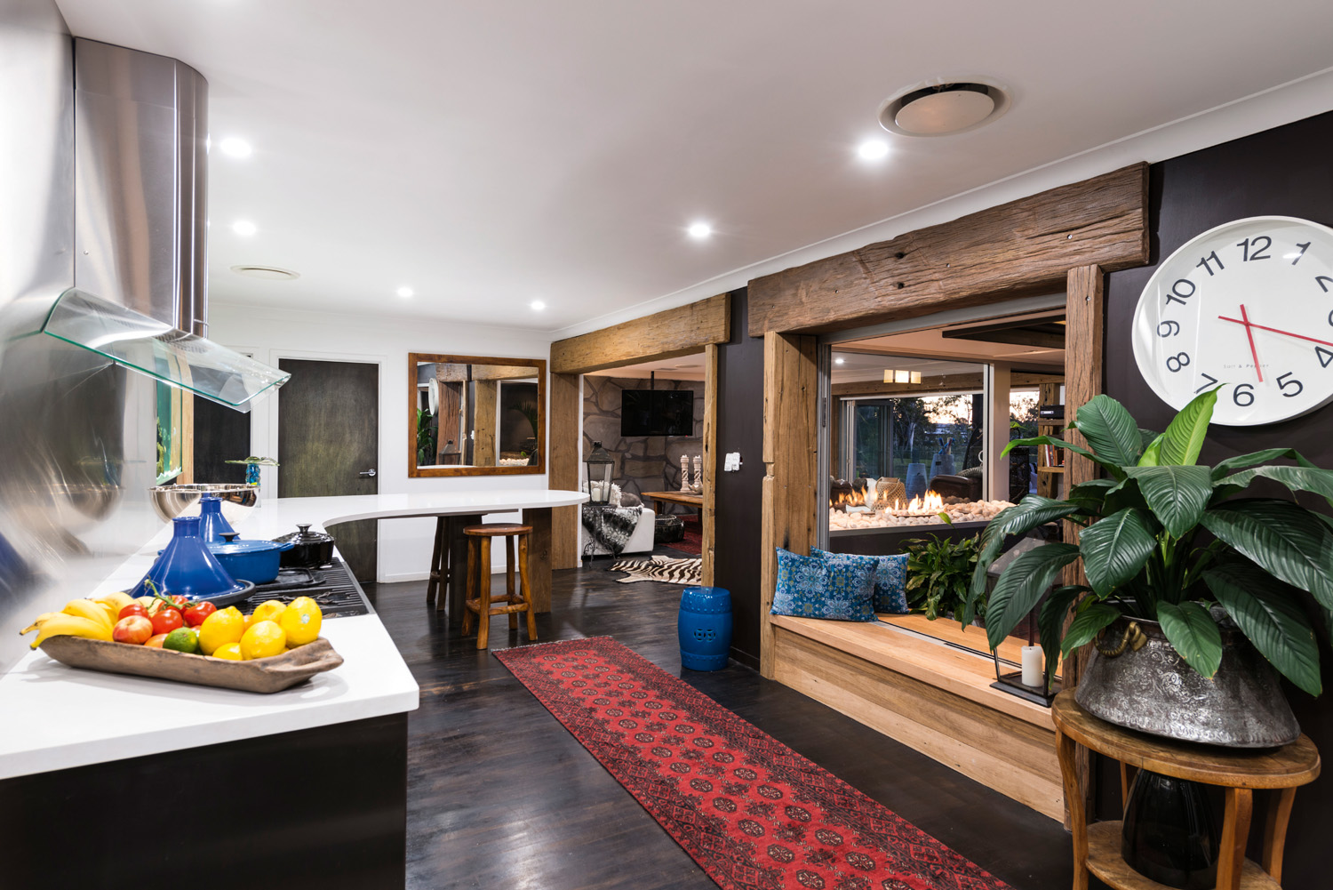 Kitchens today are social hubs of the home rather than simply a plac e to prepare and cook food and this renovated kitchen had to reflect that. It features a beautiful open low-lying recycled timber window seat connecting it to the outdoor areas. The kitchen’s large curved white benchtop allows for socialising too and by having the sink on a freestanding bench, more of the other bench space is freed up, creating a spacious feel and a practical area. It was important this be incorporated into the kitchen design and while it is sleek and modern, it also complements the existing outdoor area, chiefly by the timber window seat connecting to the space.
