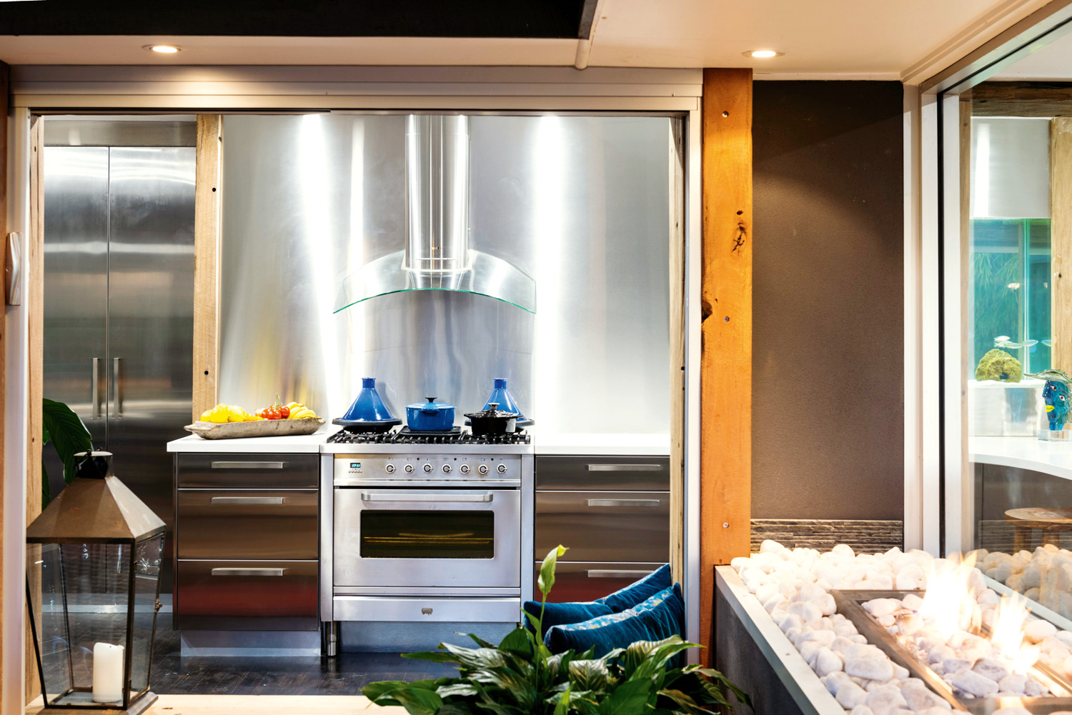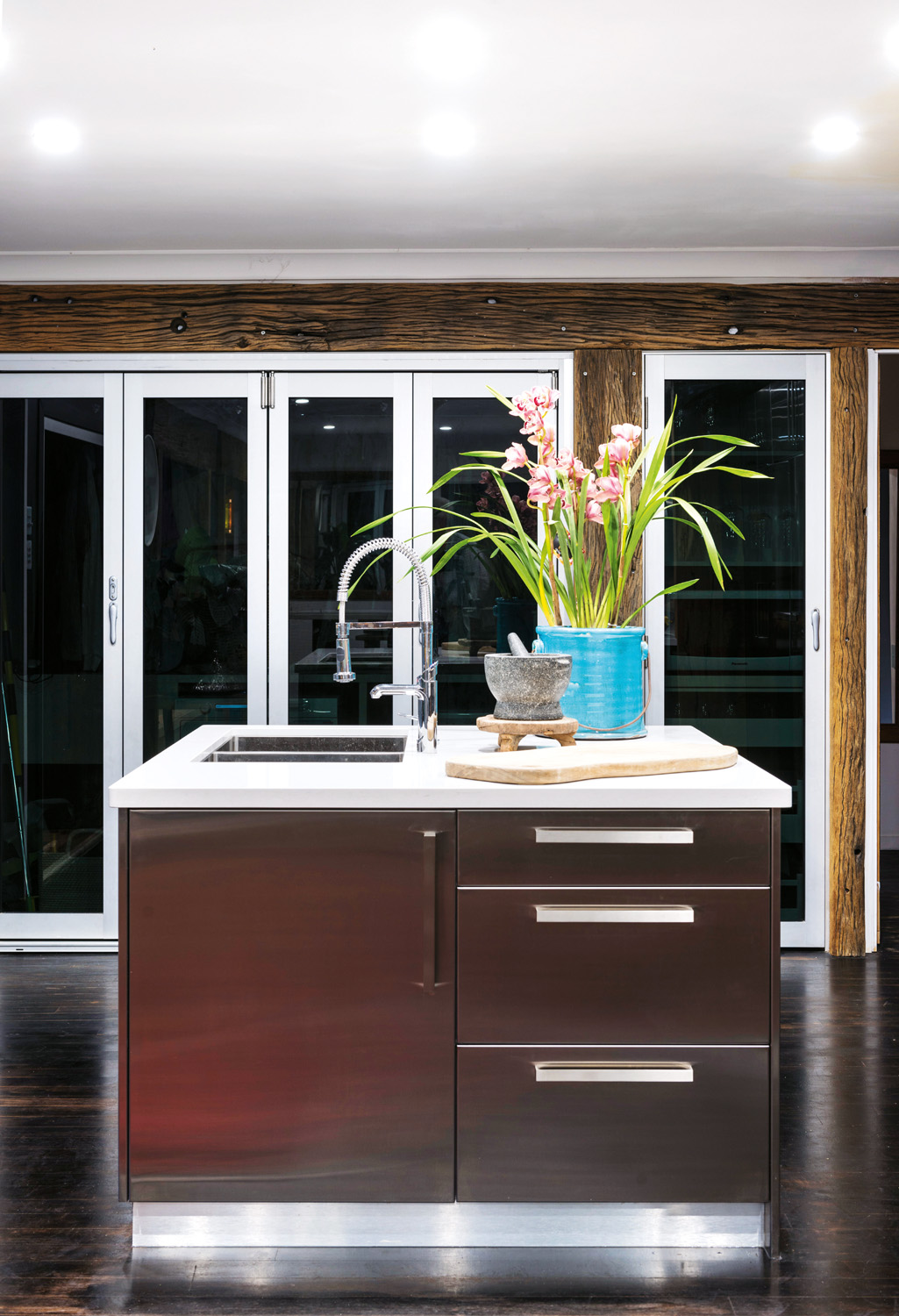 The design features elements of stainless steel, recycled timber and a standout fish tank seamlessly integrated into the splashback in a design that complements the “already innovative house”, says Phil. The homeowners wanted a kitchen that looked modern and sleek but was user-friendly and able to handle from one to 10 people.