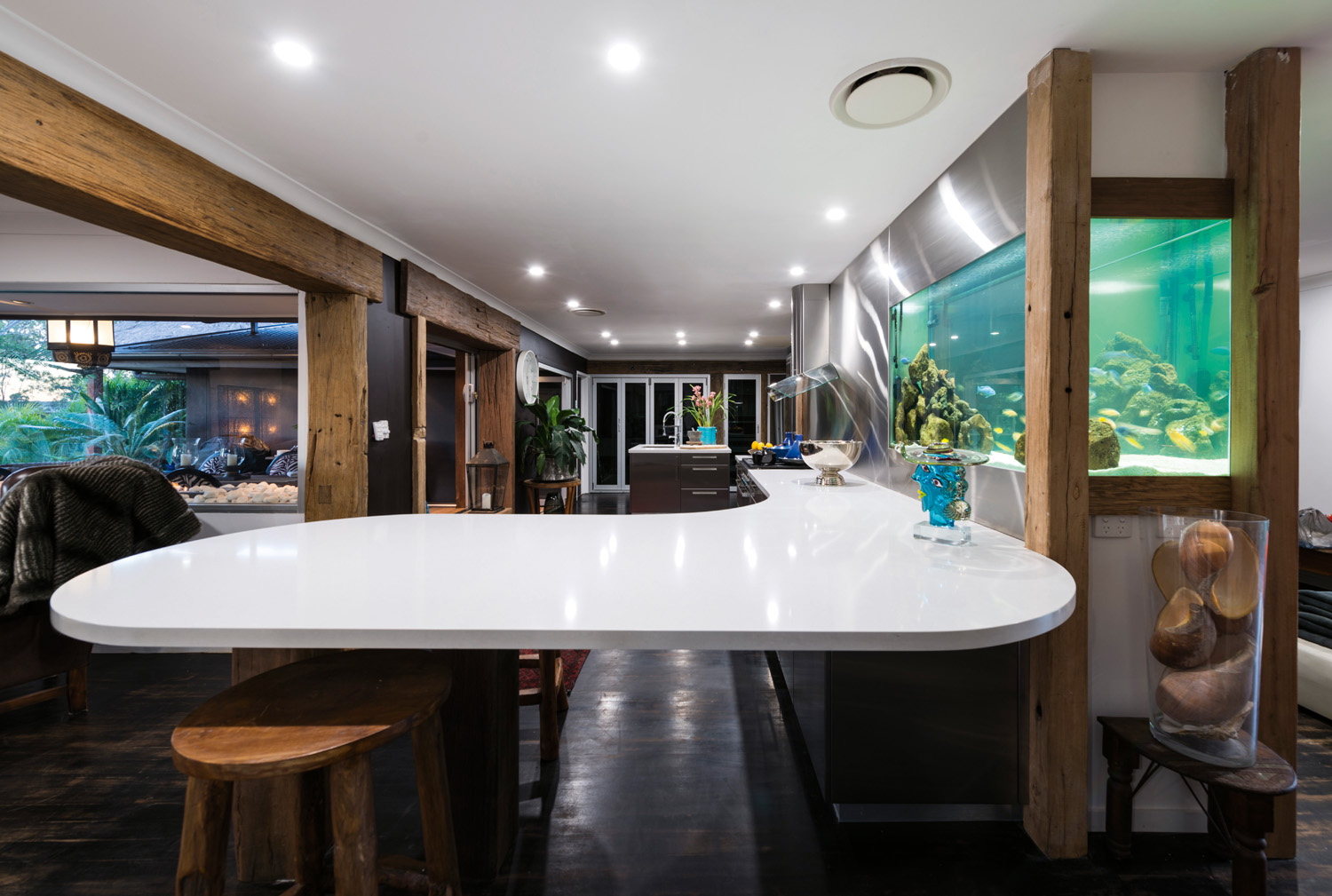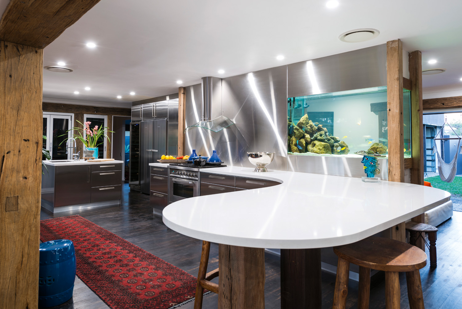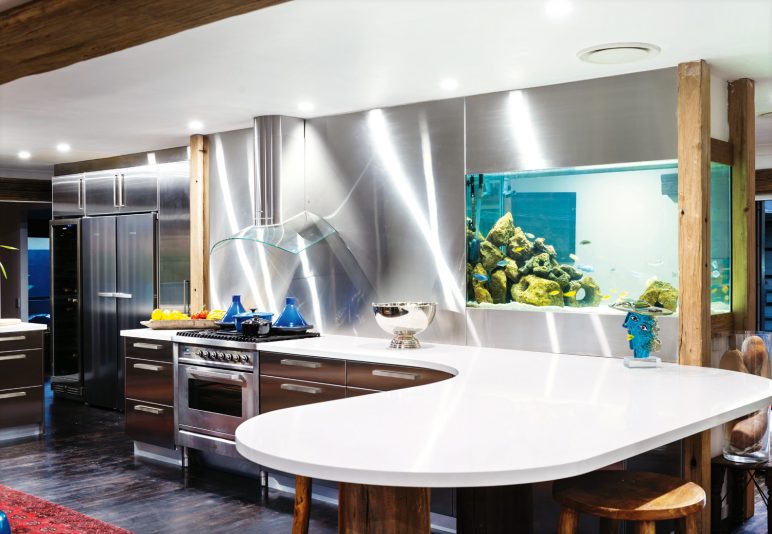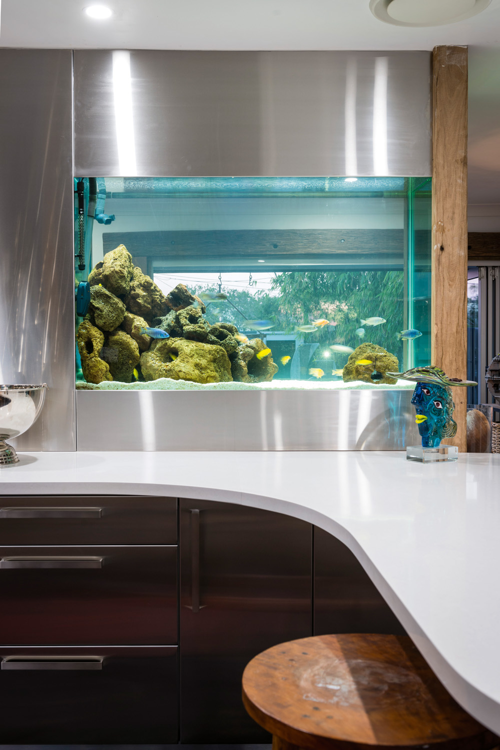 An eclectic combination of materials and a unique aquarium splashback are standout features of this extraordinary kitchen by Designer Kitchens
