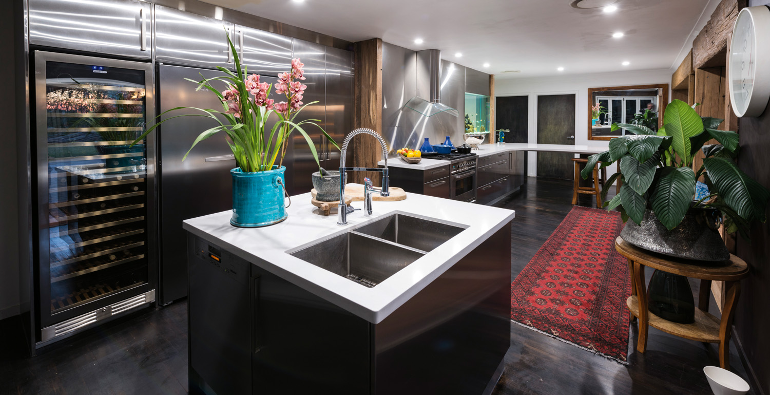 The project’s biggest splurge is perhaps the most impressive. Designer Kitchens has successfully incorporated a beautiful tropical fish tank into the splashback design and the effect is stunning. Stainless-steel cabinetry with black timber flooring creates a dark and moody, modern atmosphere; the curved Organic White Caesarstone benchtop and aqua blue-lit fish tank contrast with the dark tonal palette. The eye is drawn to the unique fish tank element, which was a specific client request for this eclectic style.