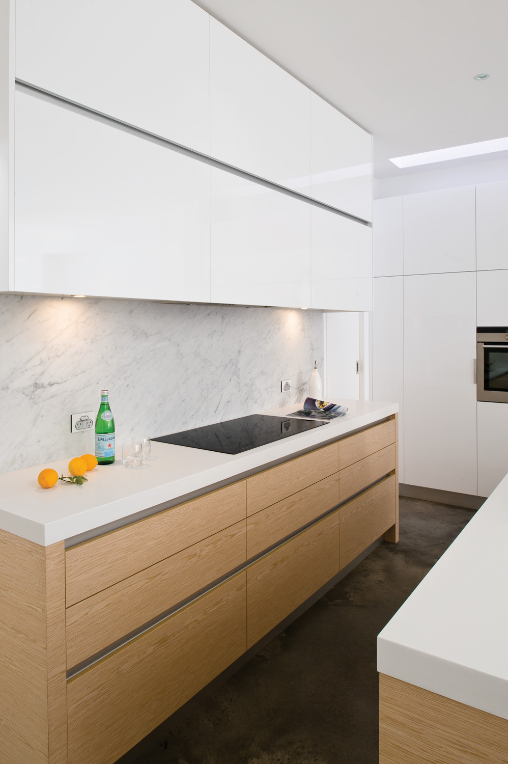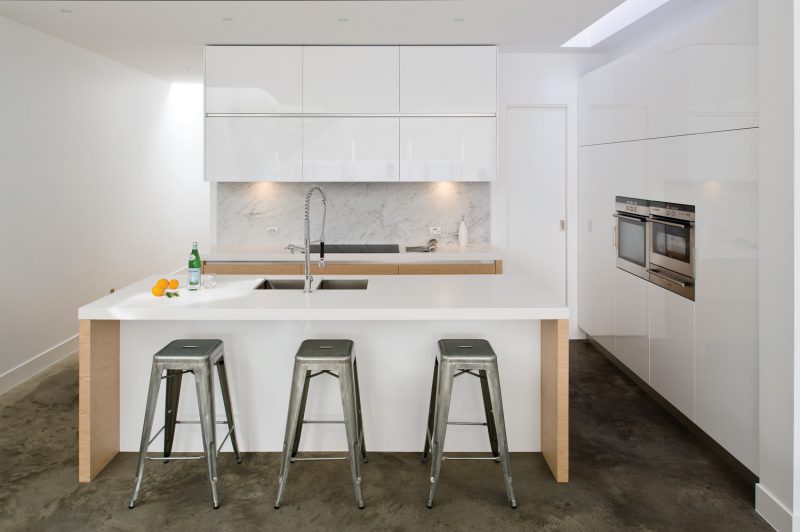 Still, designer Con Moshopoulos of Urban Kitchens really had his work cut out for him, as his design had to cleverly squeeze in two Liebherr integration fridges. Space-saving ideas were cleverly employed to maximise the available space, such as an abundance of timber veneer drawers with handle-free extrusion. Despite its size, the crisp, glossy white kitchen is filled with plenty of special design features such as 80mm-thick Amerind sandblasted oak timber veneer end panels, Calcatta marble splashbacks and polished concrete floors, which also accentuate the modern look.