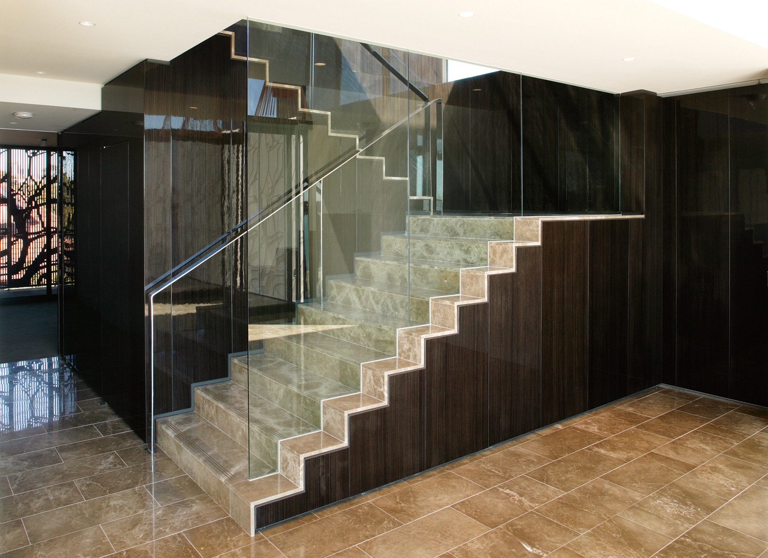 “This ultra-modern kitchen has all the features of a larger space. Housed in a compact apartment, high-end Gaggenau appliances have been integrated strategically for a clean, uncluttered feel. The streamlined look continues in the sleek marble floors and benchtop. Attention to detail was paramount with the selection of a richly toned gloss grain-filled veneer cabinetry, which contrasts beautifully with the bronze aluminium kickboards. From the Eveneer Aniseed doors and panels to the tapered Integral handles, this kitchen is the epitome of streamlined style. The marble benchtop is the perfect match for the bronze mirrored splashback and marble floor. This design standard continues in the bathroom, which is dominated by clean lines, hidden doors, and mirrors that double as cabinets to maximise space and create seamless integration.”