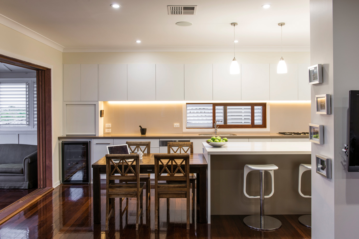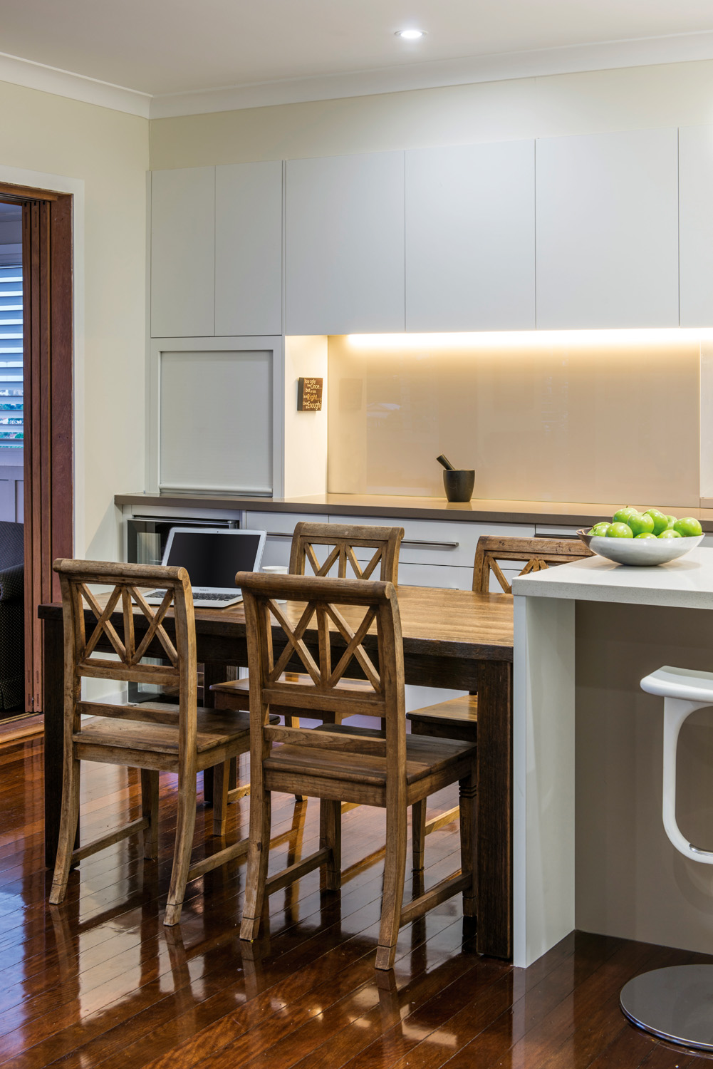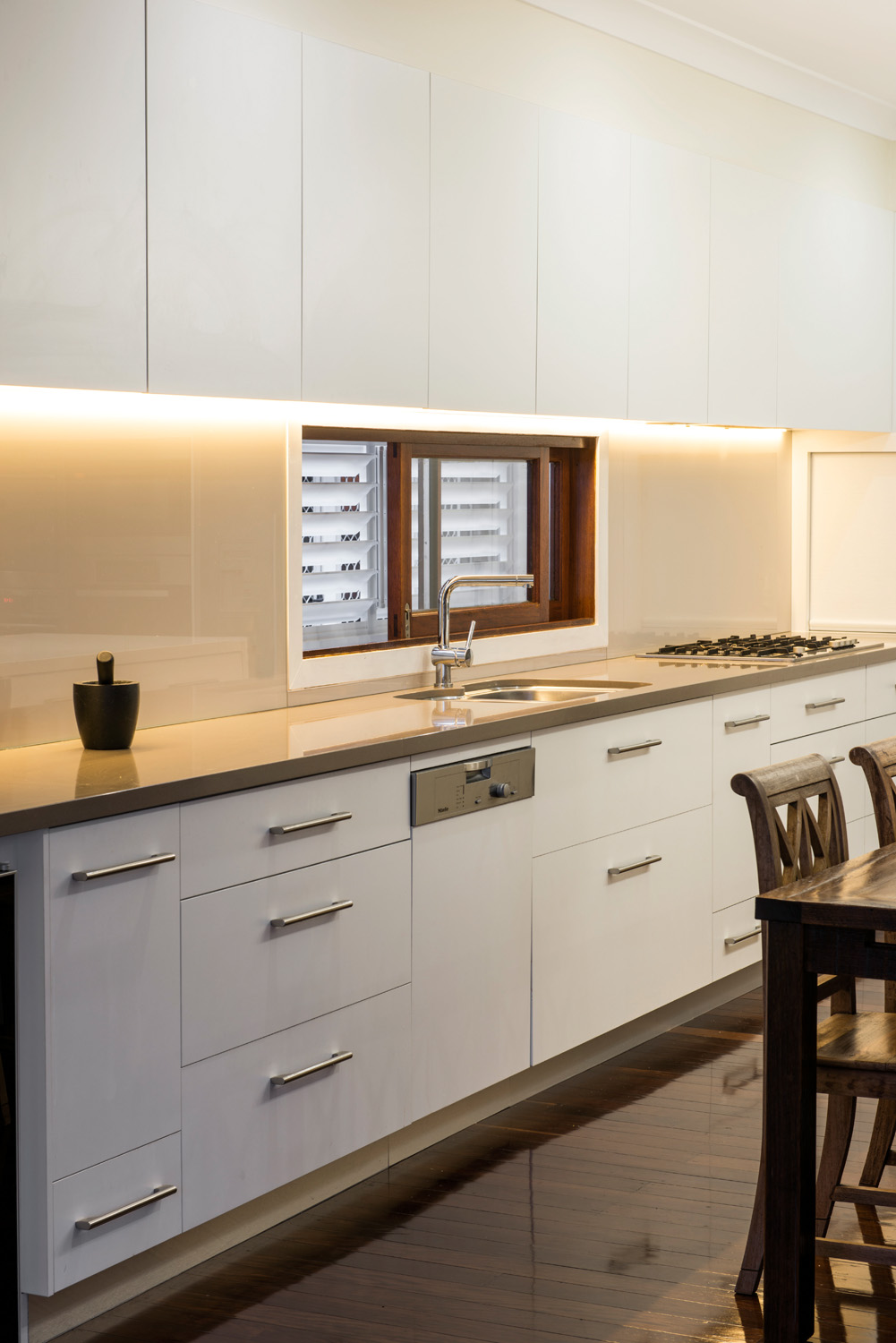 “The brief for this kitchen was a spacious and luminous design that would meet the practical needs of a family. The removal of a dividing wall enabled the entire space to be opened up. Extra wall length meant that a longer bench could be installed, providing extra storage and space for food preparation. Bi-fold doors allow the kitchen to flow into the adjoining room and help expose stunning city views. An integrated dining area provides the perfect spot for the family to enjoy casual meals. The light colour scheme, clever lighting design and glossy reflective surfaces are what create the illuminated and gleaming appearance of this kitchen. An LED strip has been installed underneath the upper cupboards along with LED spot lights on the ceiling. Combining polished timber with glass splashbacks and stainless steel appliances achieves a look that’s both homely and sophisticated.”
