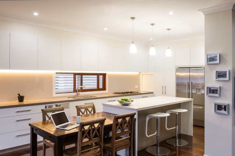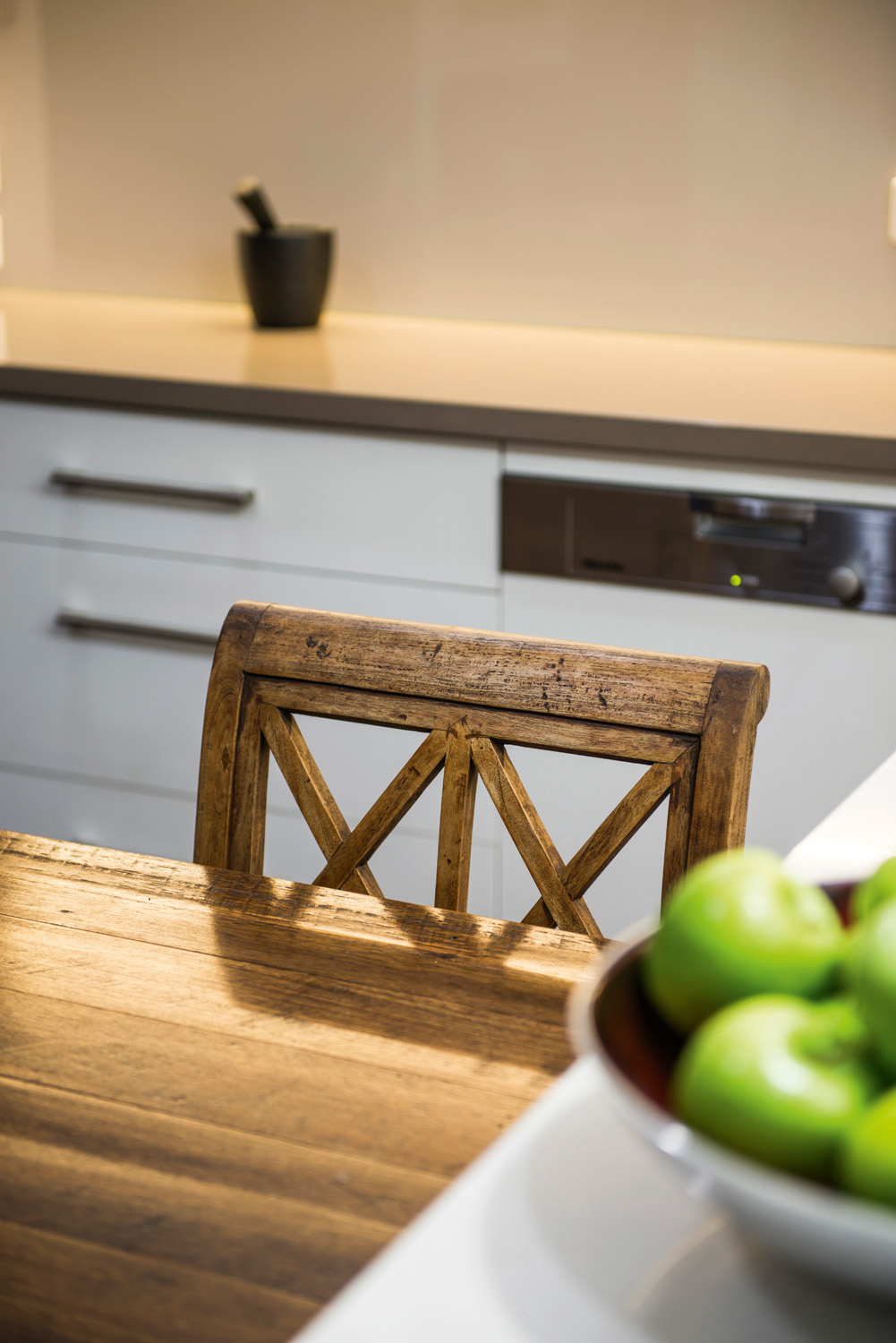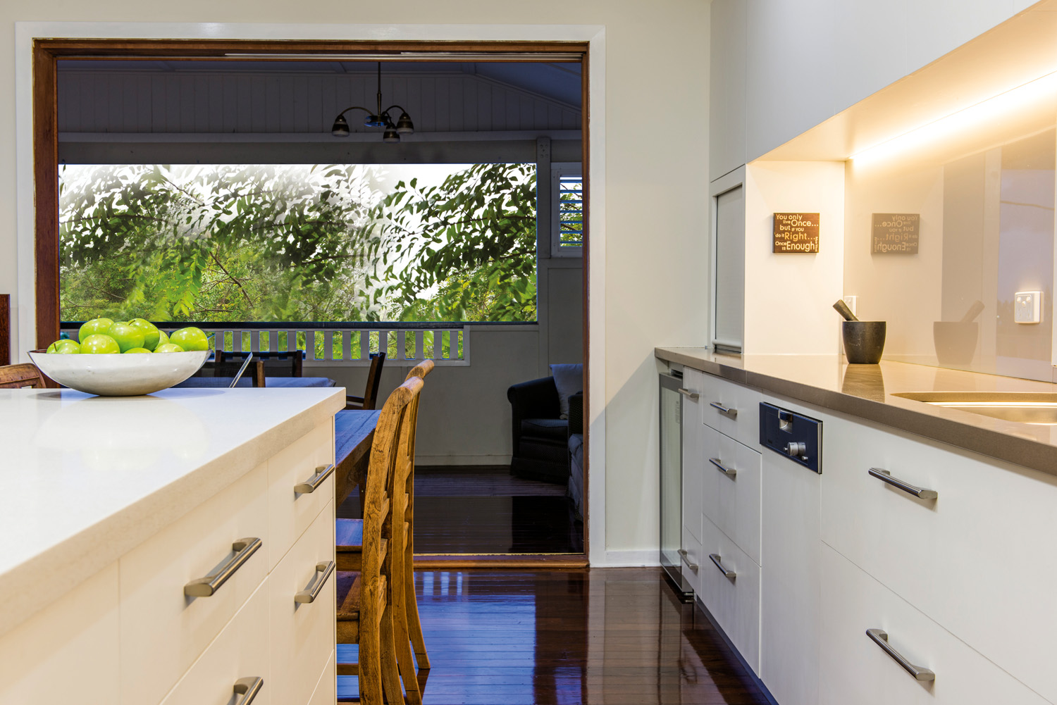 “The brief for this kitchen was a spacious and luminous design that would meet the practical needs of a family. The removal of a dividing wall enabled the entire space to be opened up. Extra wall length meant that a longer bench could be installed, providing extra storage and space for food preparation. Bi-fold doors allow the kitchen to flow into the adjoining room and help expose stunning city views. An integrated dining area provides the perfect spot for the family to enjoy casual meals. The light colour scheme, clever lighting design and glossy reflective surfaces are what create the illuminated and gleaming appearance of this kitchen. An LED strip has been installed underneath the upper cupboards along with LED spot lights on the ceiling. Combining polished timber with glass splashbacks and stainless steel appliances achieves a look that’s both homely and sophisticated.”