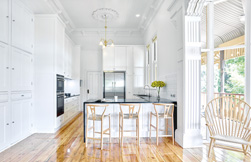 Classic moulding and cornices are highlighted through the primarily white colour palette and add to the traditional style. The all-white cabinetry is broken up through the contrasting black granite benchtop, polished timber floor and timber accents. Modern chrome taps and handles adorn the traditional cabinetry, creating a classic contemporary look. The traditional theme is completed with the white bevelled-edge tile splashback.”