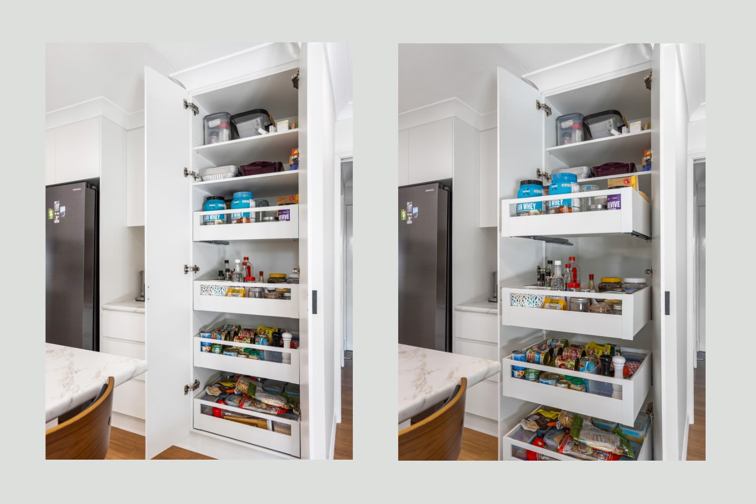 Functionality sits at the heart of the new layout. The introduction of internal pantry drawers, improved bench spans and refined storage planning has created a space that works intuitively. The dedicated bin storage, once missing entirely, now integrates seamlessly into the cabinetry and supports the efficient flow the owners hoped for.