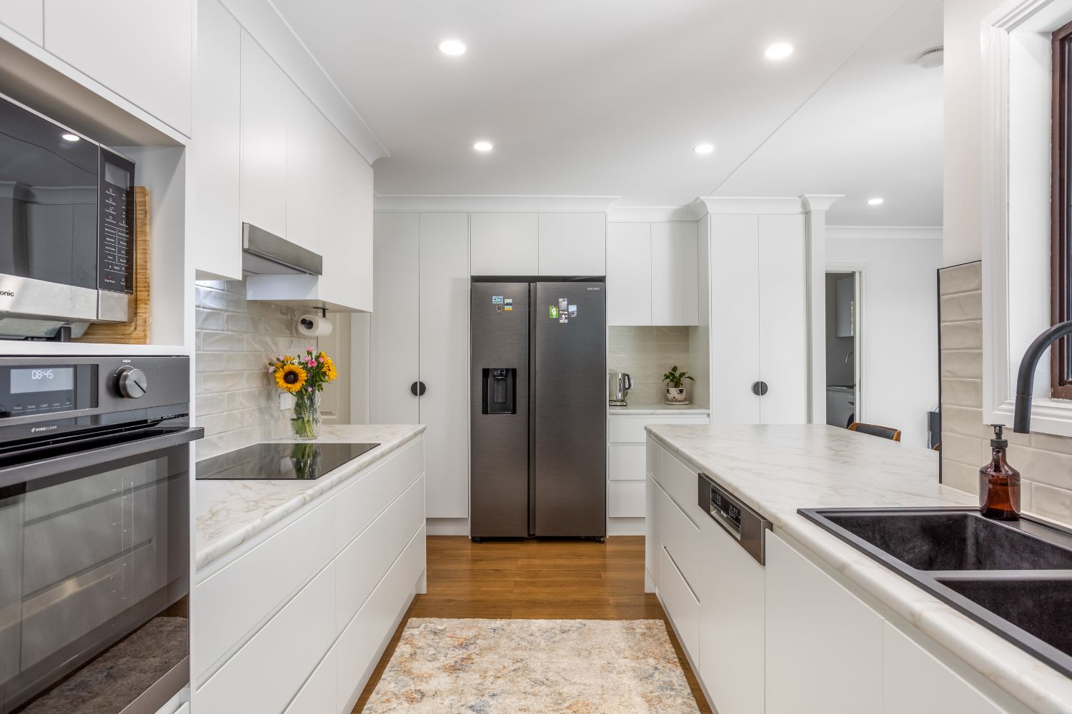 Laminated benchtops were selected to meet budget requirements, yet their subtle finish anchors the design with a contemporary tone. The result is a cohesive blend of durability and style that suits the homeowners’ needs without compromise.