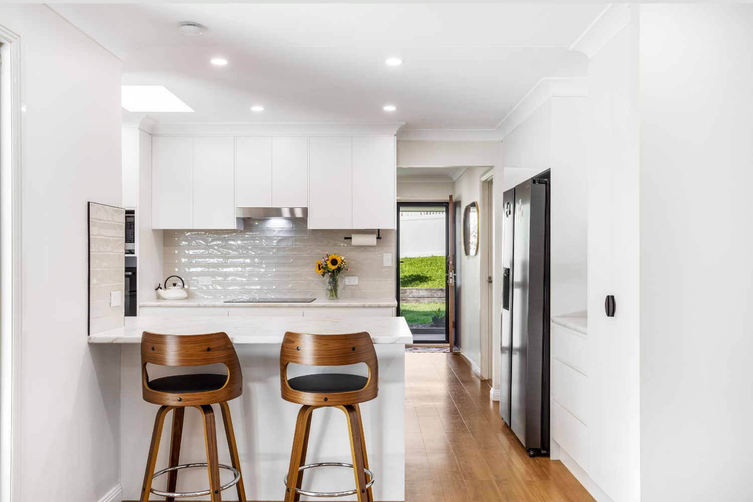 The palette centres on Melamine Classic White Matt cabinetry, chosen for its crisp yet soft appearance. Paired with bevel handleless joinery, the cabinetry reads as smooth and uninterrupted, allowing the room to feel more expansive.