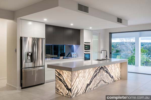 The backlit New York marble on the island benchtop is a showstopper. It immediately draws the eye to the island and creates an arresting focal point. In contrast, the white and grey cabinetry presents sophisticated muted tones, allowing the island to be the hero.