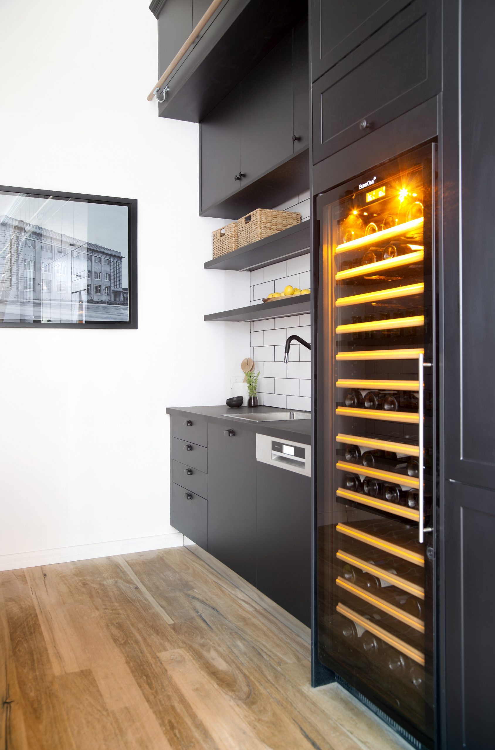 “There are so many standout features in this space, but the one that strikes you first is the stunning backlit Caesarstone Concetto White Quartz island bench. It’s suspended above the mirror kick – showcasing a monolith of backlit glowing quartz.”