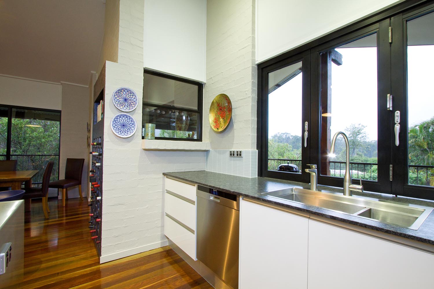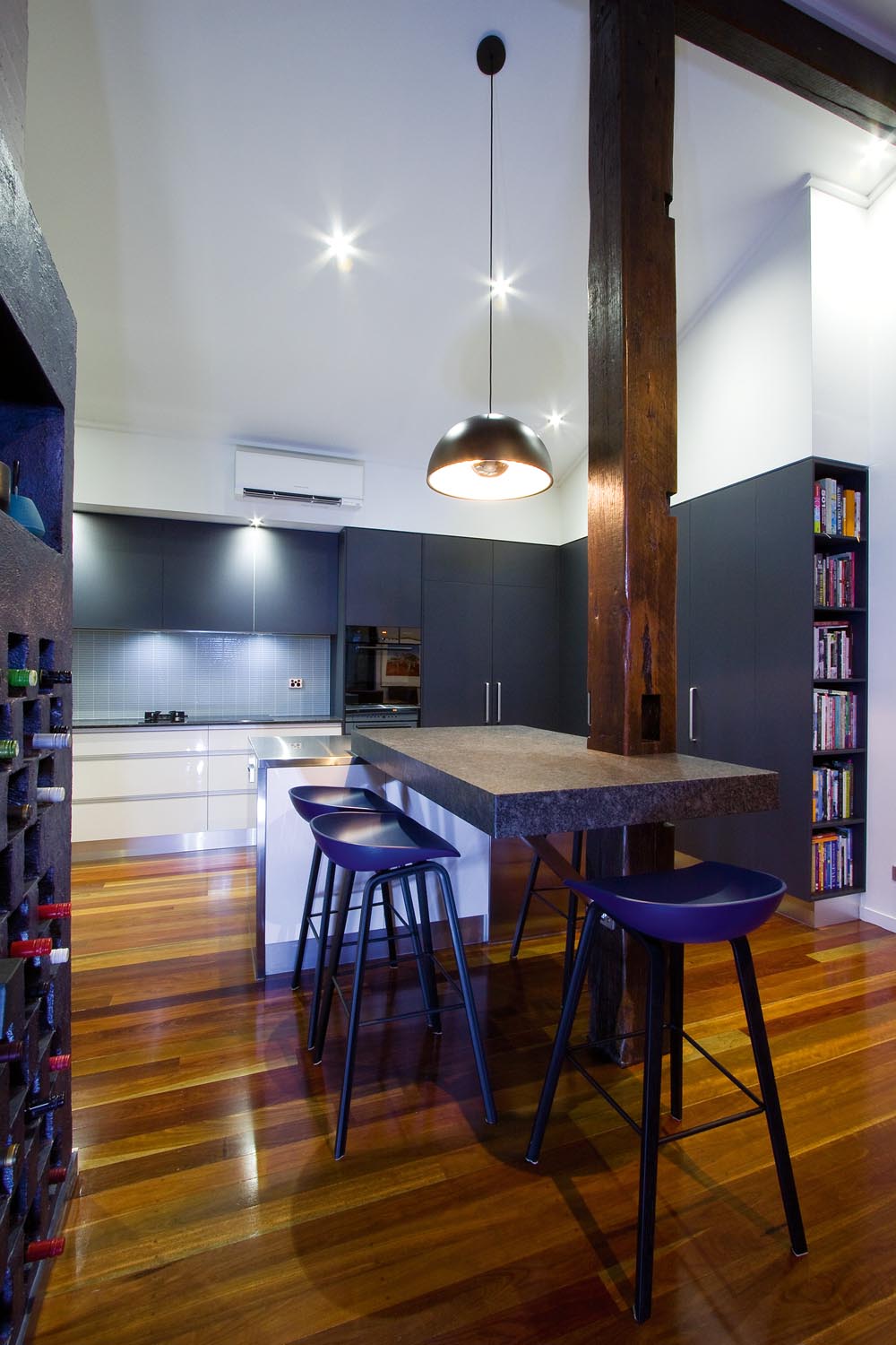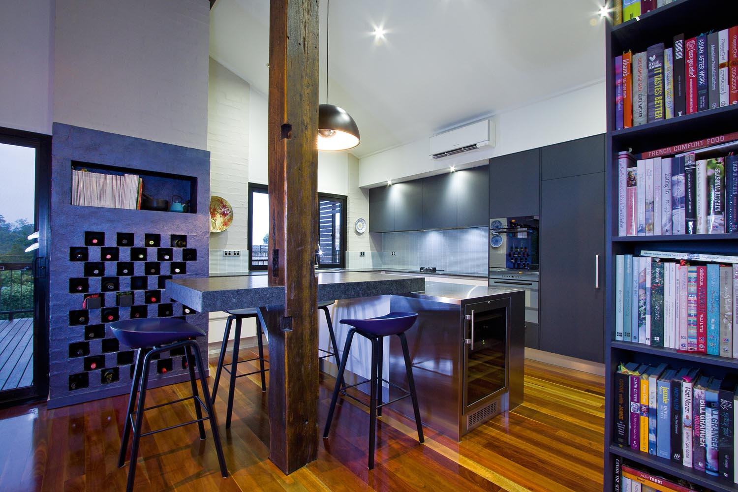Brushed granite, stainless steel and Laminex finishes have been chosen to complement the existing wine brick wall, so the kitchen flows effortlessly into the large central living area.