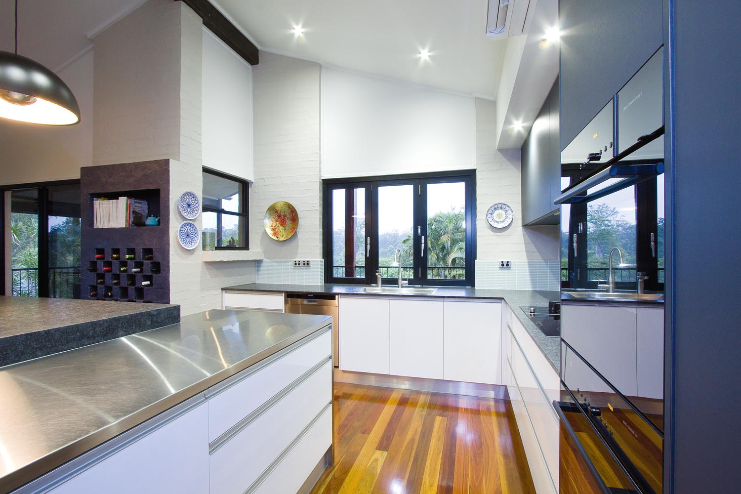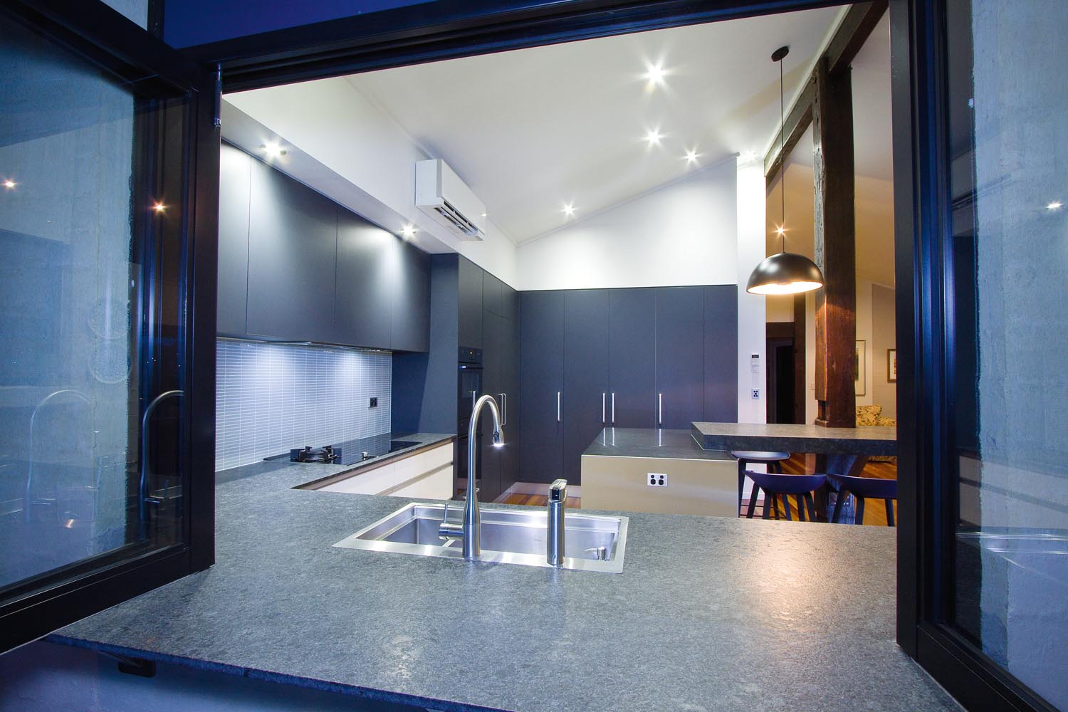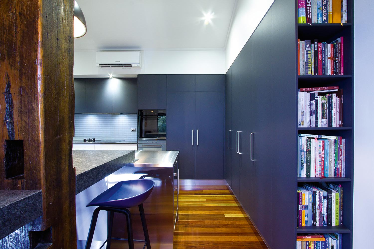 Brushed granite, stainless steel and Laminex finishes have been chosen to complement the existing wine brick wall, so the kitchen flows effortlessly into the large central living area.