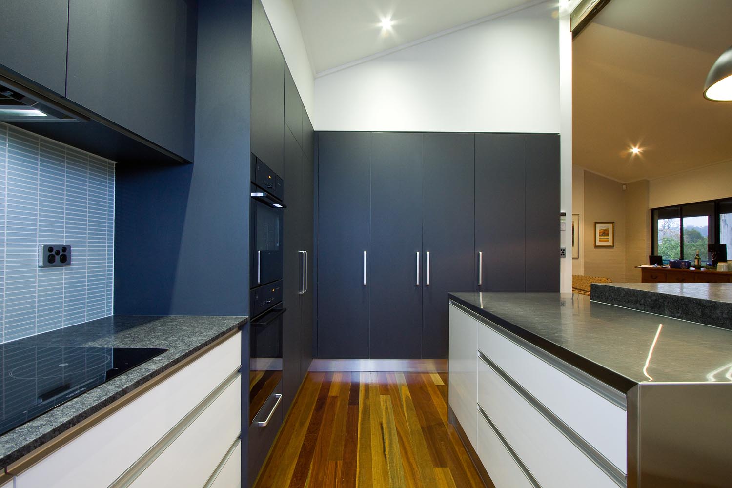 A restrained palette of charcoal and white lets the texture and quality of the materials stand out, while the handle-free design infuses it with the sleek, modern feel the client wanted.