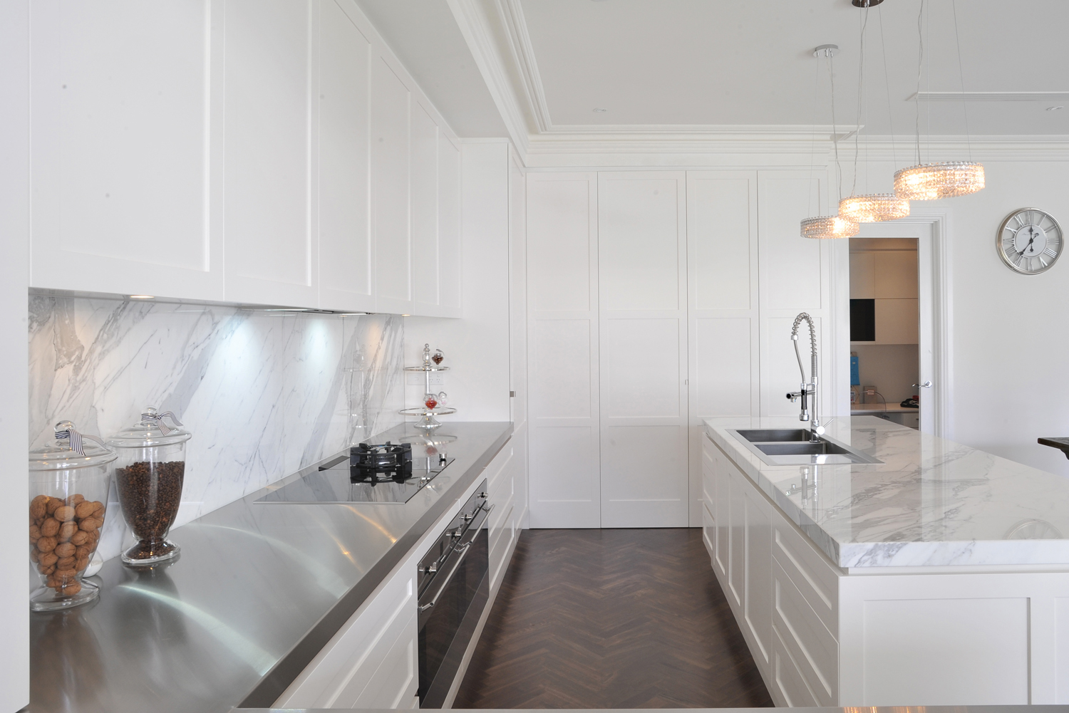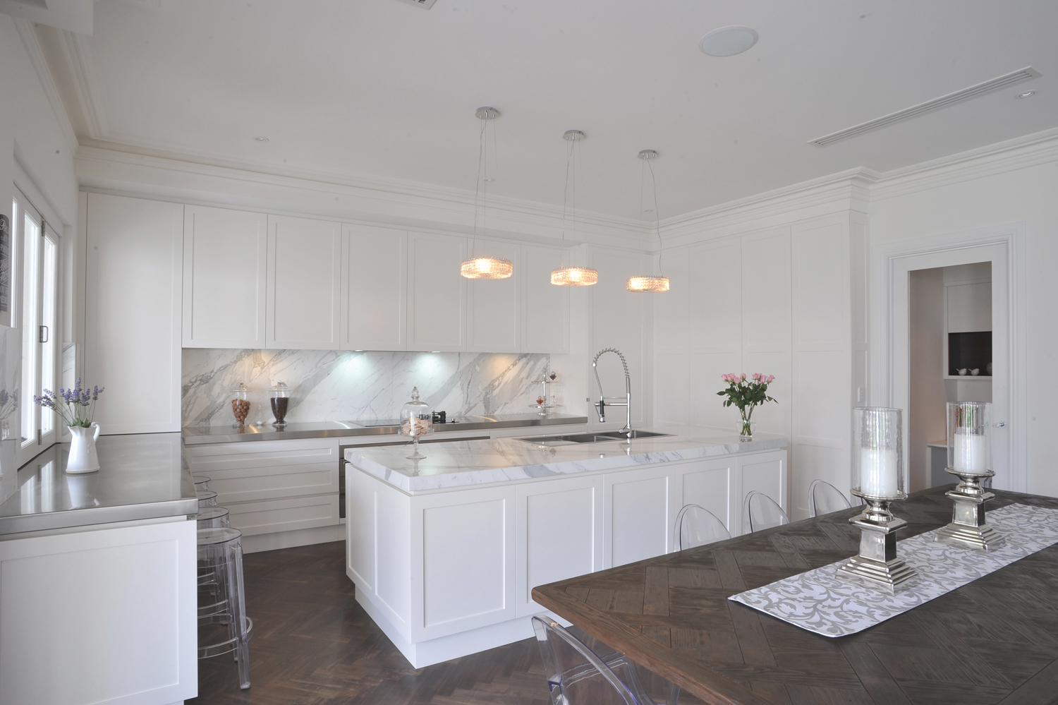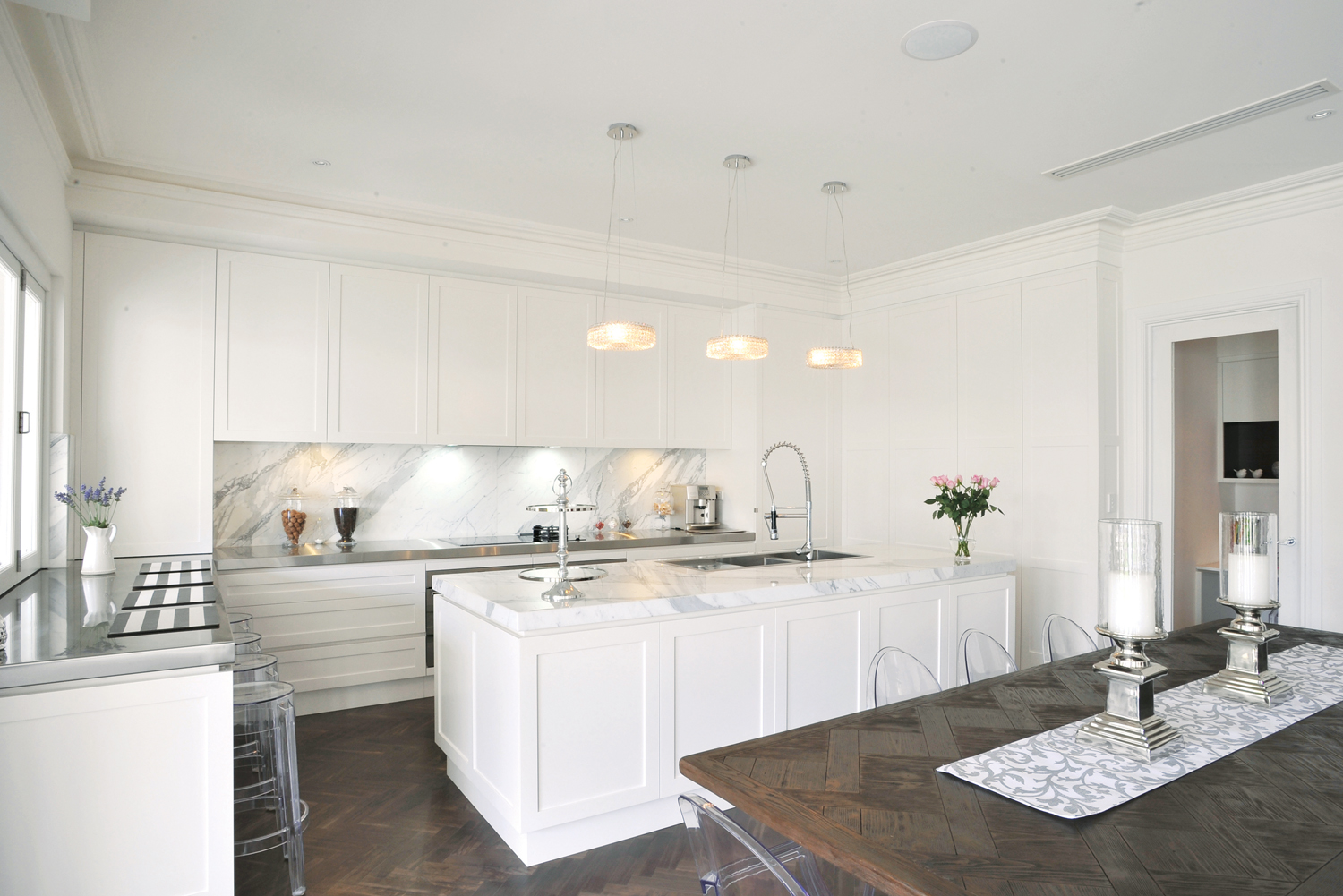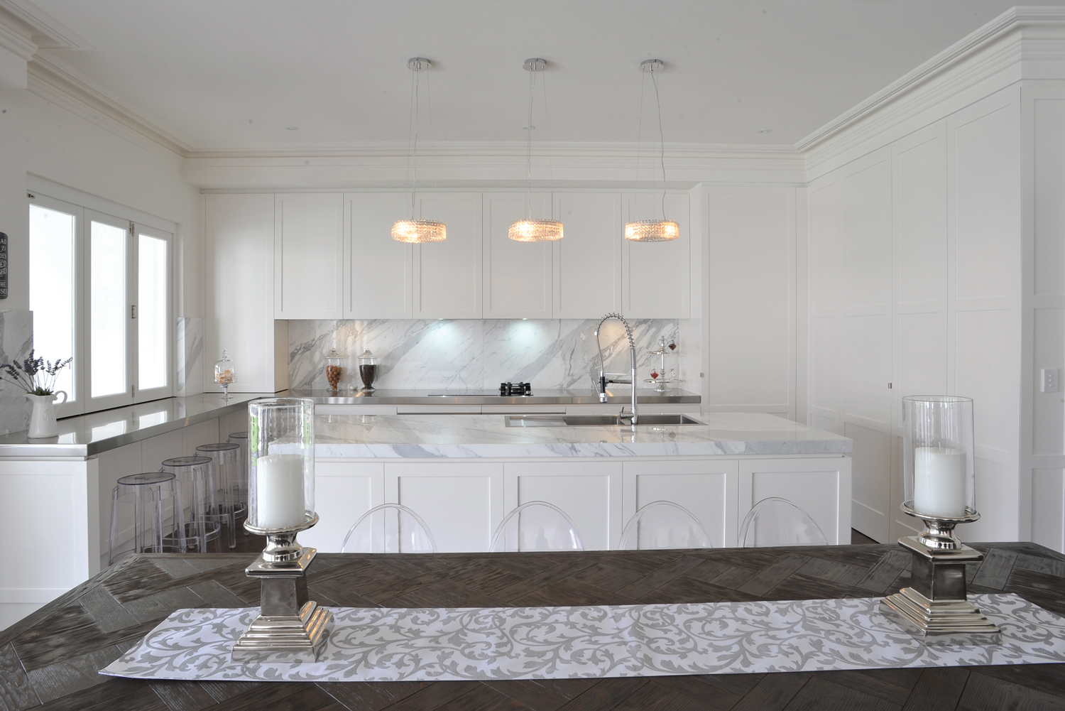 With timeless sophistication, this kitchen is a pure vision of traditionalism combined with contemporary influences. Containing finger-pull handles, the cabinets display the simplicity of its appearance and illuminate the textural features of the marble benchtop.