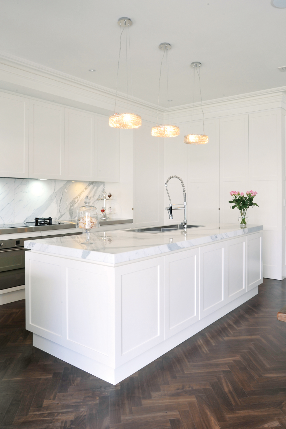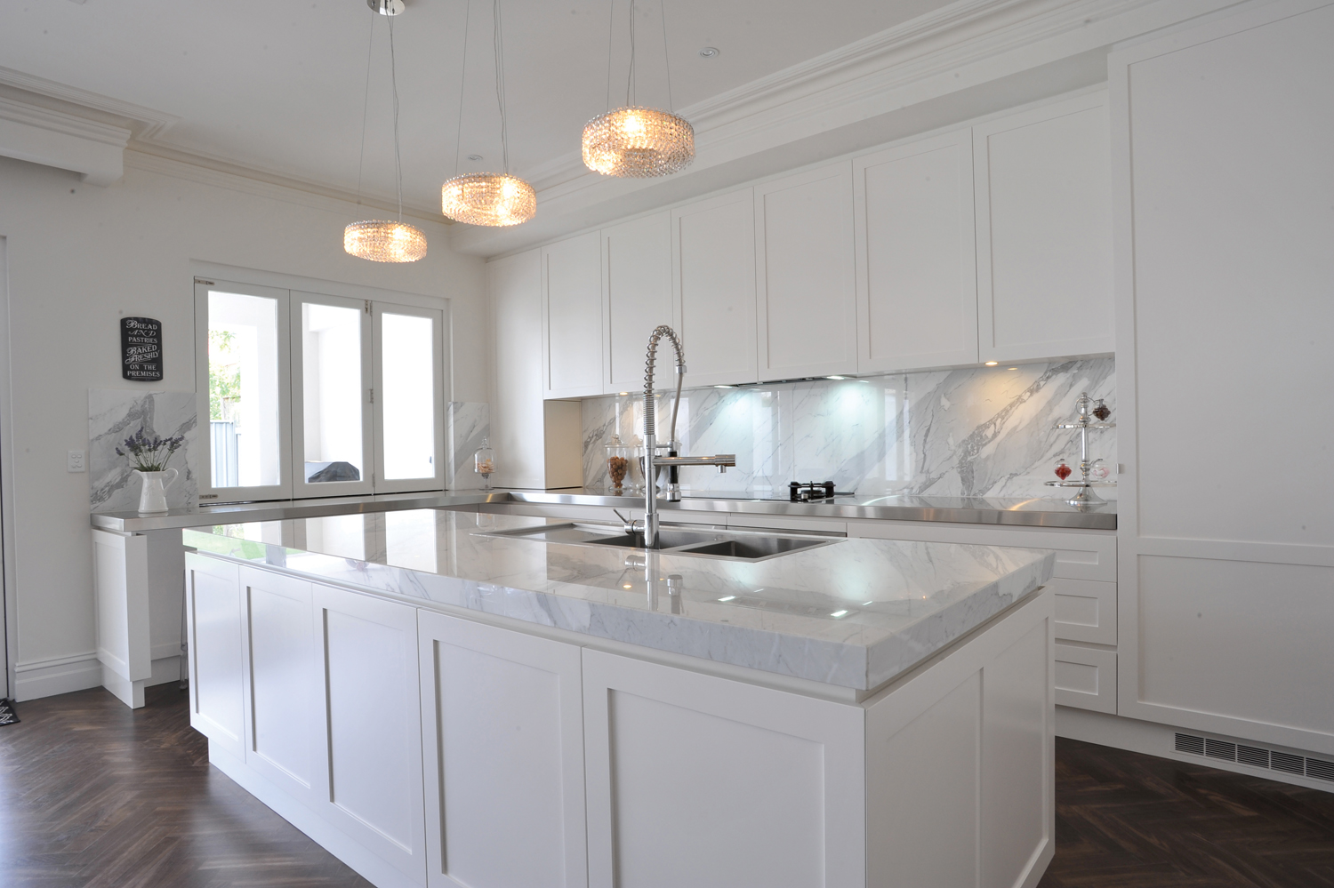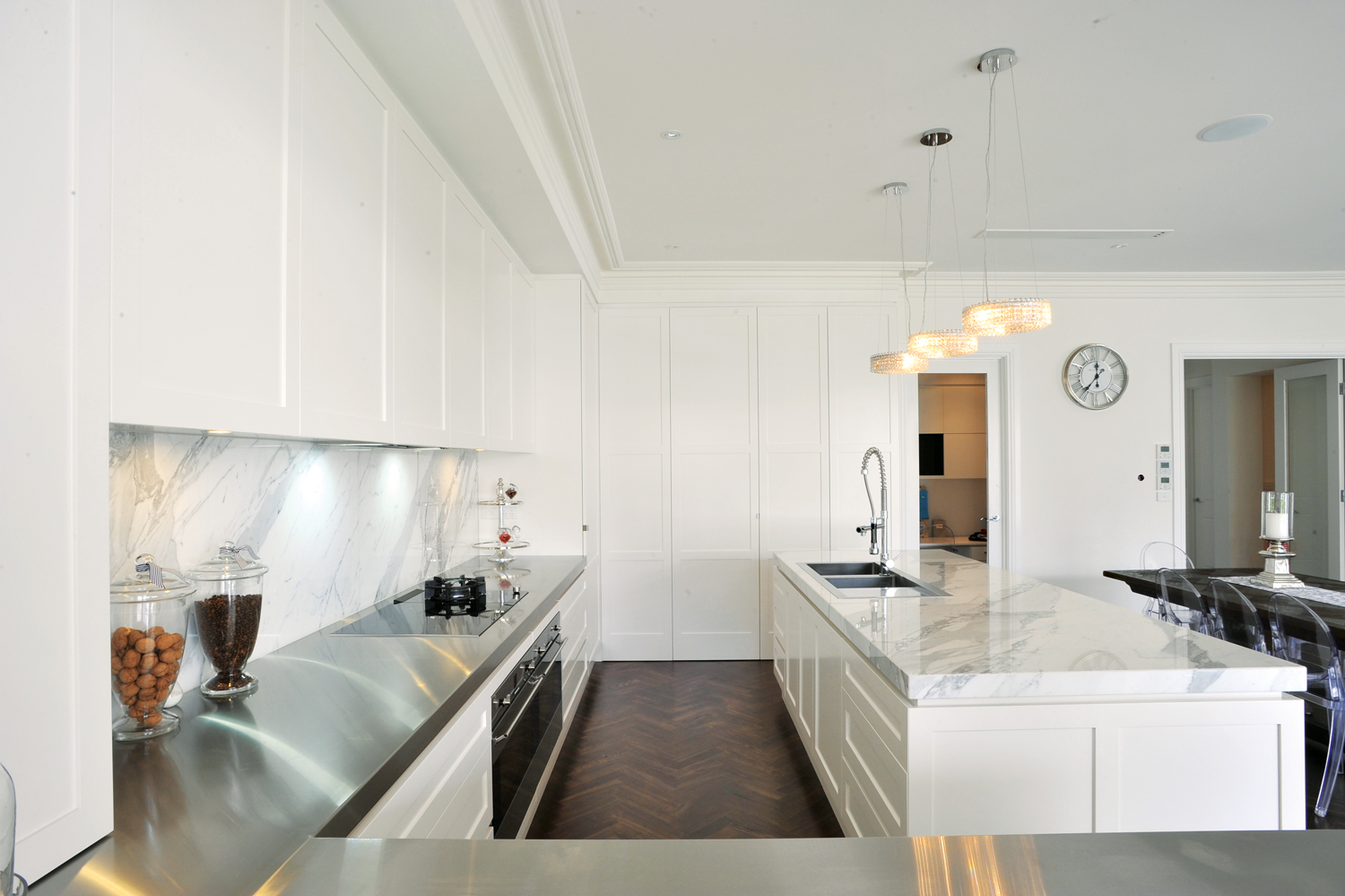 With timeless sophistication, this kitchen is a pure vision of traditionalism combined with contemporary influences. Containing finger-pull handles, the cabinets display the simplicity of its appearance and illuminate the textural features of the marble benchtop.