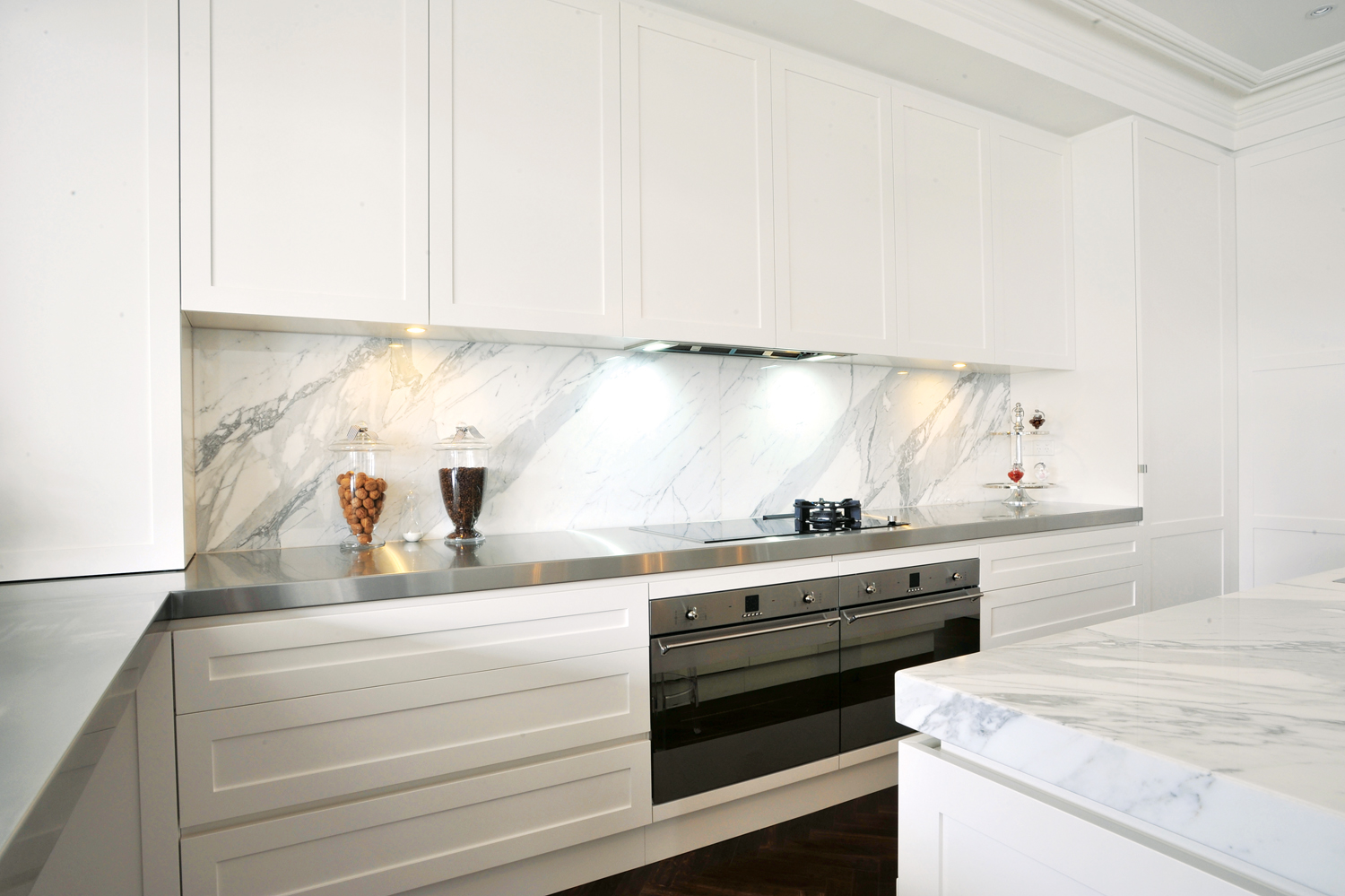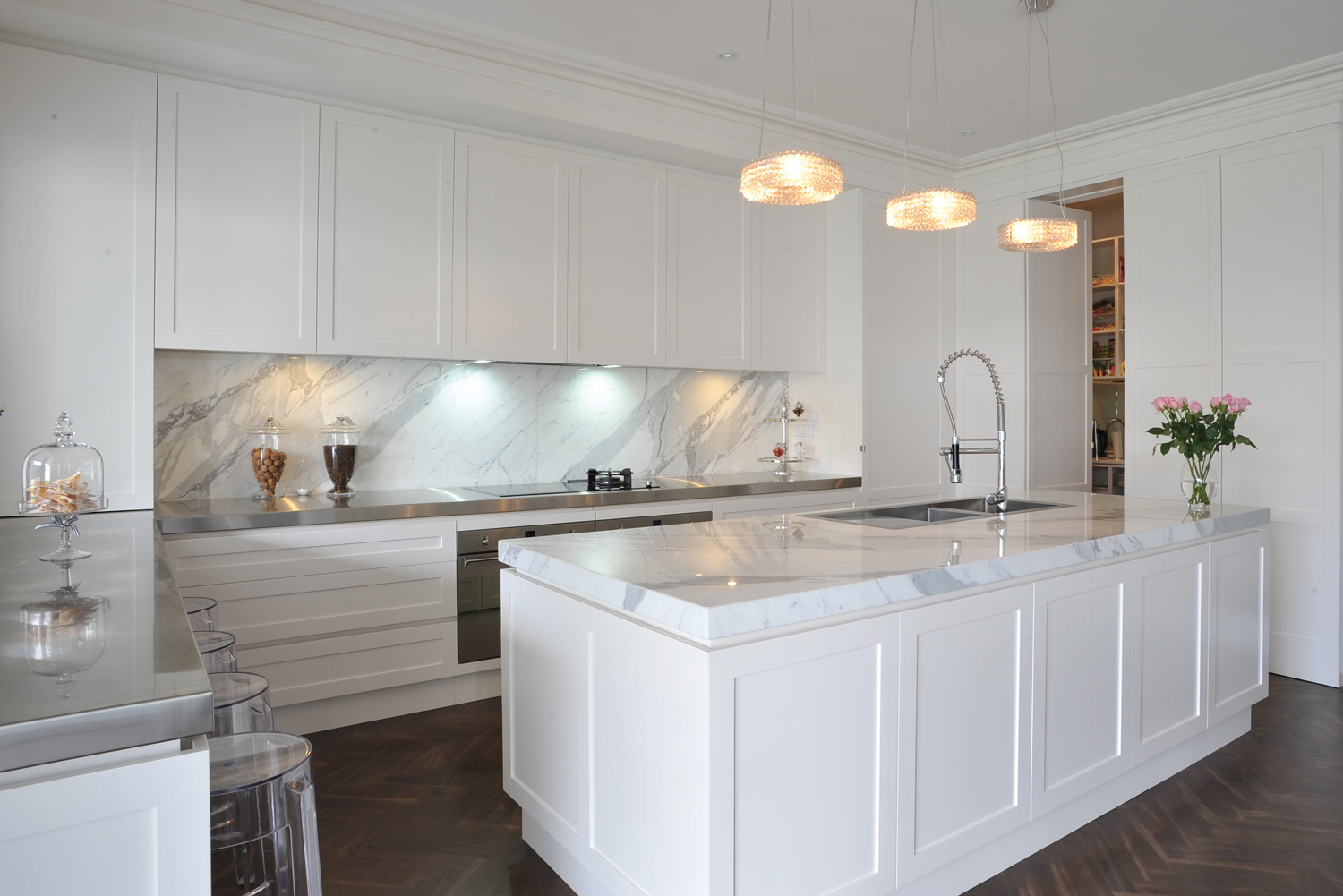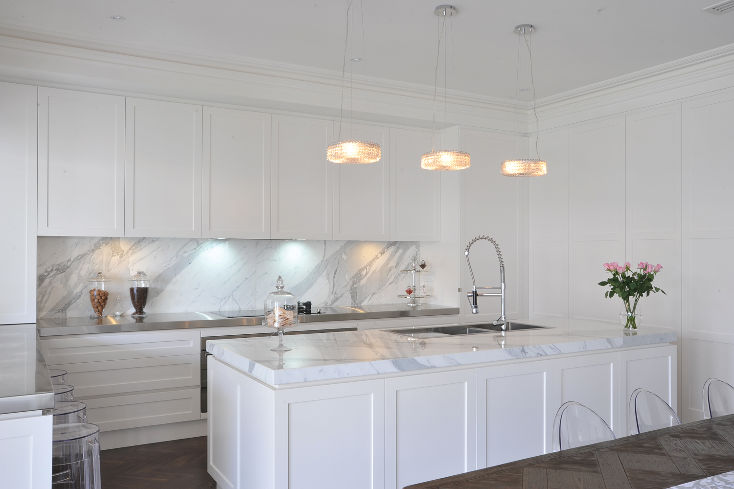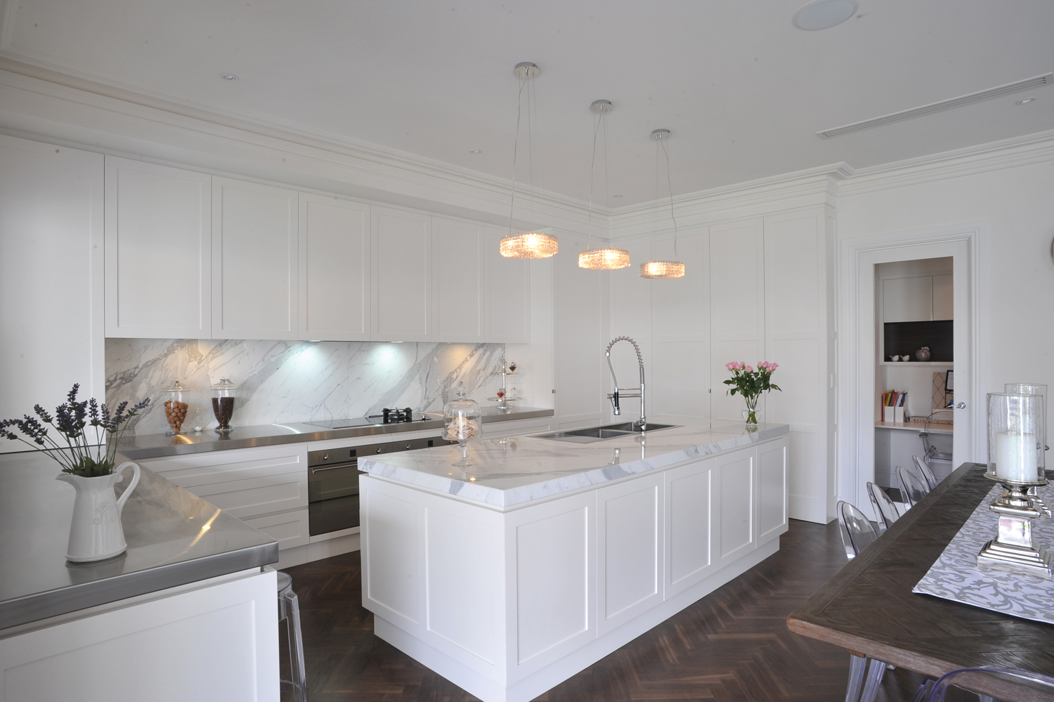 With timeless sophistication, this kitchen is a pure vision of traditionalism combined with contemporary influences. Containing finger-pull handles, the cabinets display the simplicity of its appearance and illuminate the textural features of the marble benchtop.