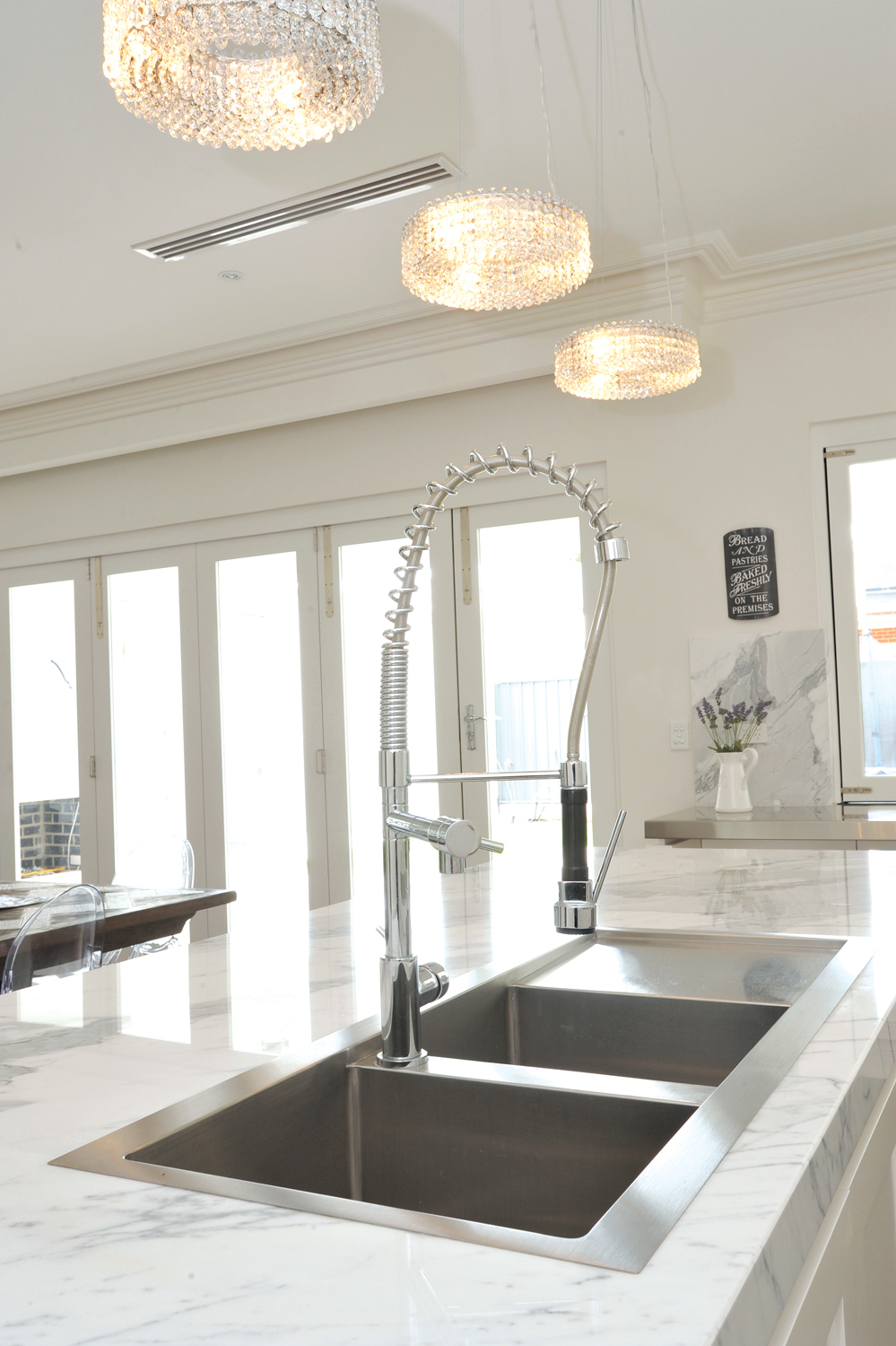 The concept of space is inviting as the owner’s concealed pantry door opens to reveal a preparation sink, bench and fridge to create an entertainment-friendly but intimate kitchen.